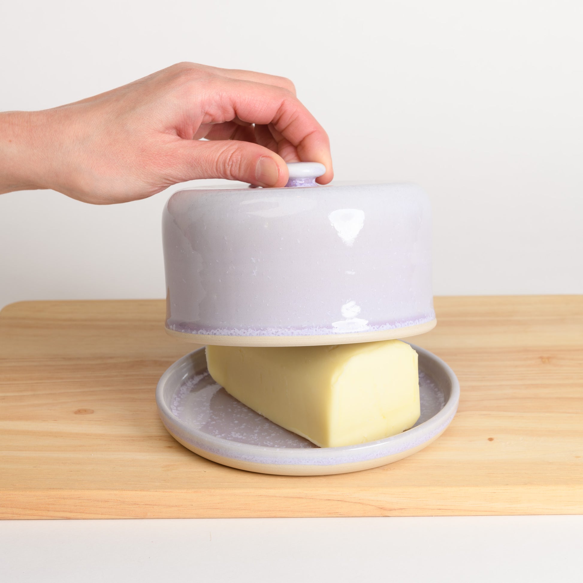 Glazed with a beautiful crystalline glaze, each butter keeper has a unique pattern of crystals over a lilac background. No two are ever the same!