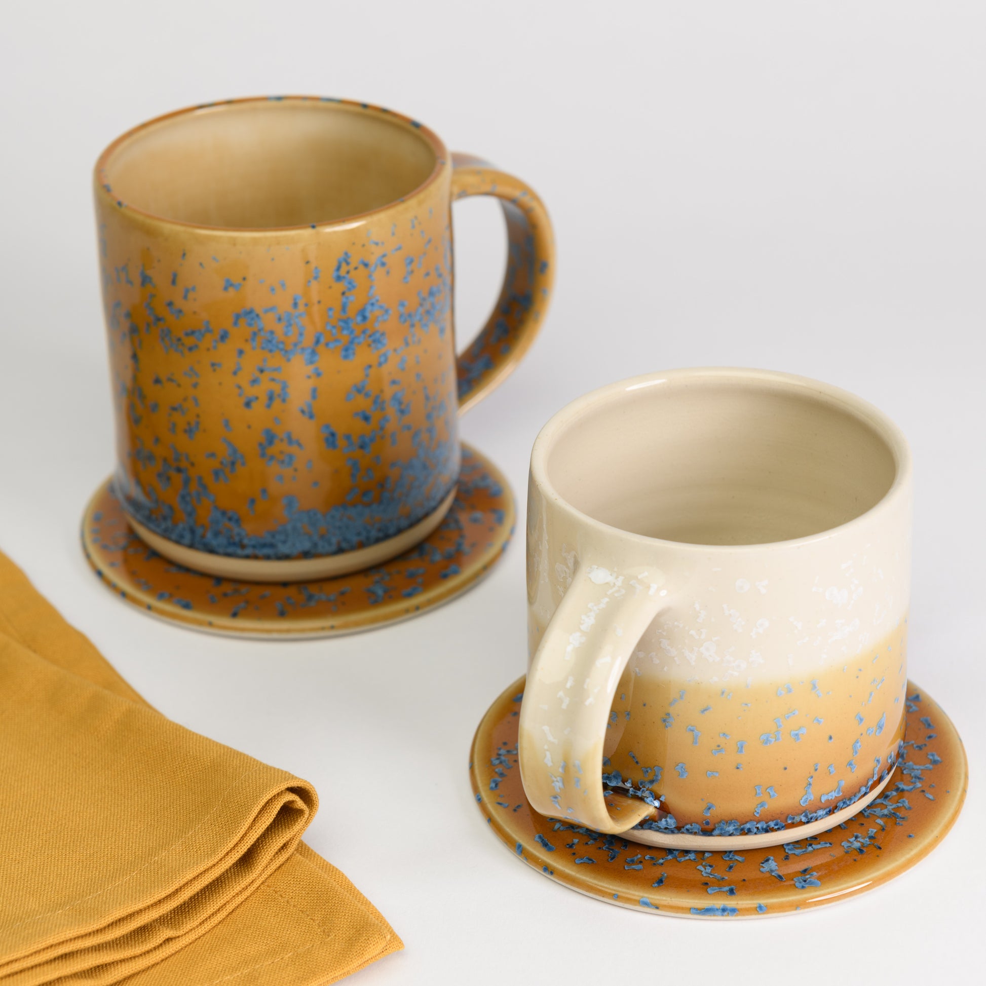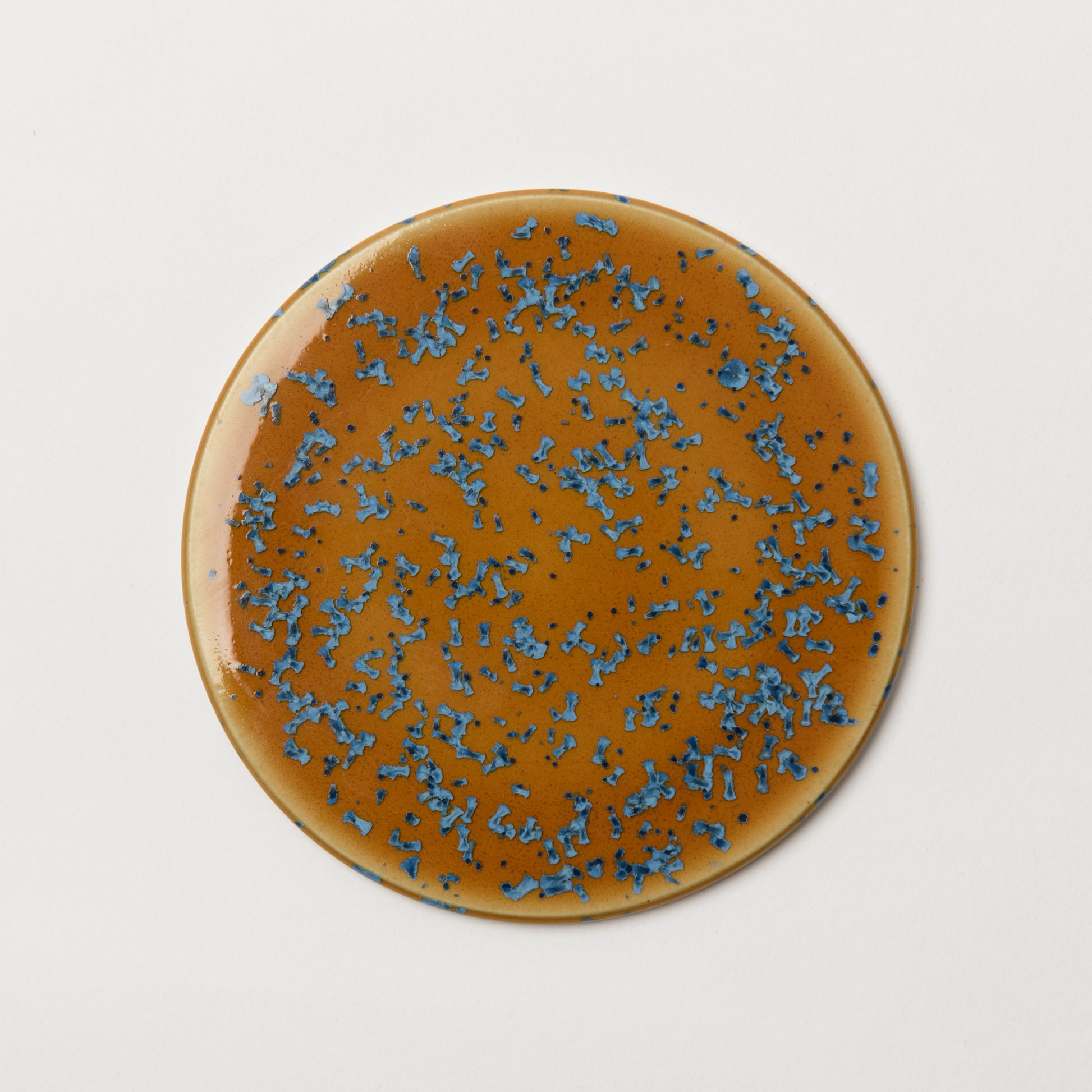 Glazed with a beautiful crystalline glaze, each coaster has a unique pattern of blue crystals over an amber background. No two are ever the same!