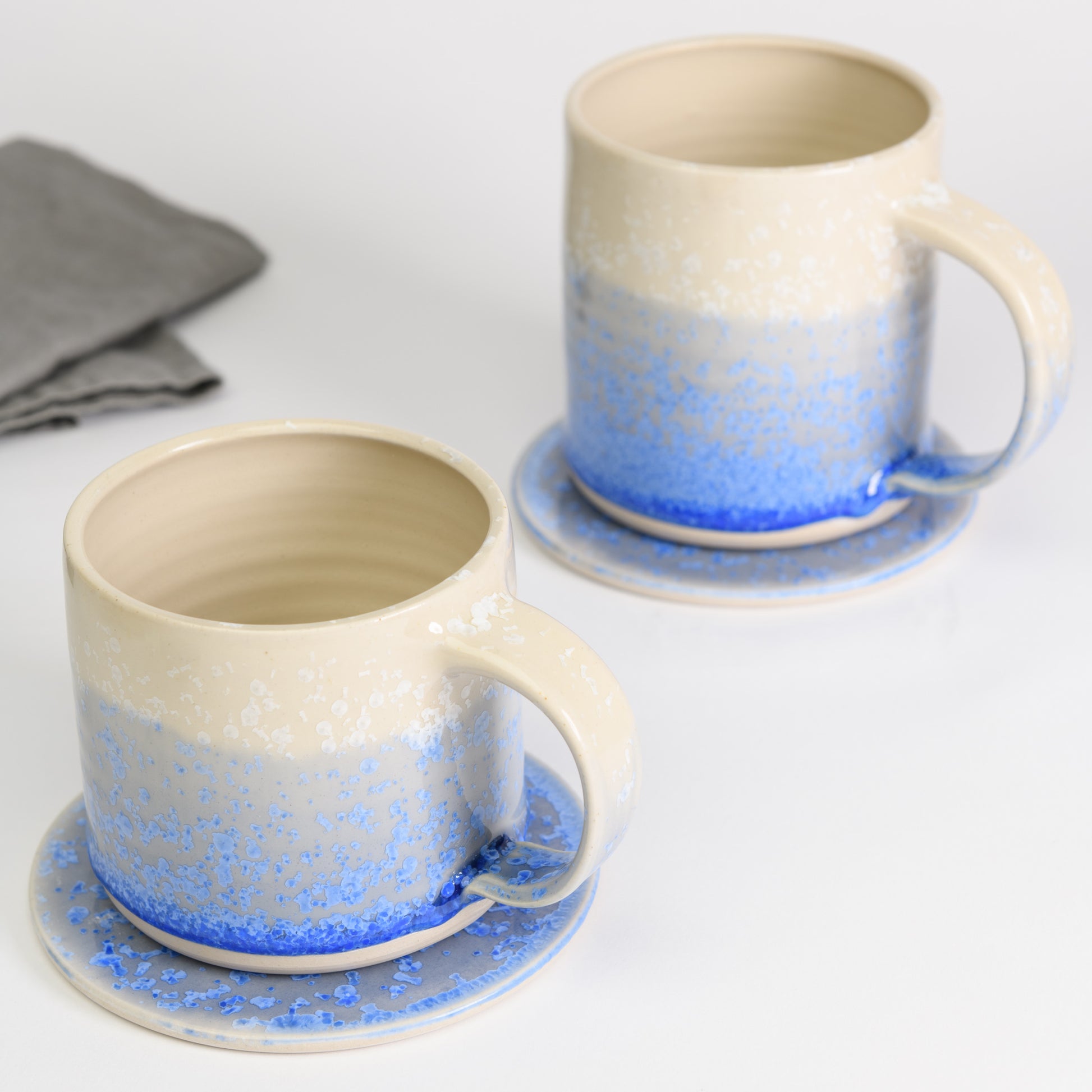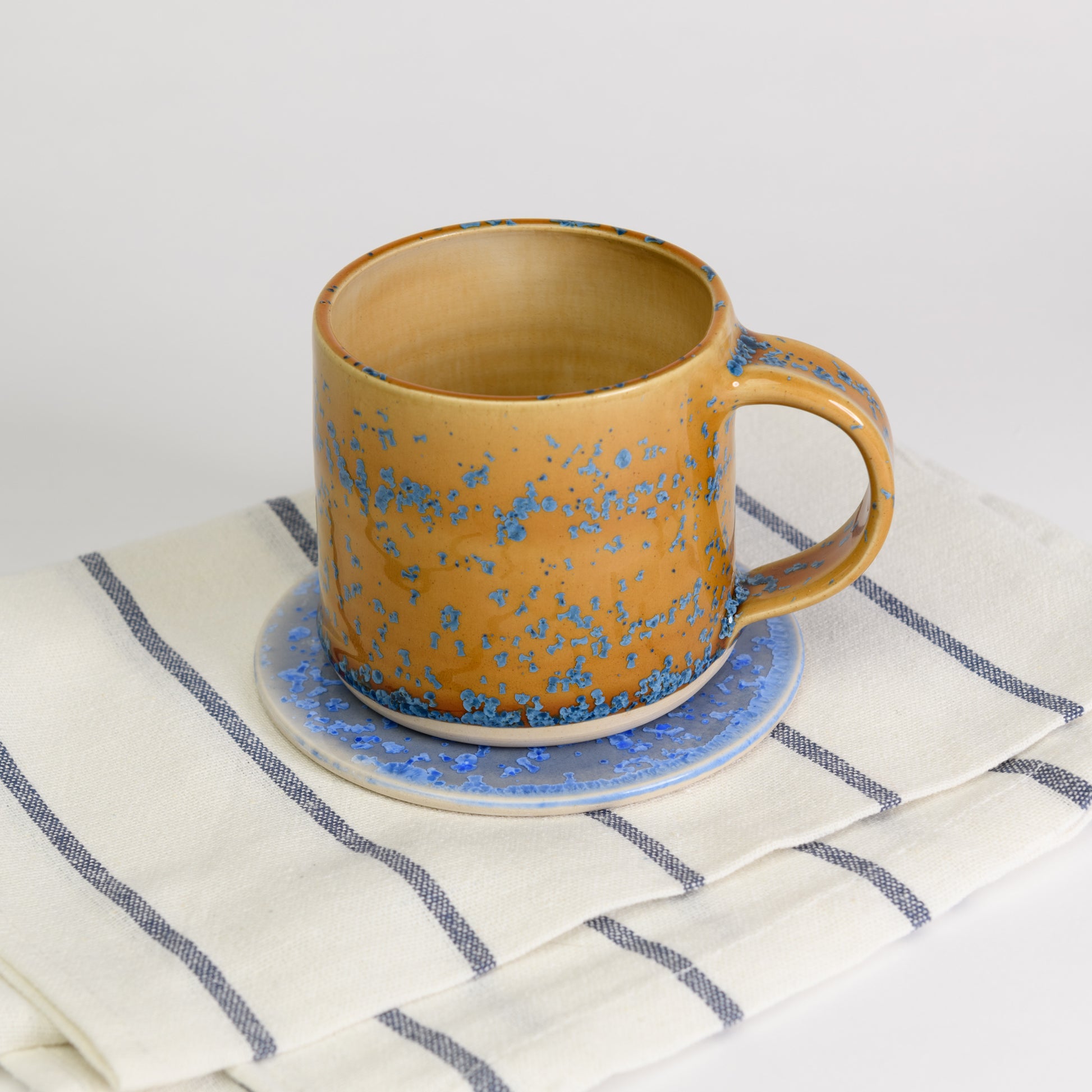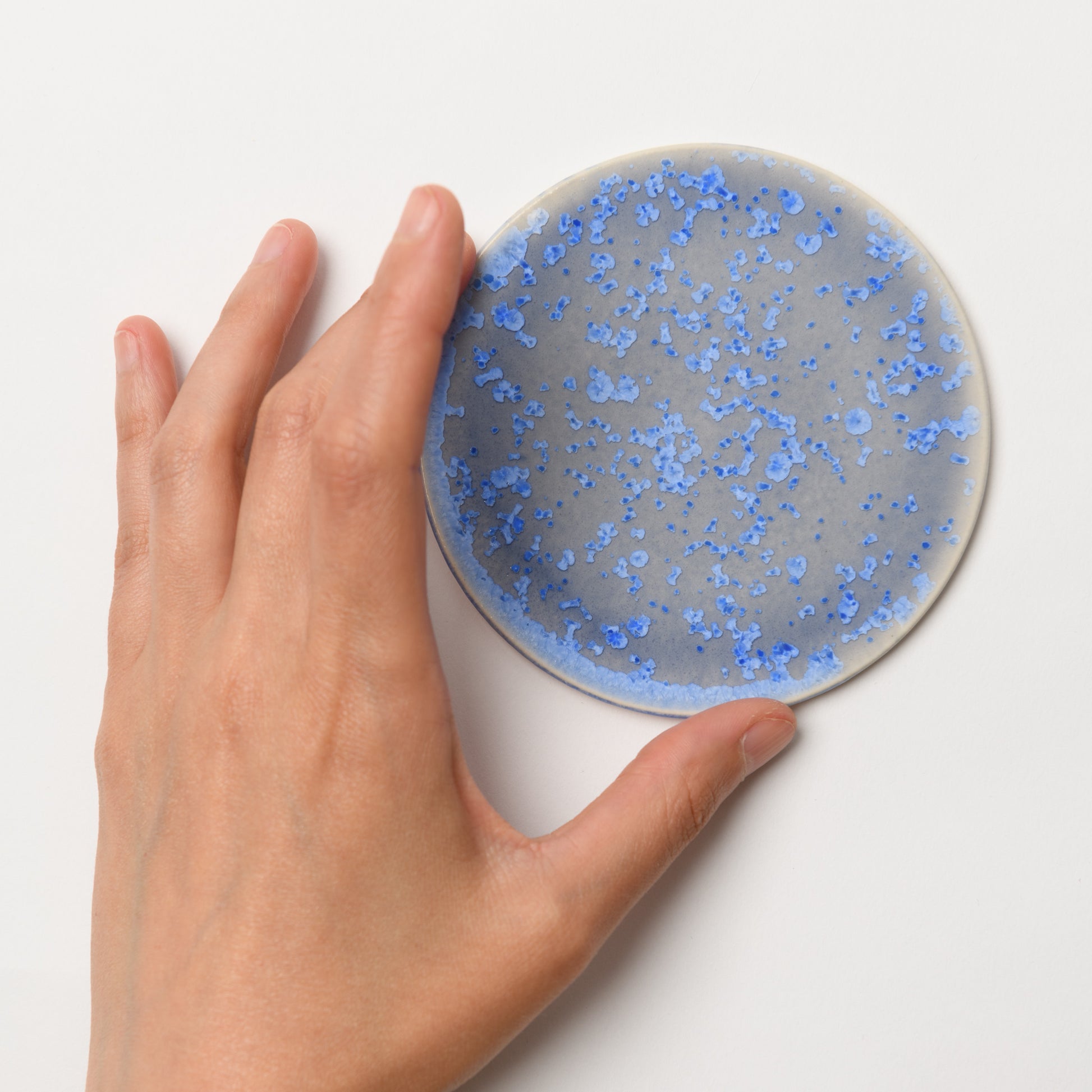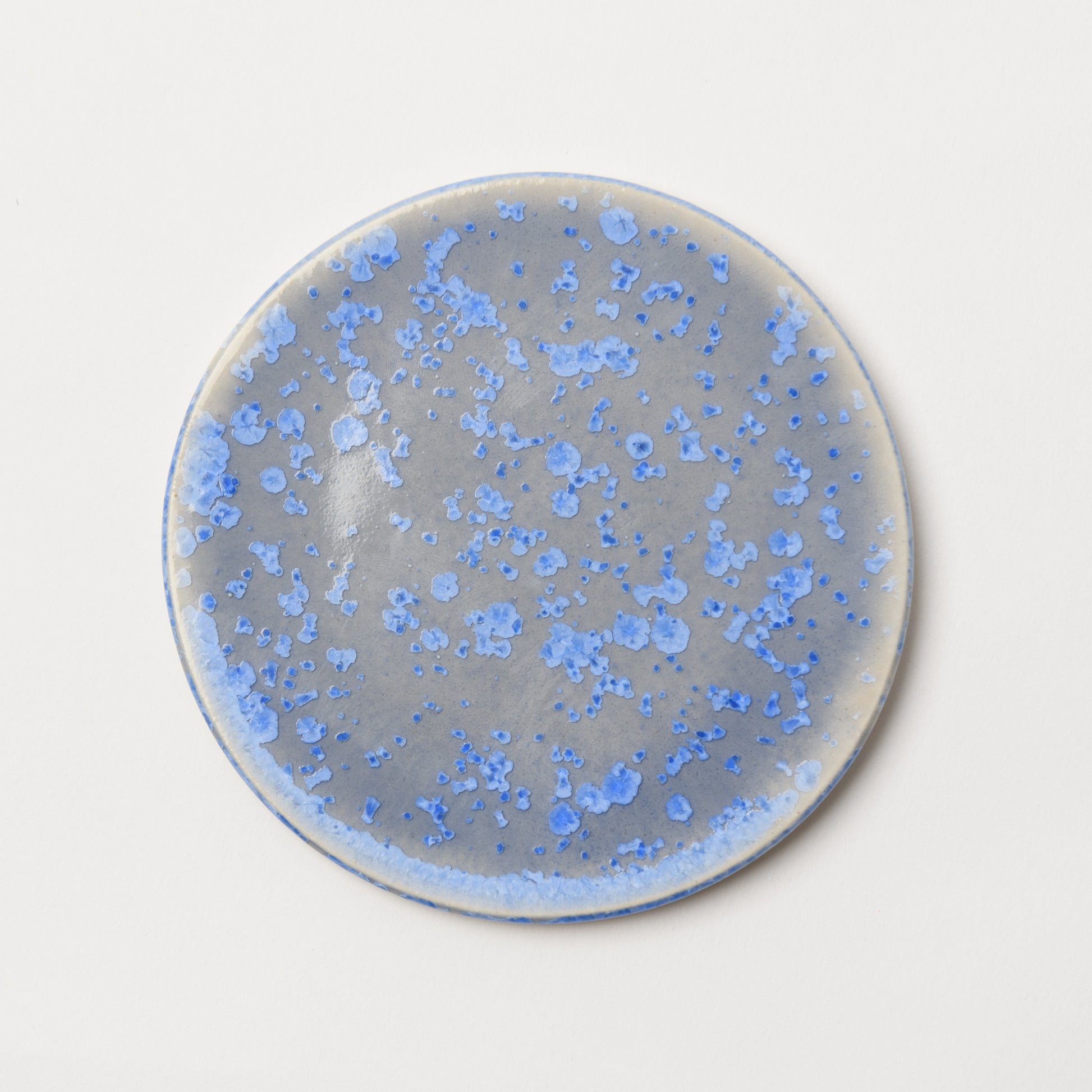 Glazed with a beautiful crystalline glaze, each coaster has a unique pattern of crystals over a blue background. No two are ever the same!