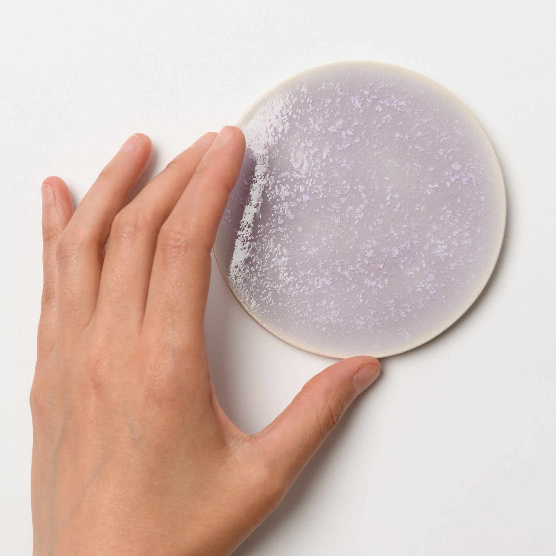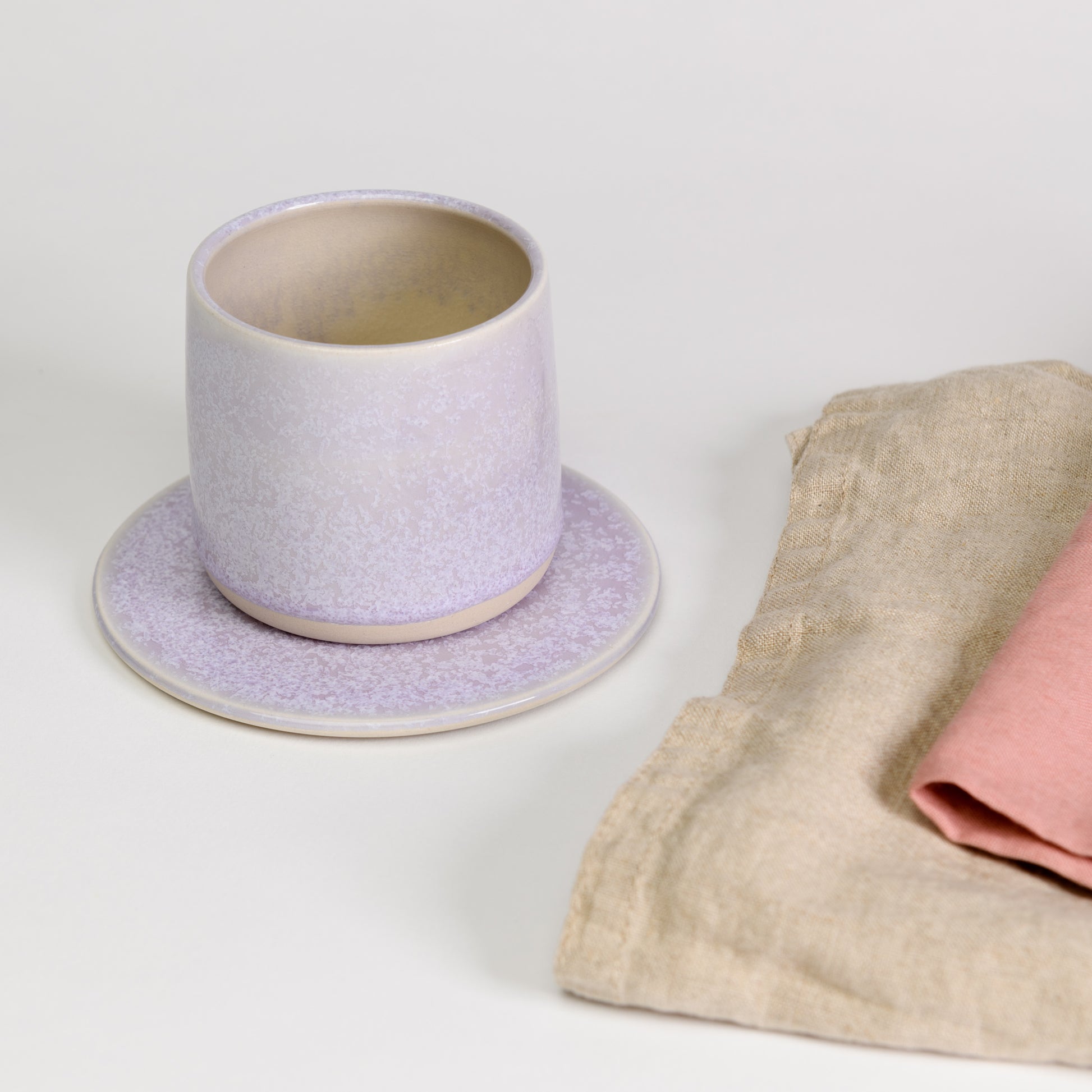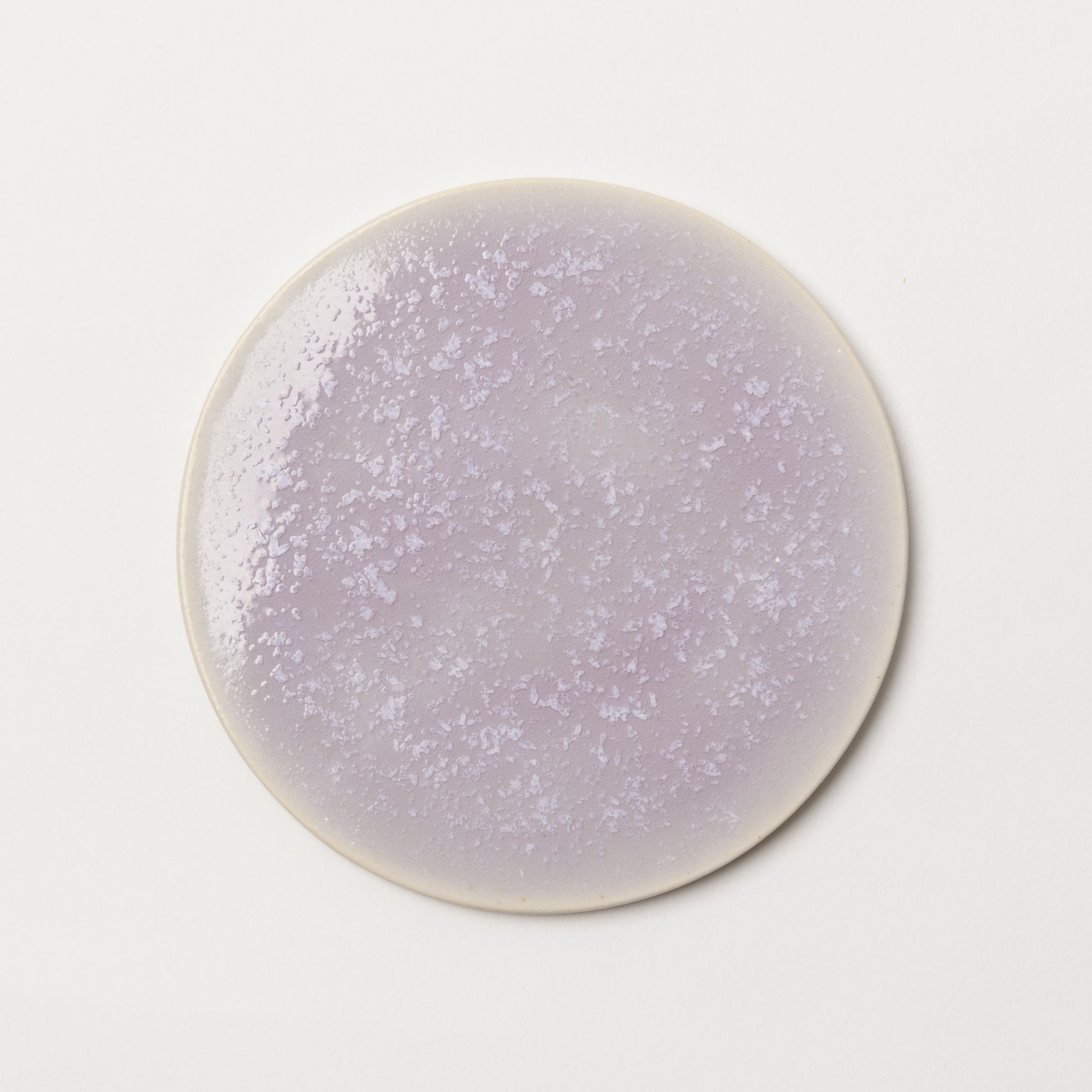 Glazed with a beautiful crystalline glaze, each coaster has a unique pattern of crystals over a lilac background. No two are ever the same!