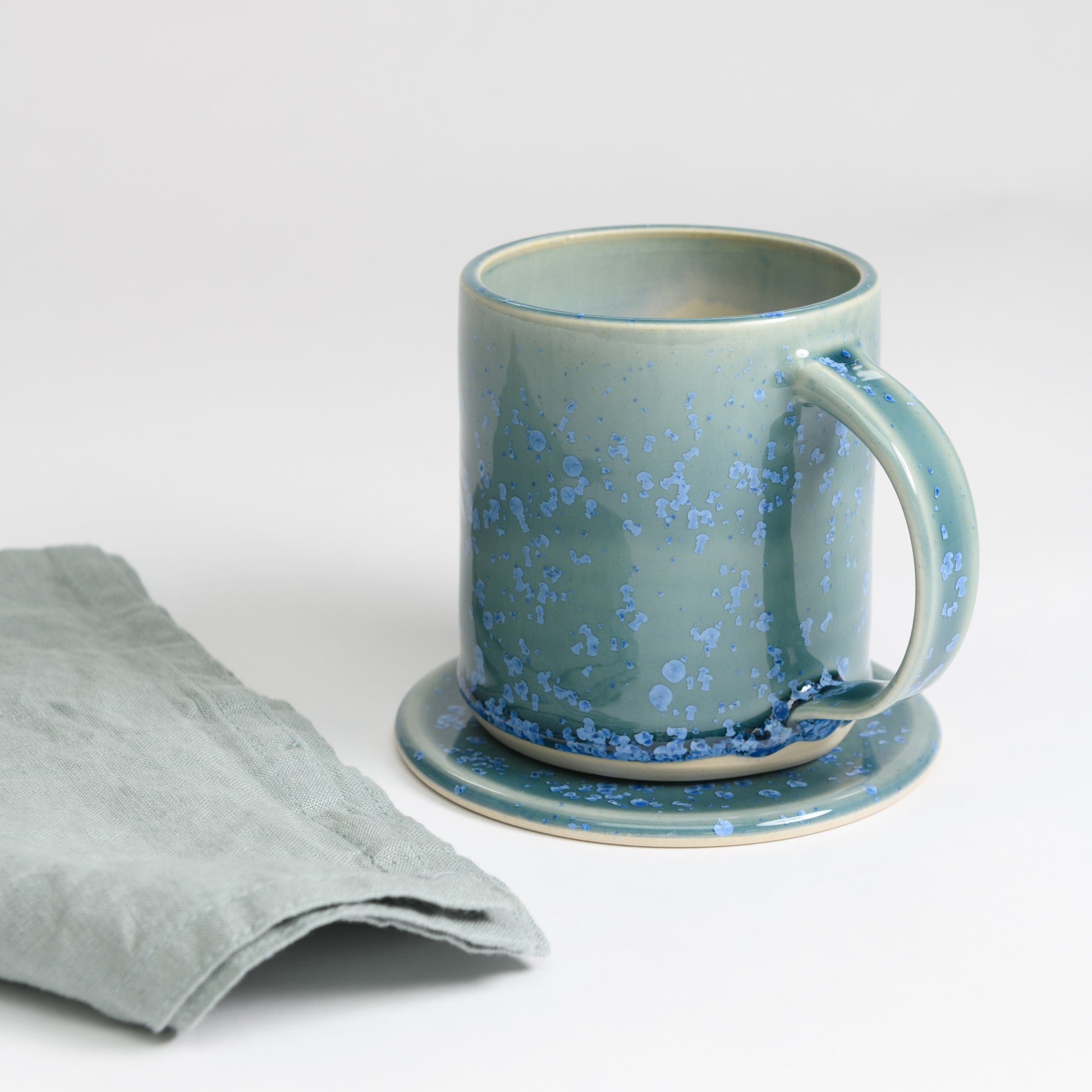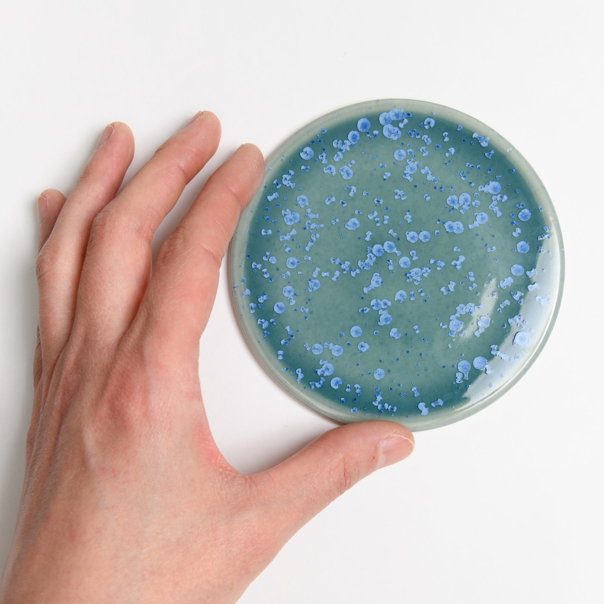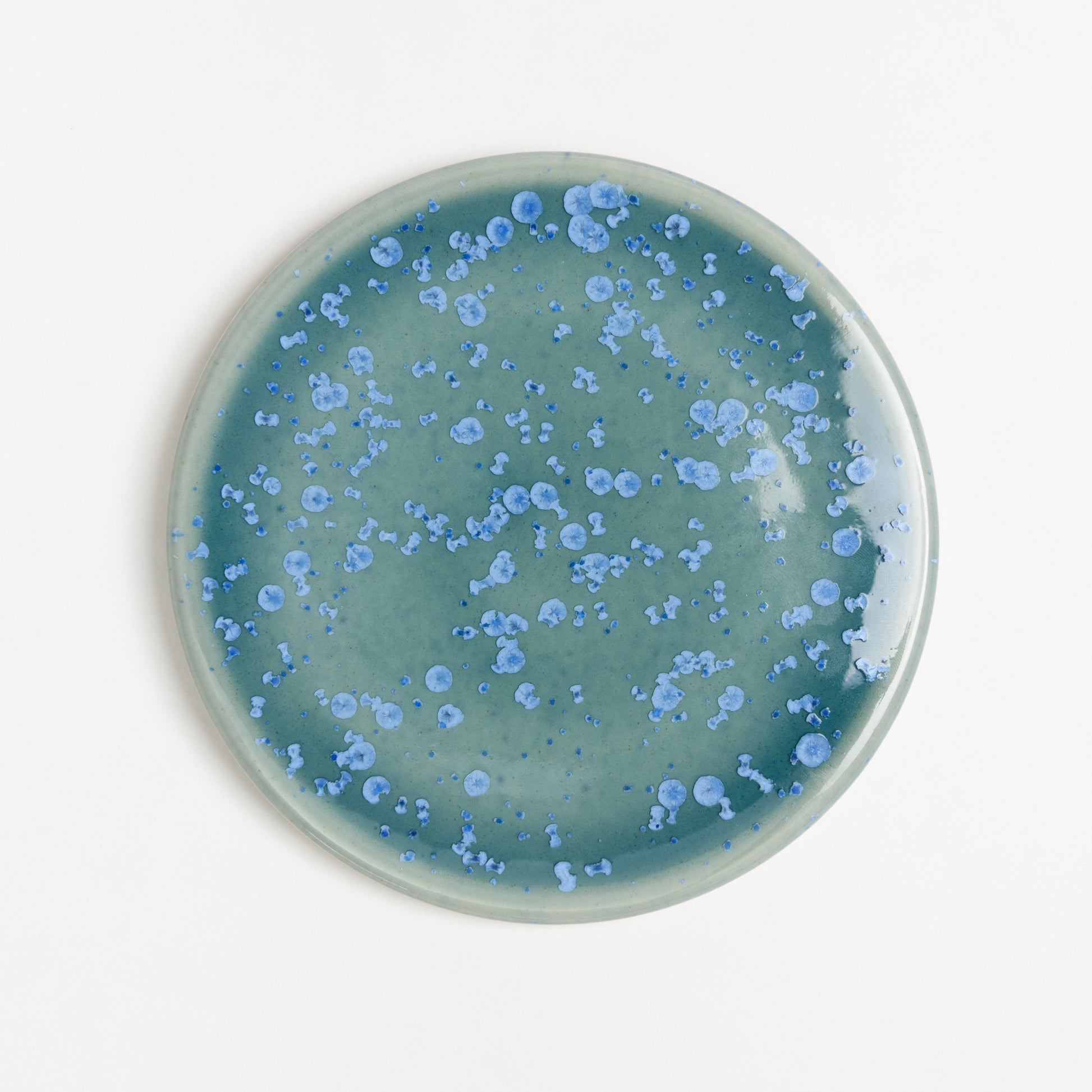 Glazed with a beautiful crystalline glaze, each coaster has a unique pattern of blue crystals over a teal background. No two are ever the same!