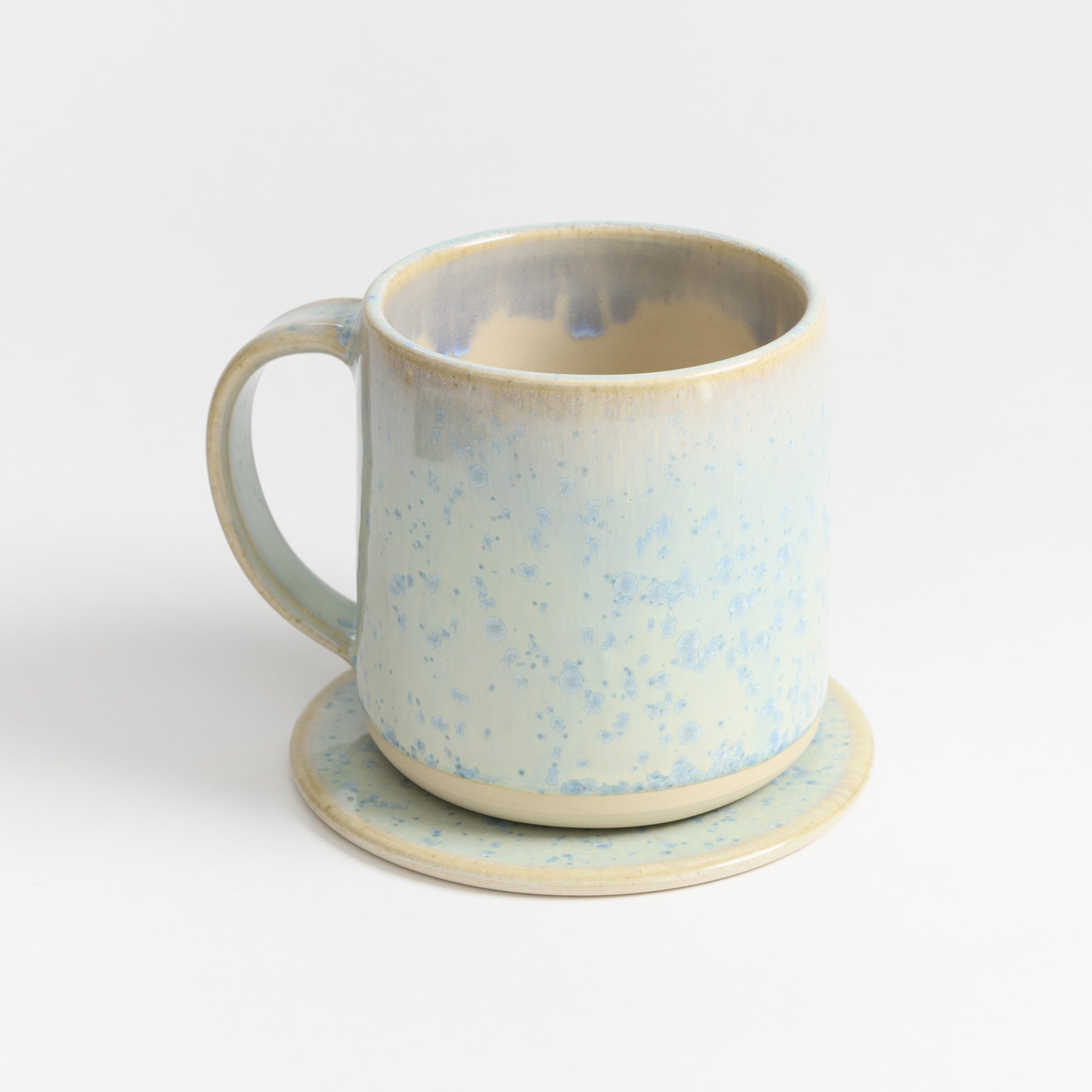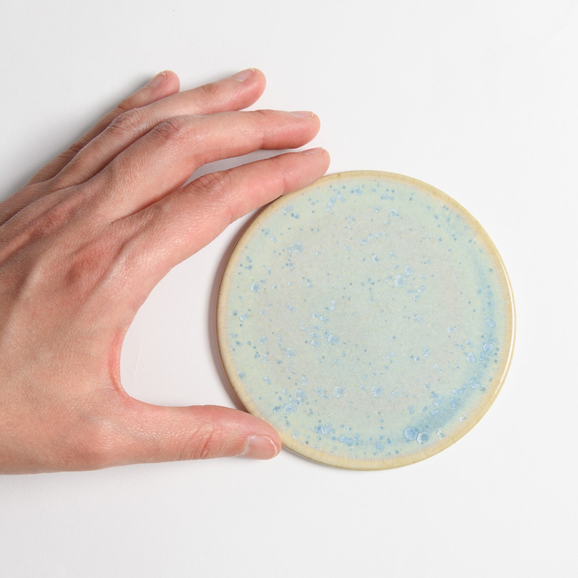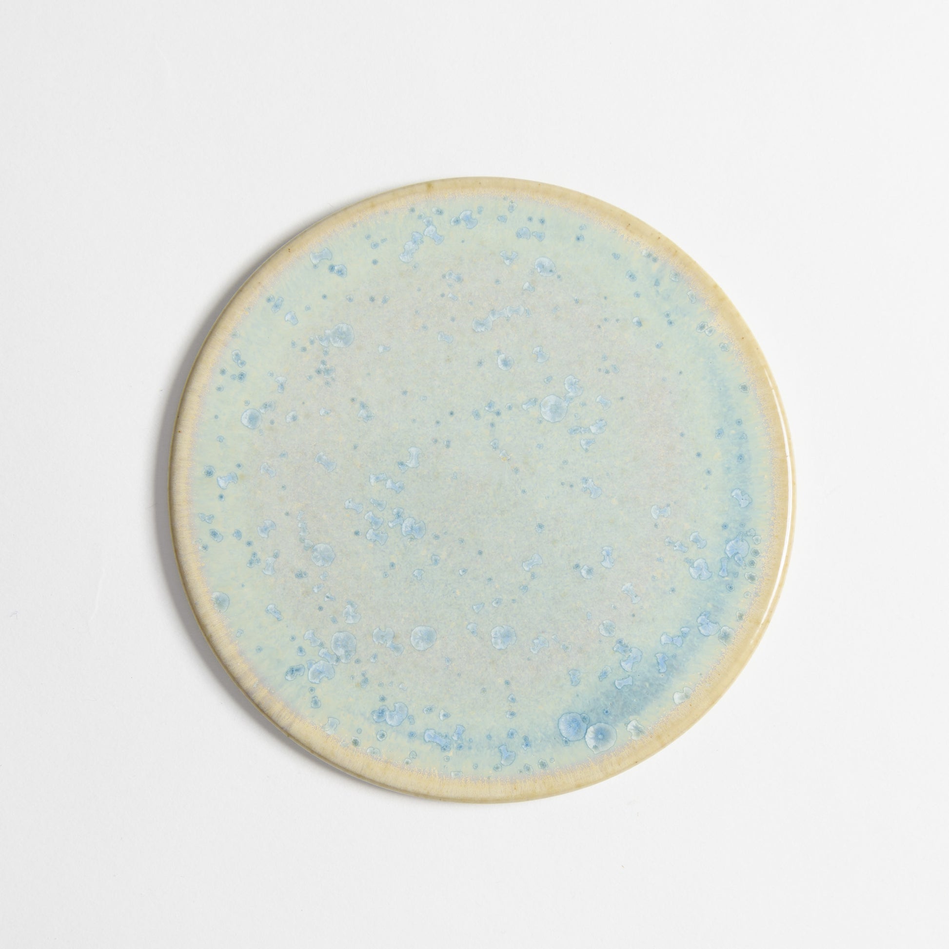 Glazed with a beautiful crystalline glaze, each coaster has a unique pattern of baby blue crystals over a multi-tonal green, blue and cream background. No two are ever the same!