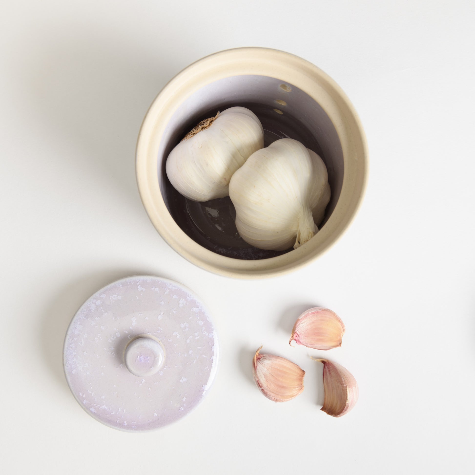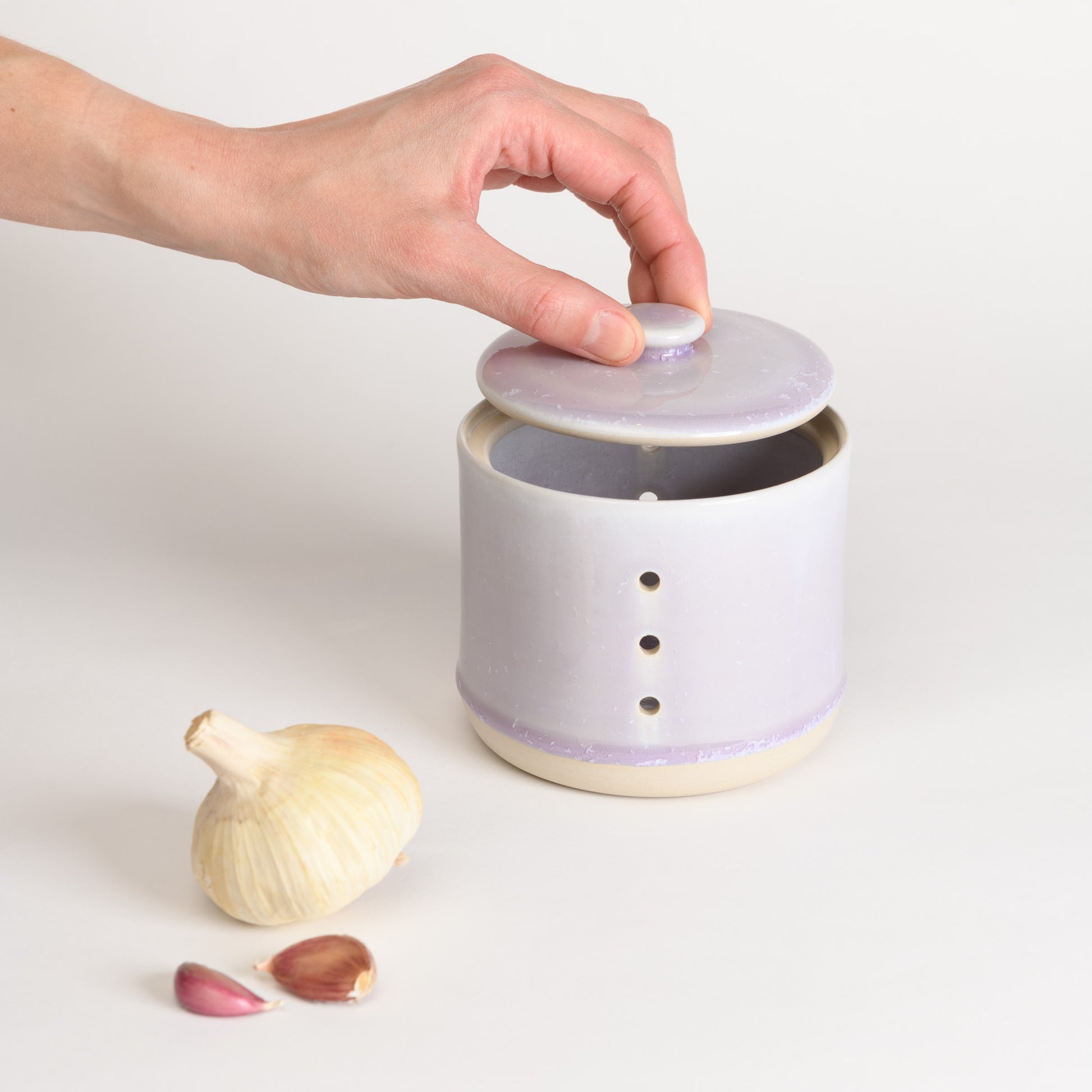 This lidded garlic keeper protects garlic from direct light, reducing the chances of sprouting.