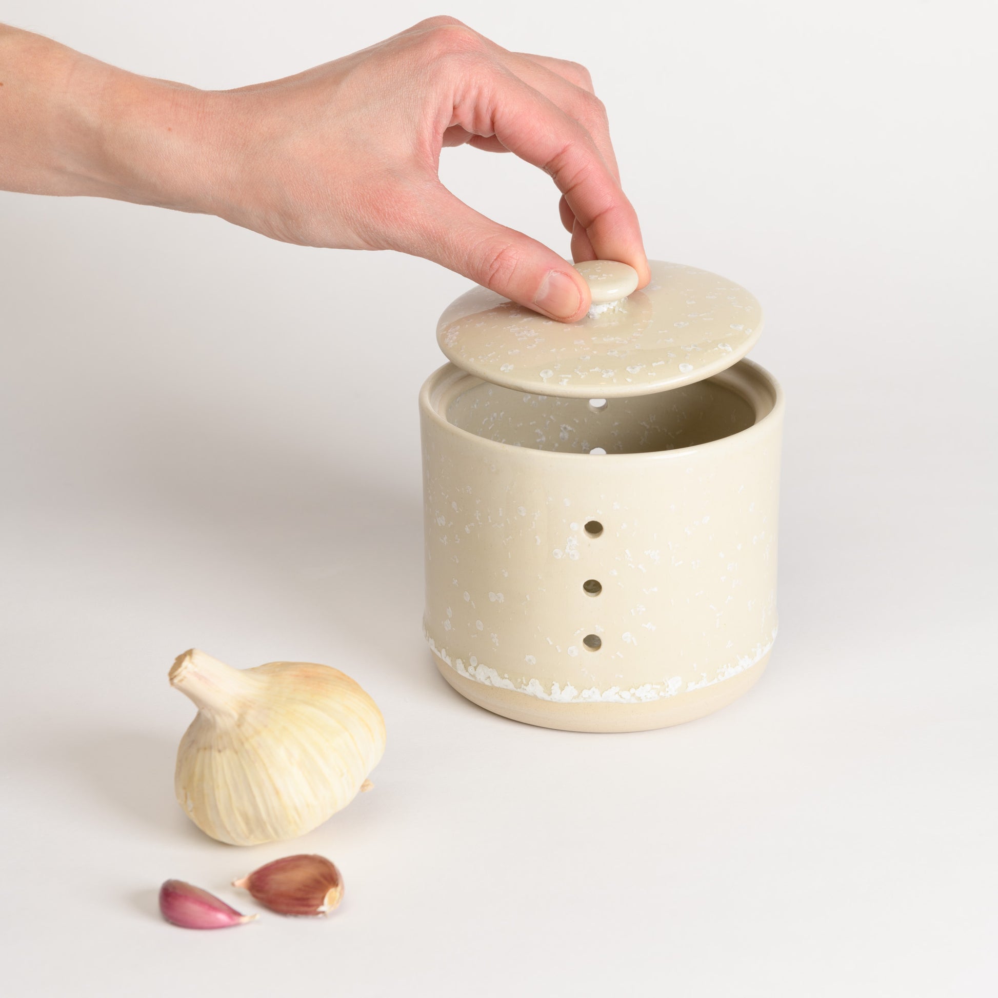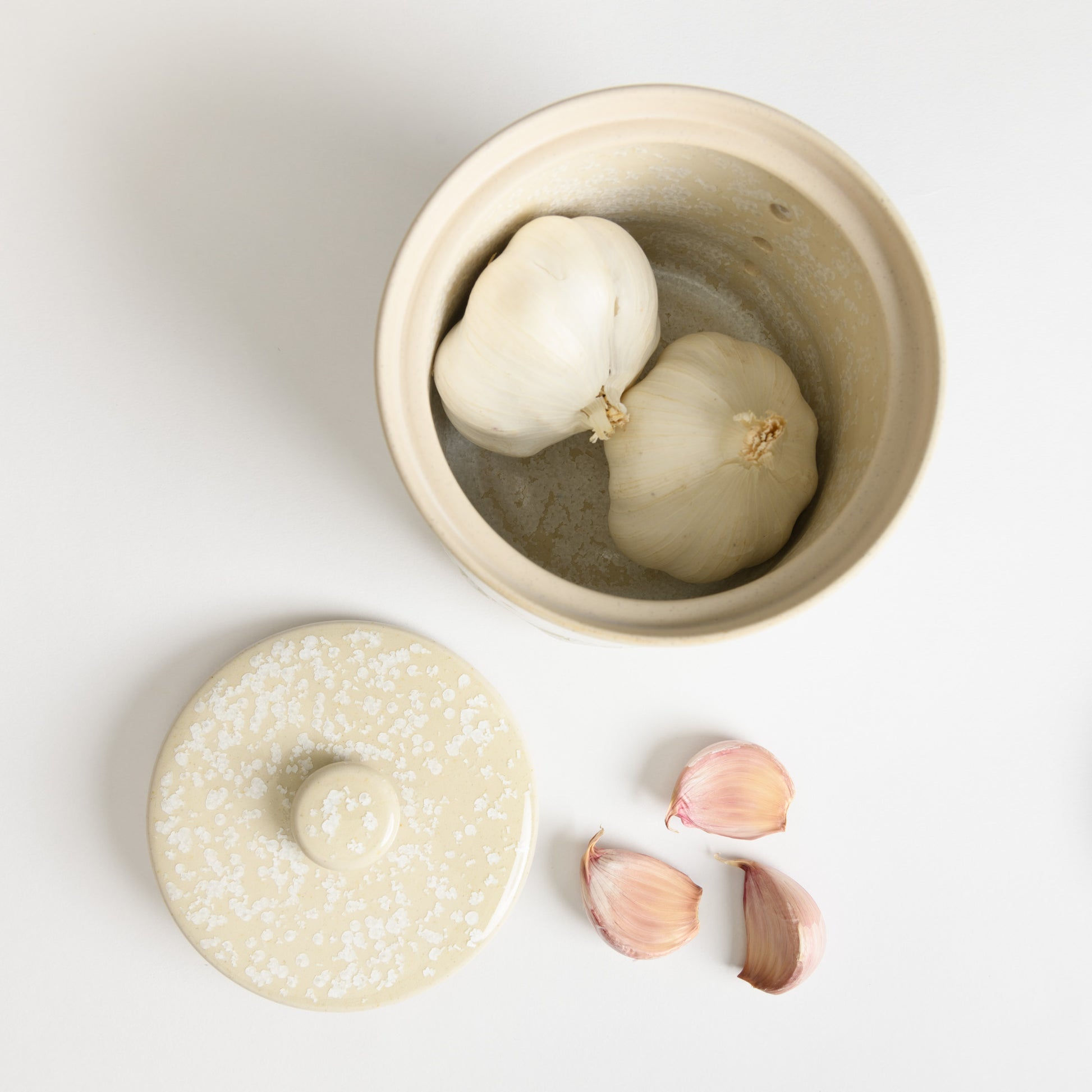 This lidded garlic keeper protects garlic from direct light, reducing the chances of sprouting.