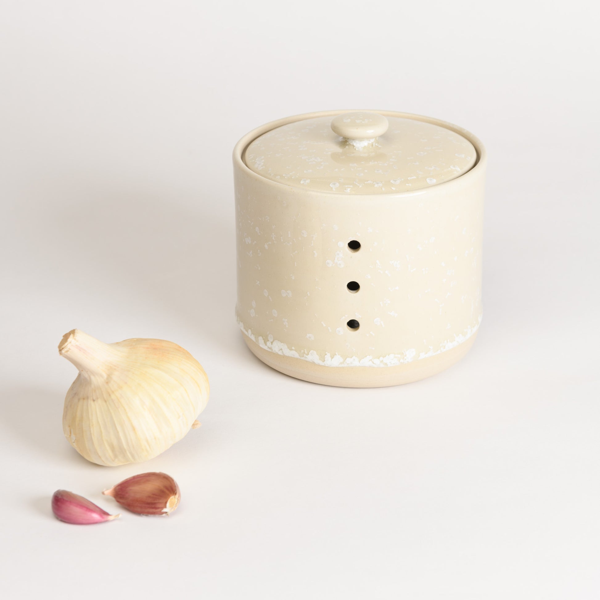 It features two sets of three holes (front and back) to allow air circulation, which slows the drying out of the garlic and keeps it fresher for longer.