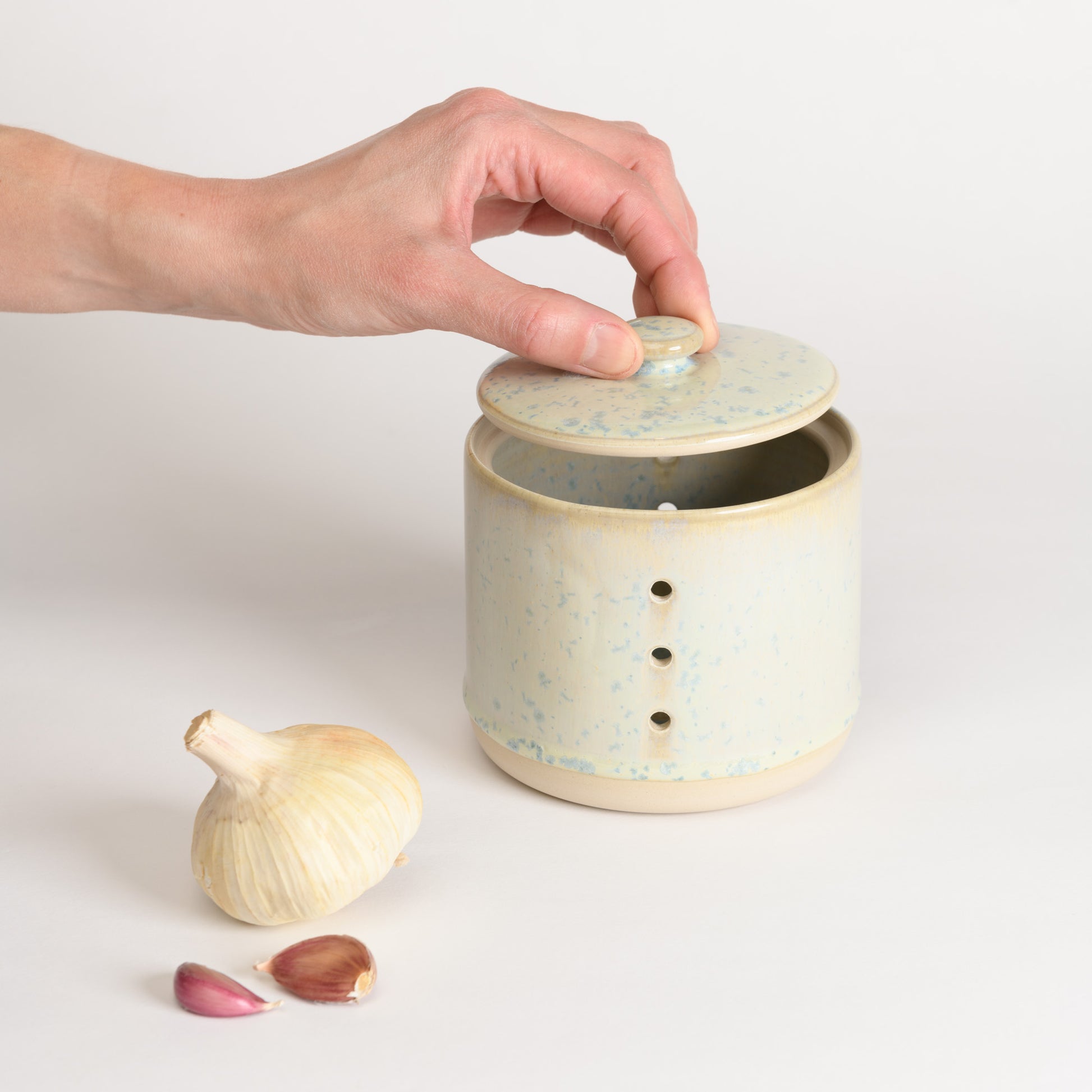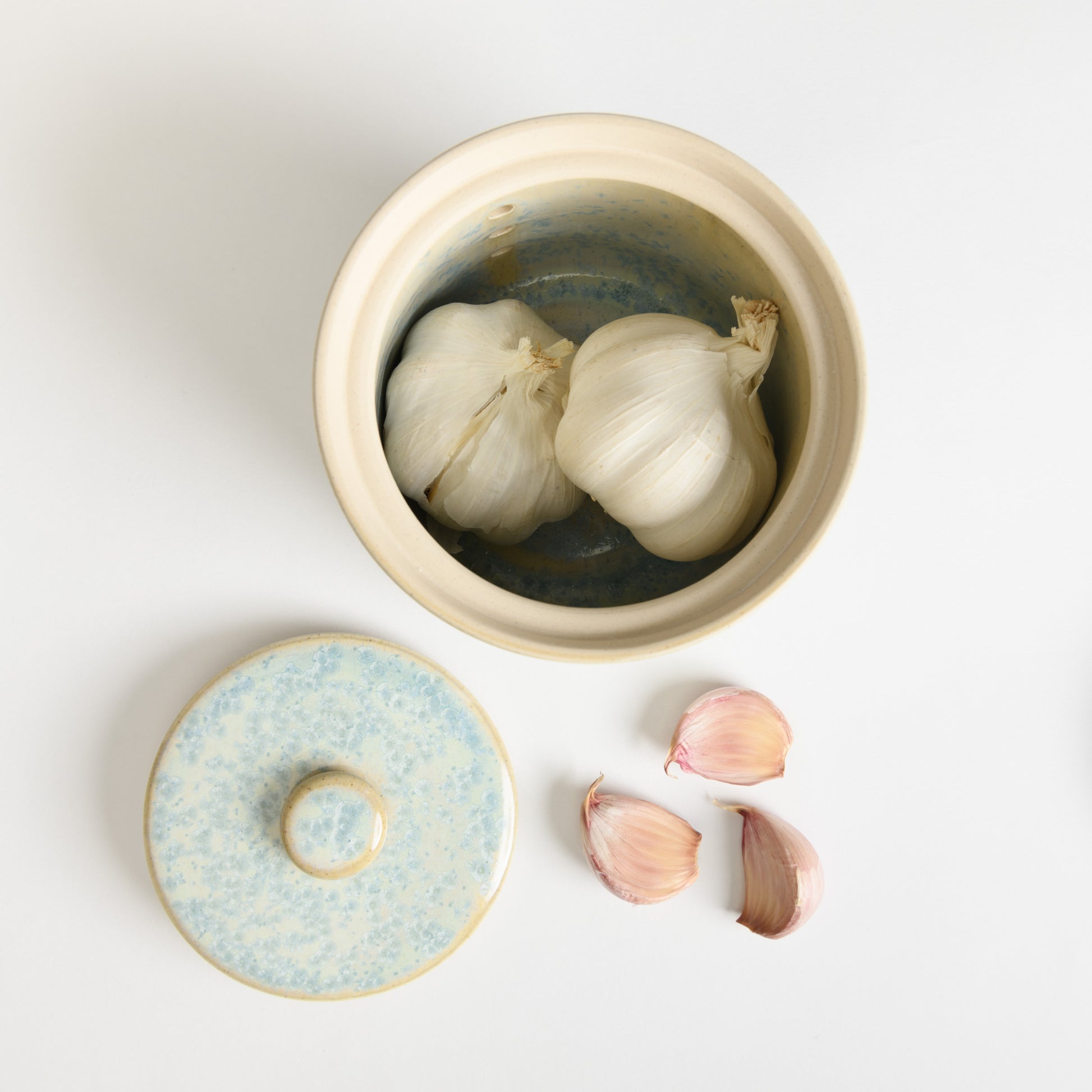 This lidded garlic keeper protects garlic from direct light, reducing the chances of sprouting.