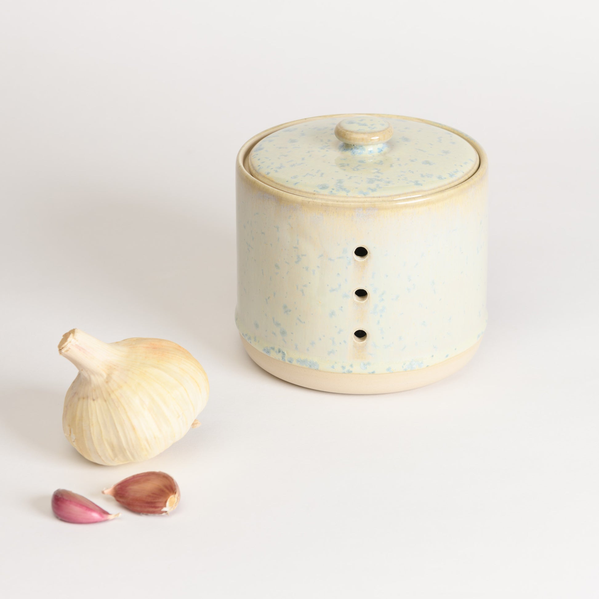 Glazed with a beautiful crystalline glaze, each garlic keeper has a unique pattern of baby blue crystals over a green multi-colour background. No two are ever the same!