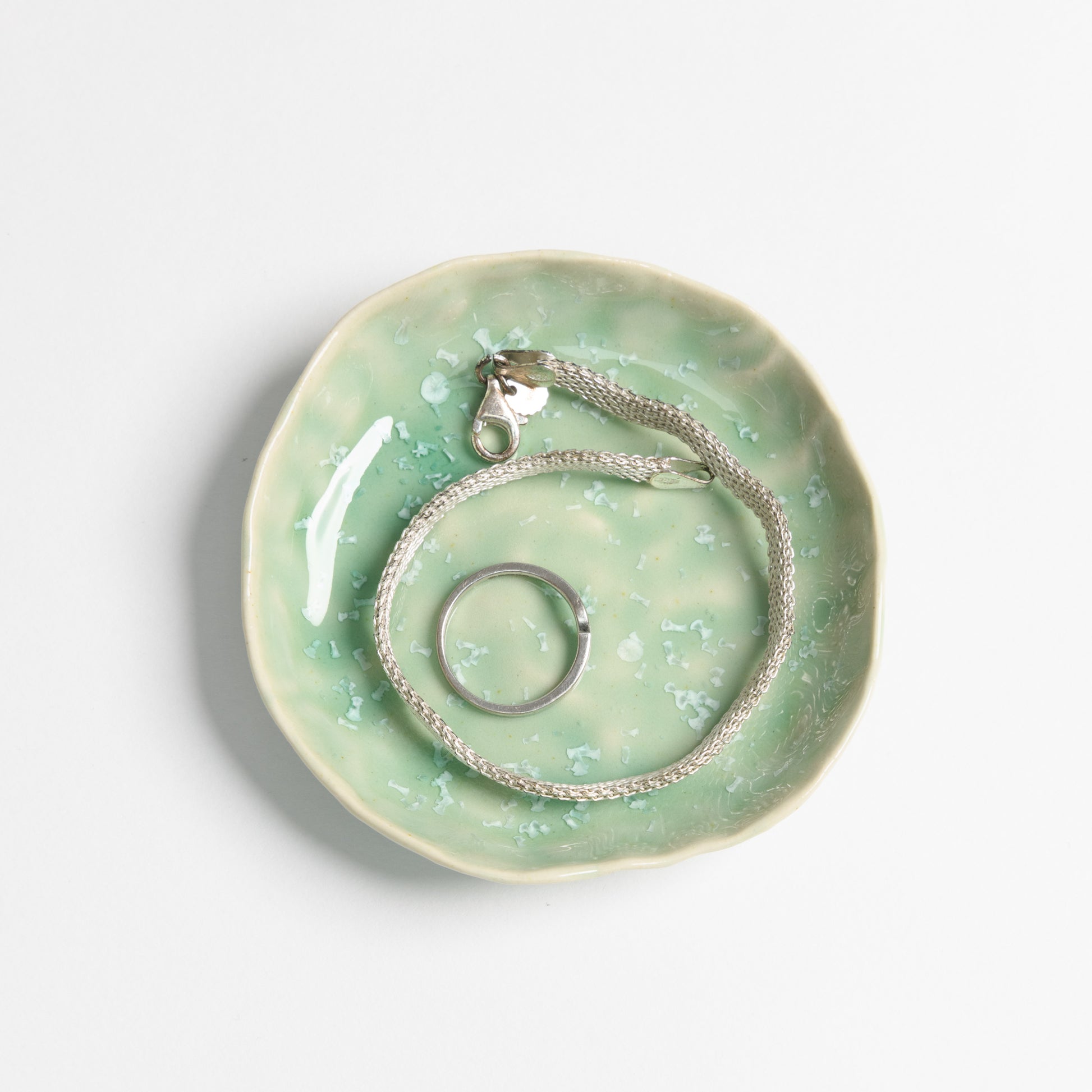Glazed with a beautiful crystalline glaze, each jewellery dish has a unique pattern of crystals over a mint green background. No two are ever the same!