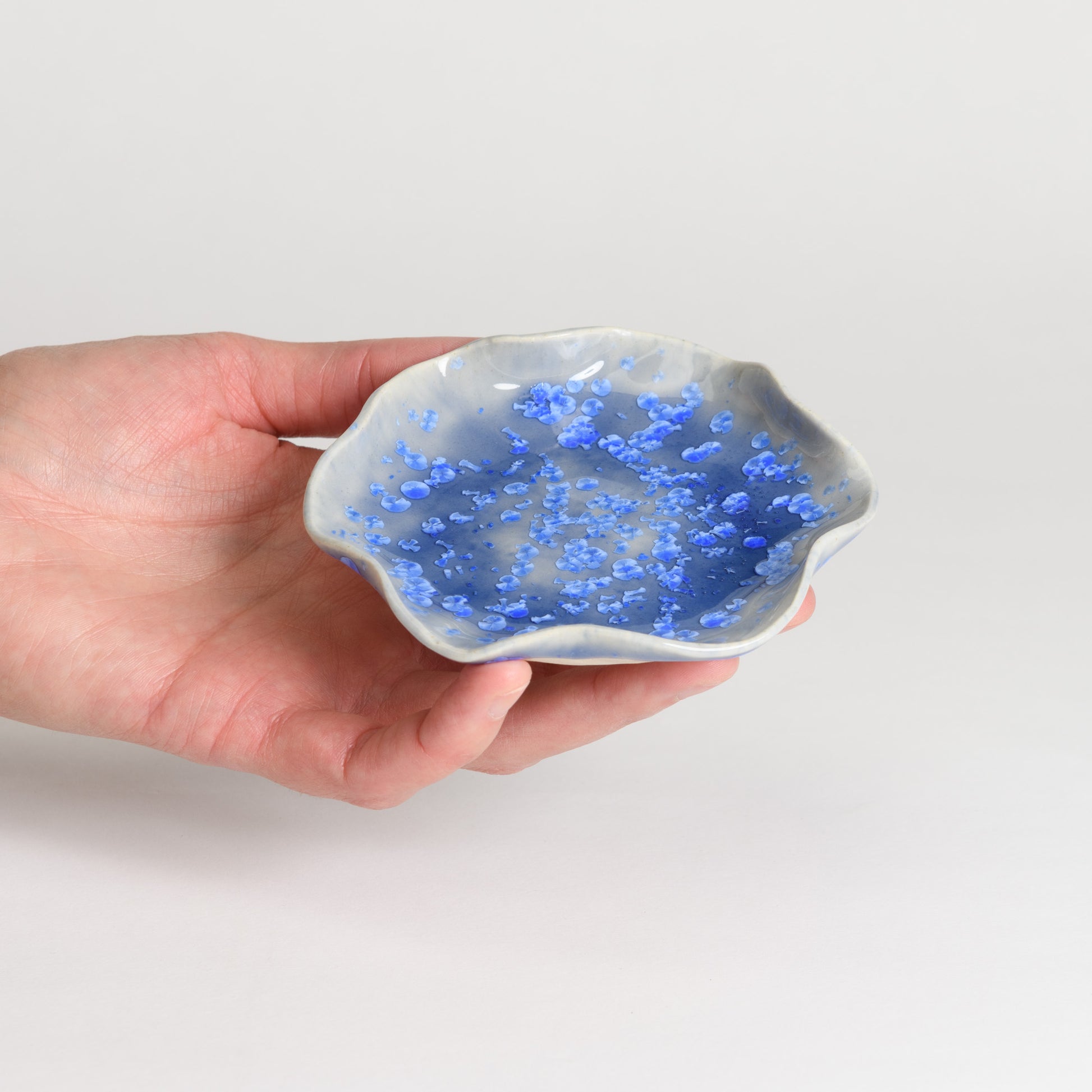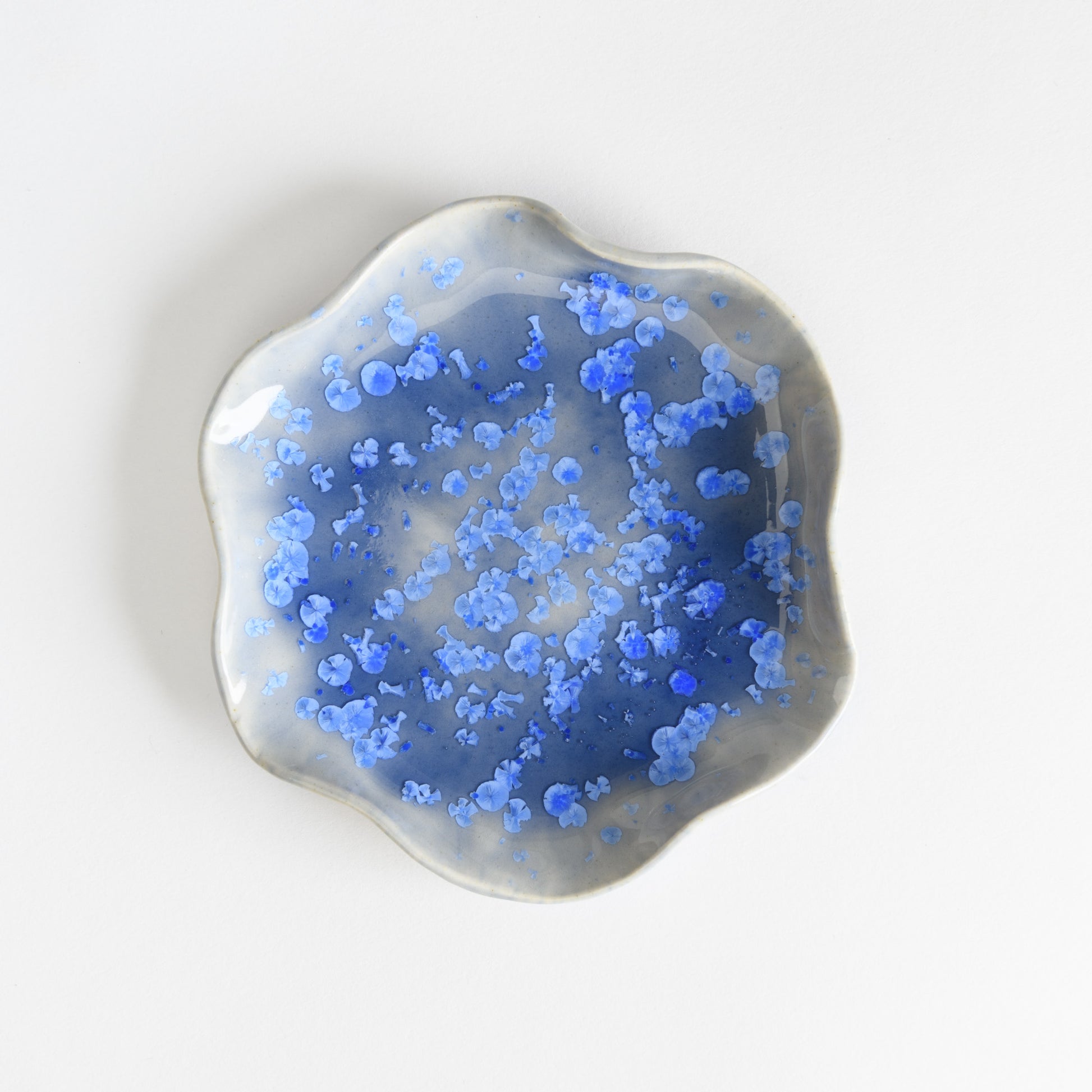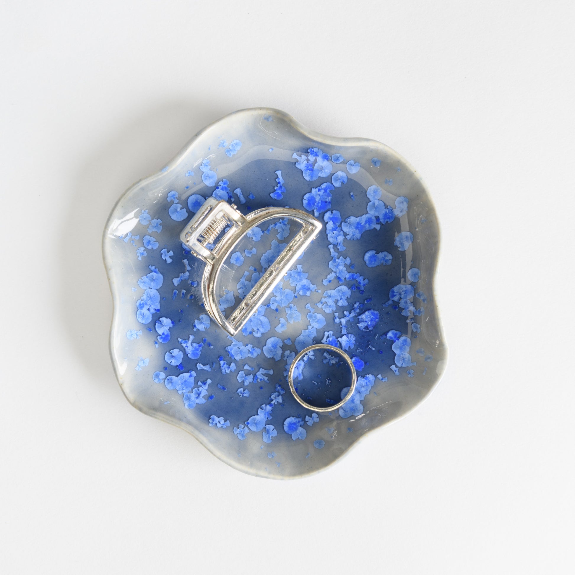Glazed with a beautiful crystalline glaze, each jewellery dish has a unique pattern of crystals over a blue background. No two are ever the same!