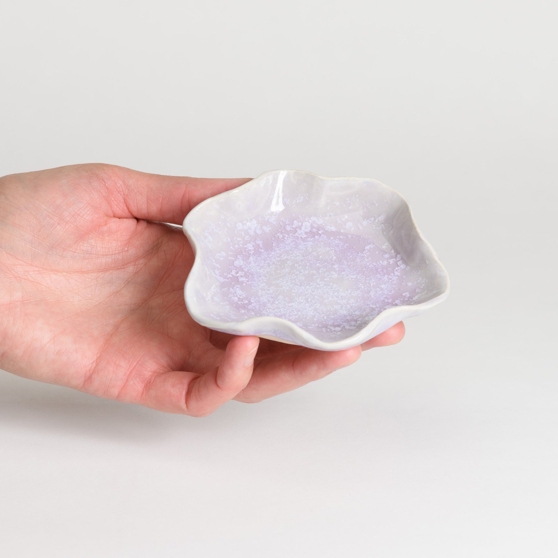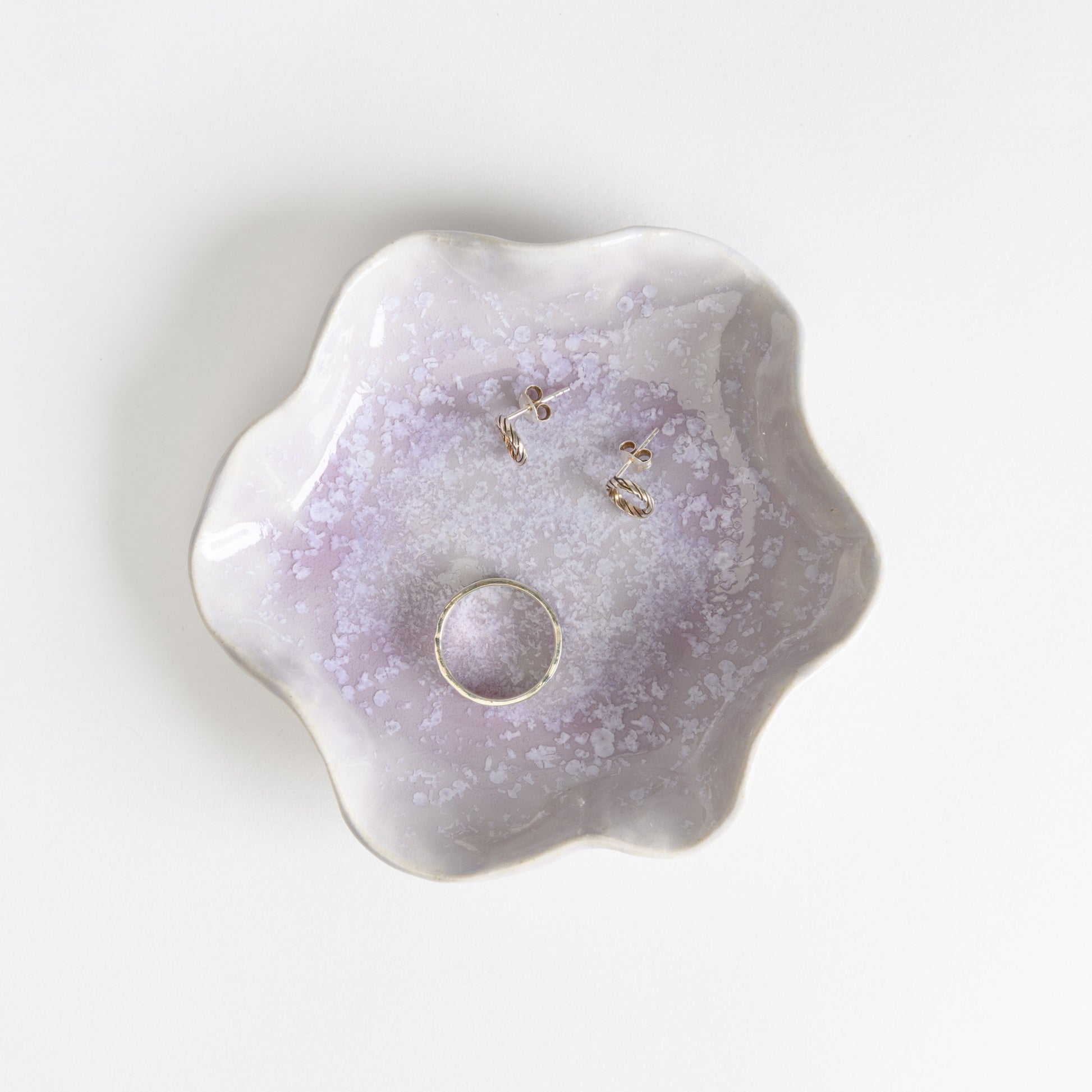 Glazed with a beautiful crystalline glaze, each jewellery dish has a unique pattern of crystals over a lilac background. No two are ever the same!