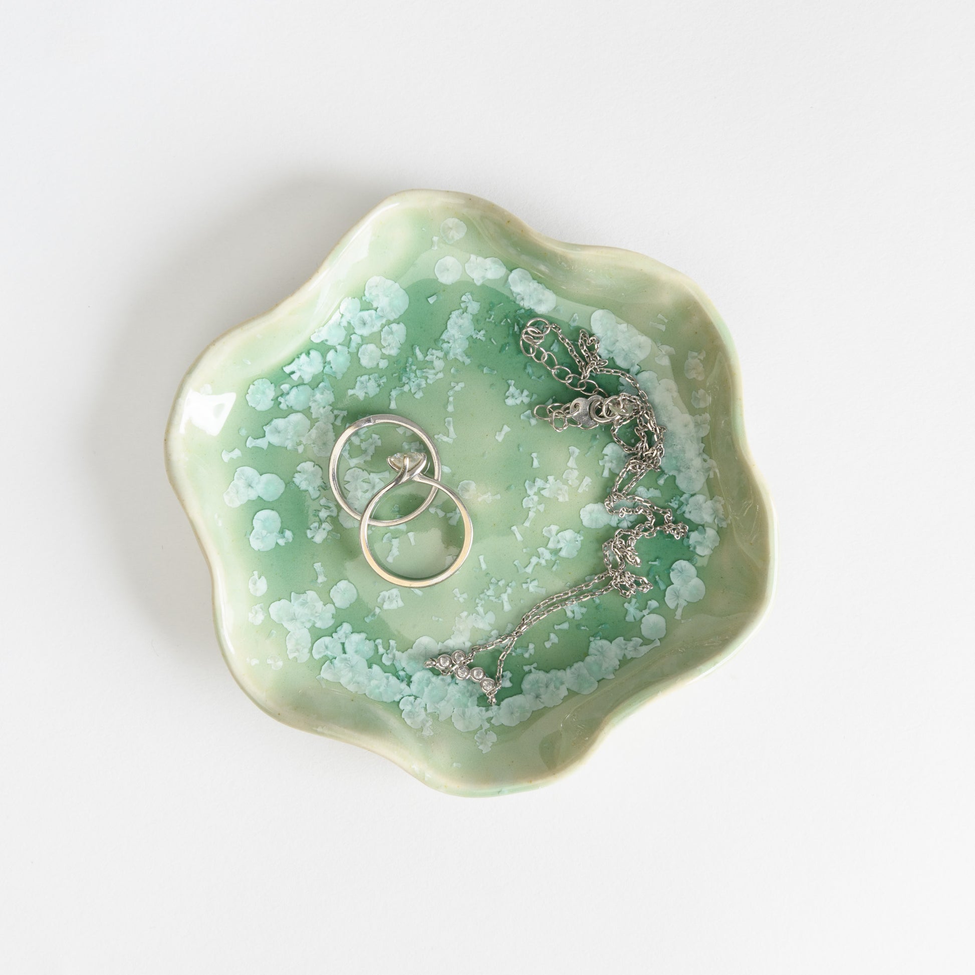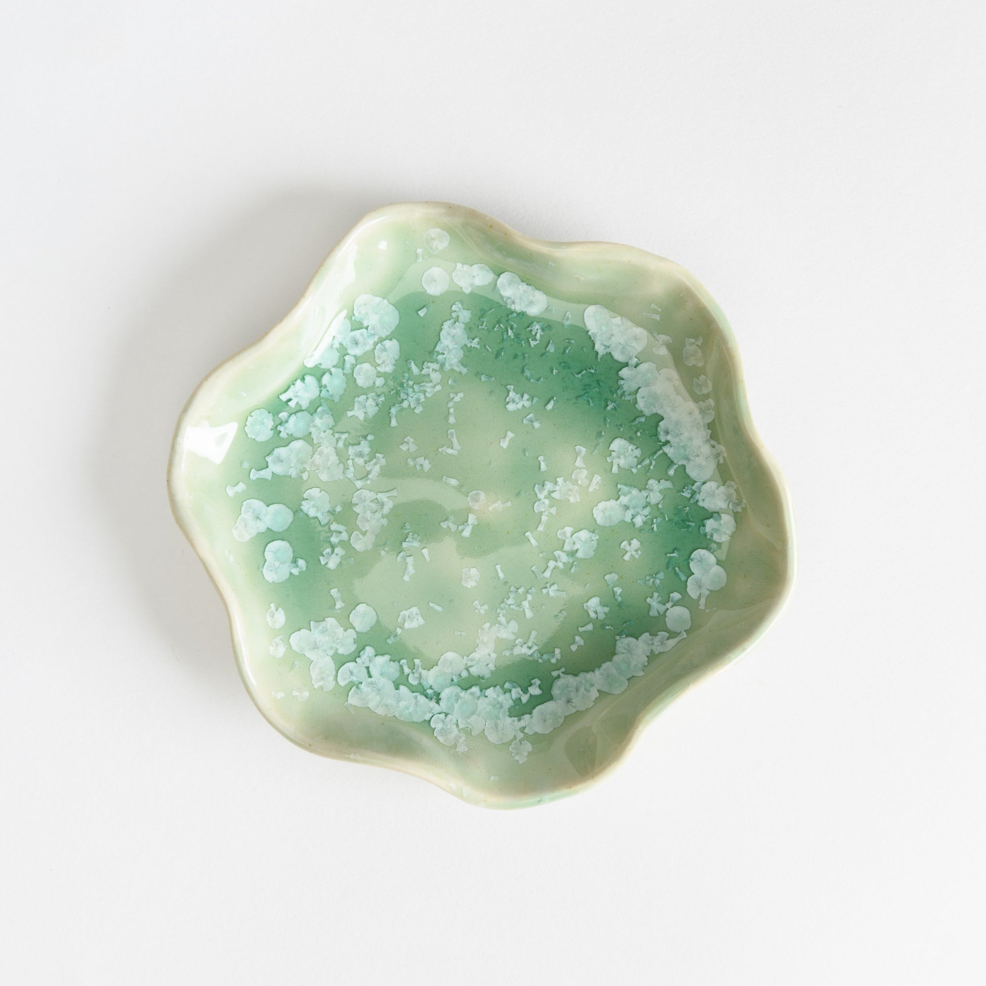 Glazed with a beautiful crystalline glaze, each jewellery dish has a unique pattern of crystals over a mint green background. No two are ever the same!