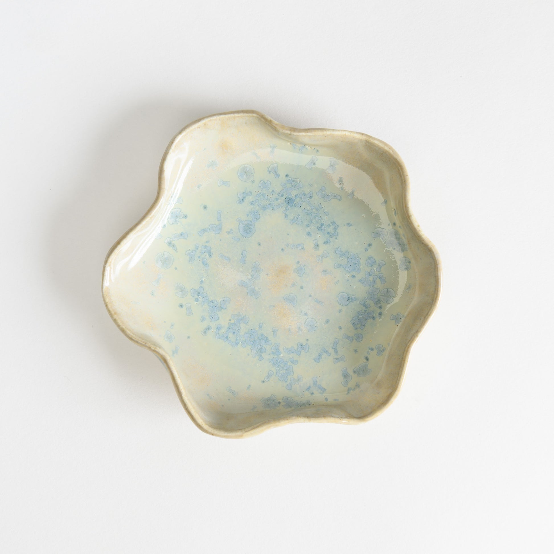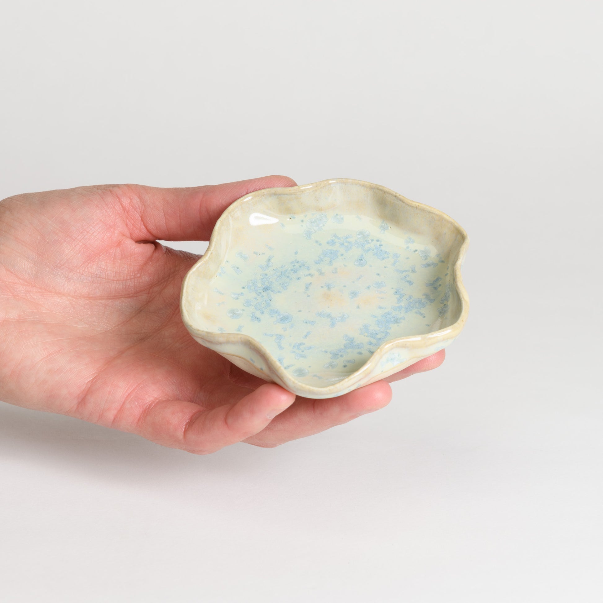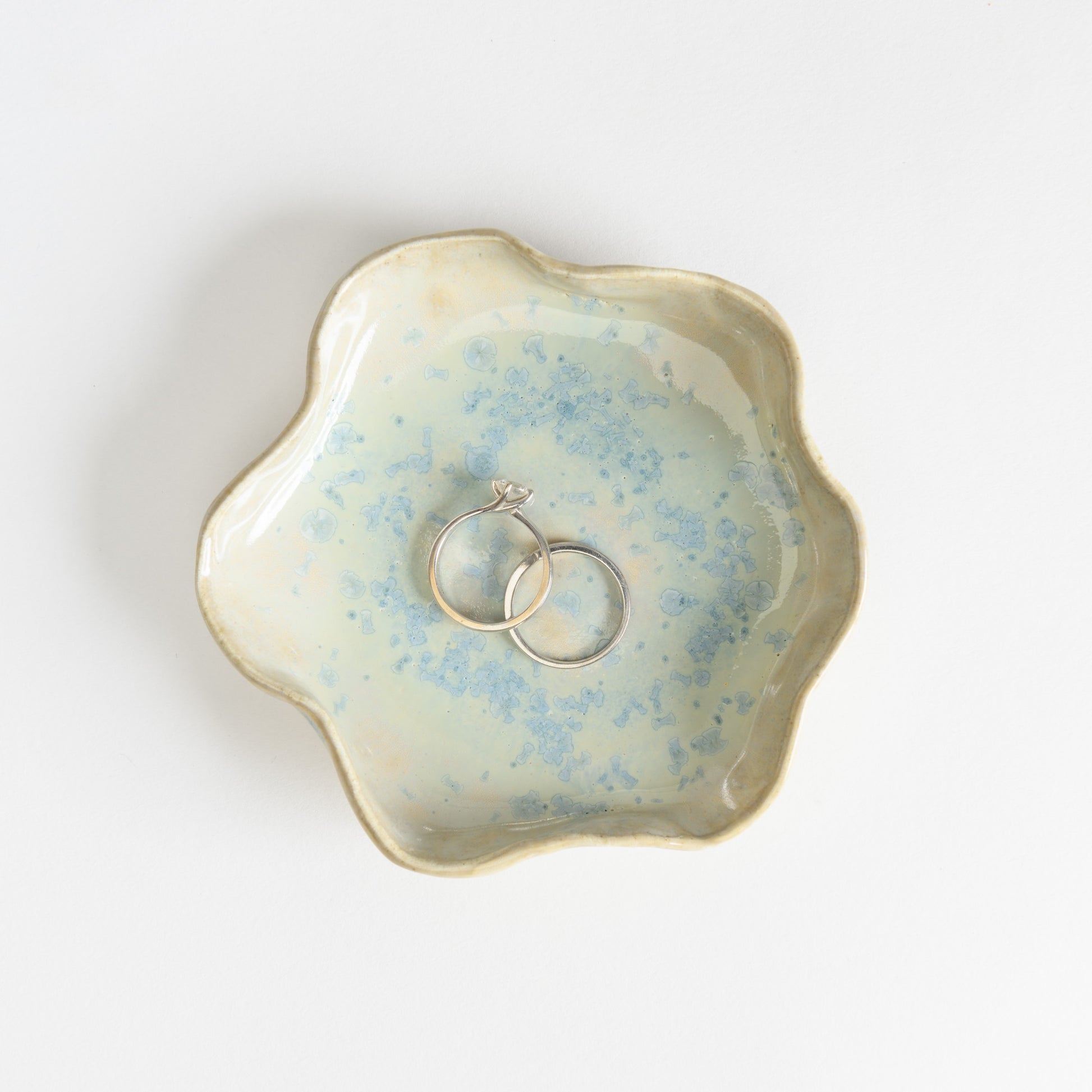 Glazed with a beautiful crystalline glaze, each jewellery dish has a unique pattern of baby blue crystals over a multi-tonal green, blue and cream background. No two are ever the same!