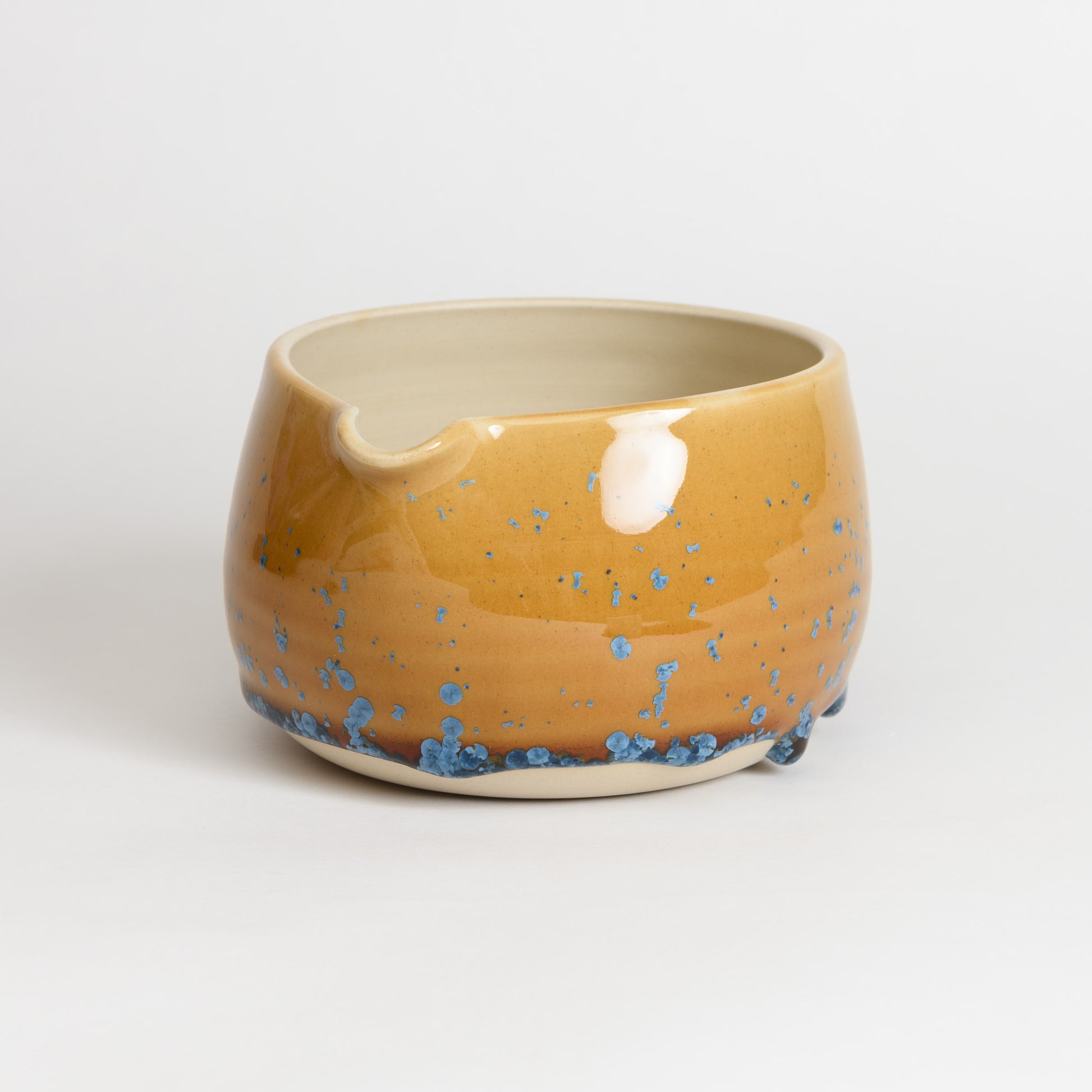 Glazed with a beautiful, crystalline glaze, each bowl features a unique pattern of blue crystals set against an amber background. No two are ever the same!