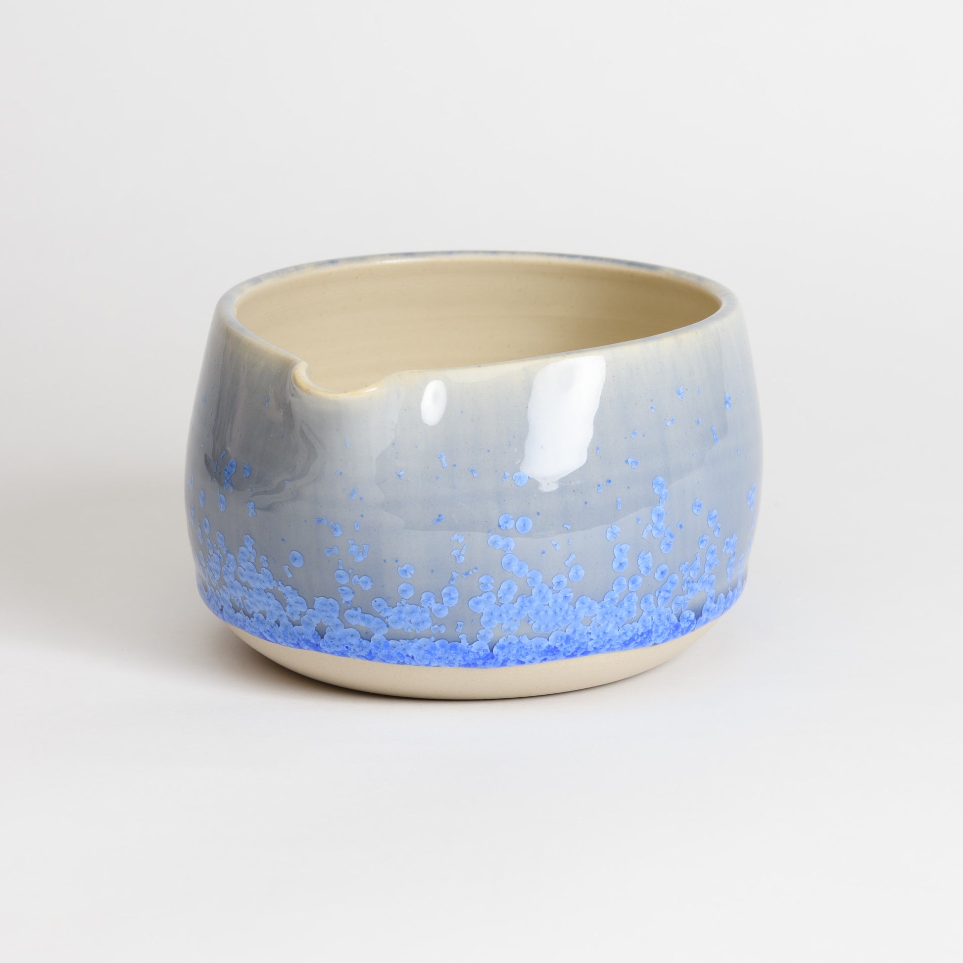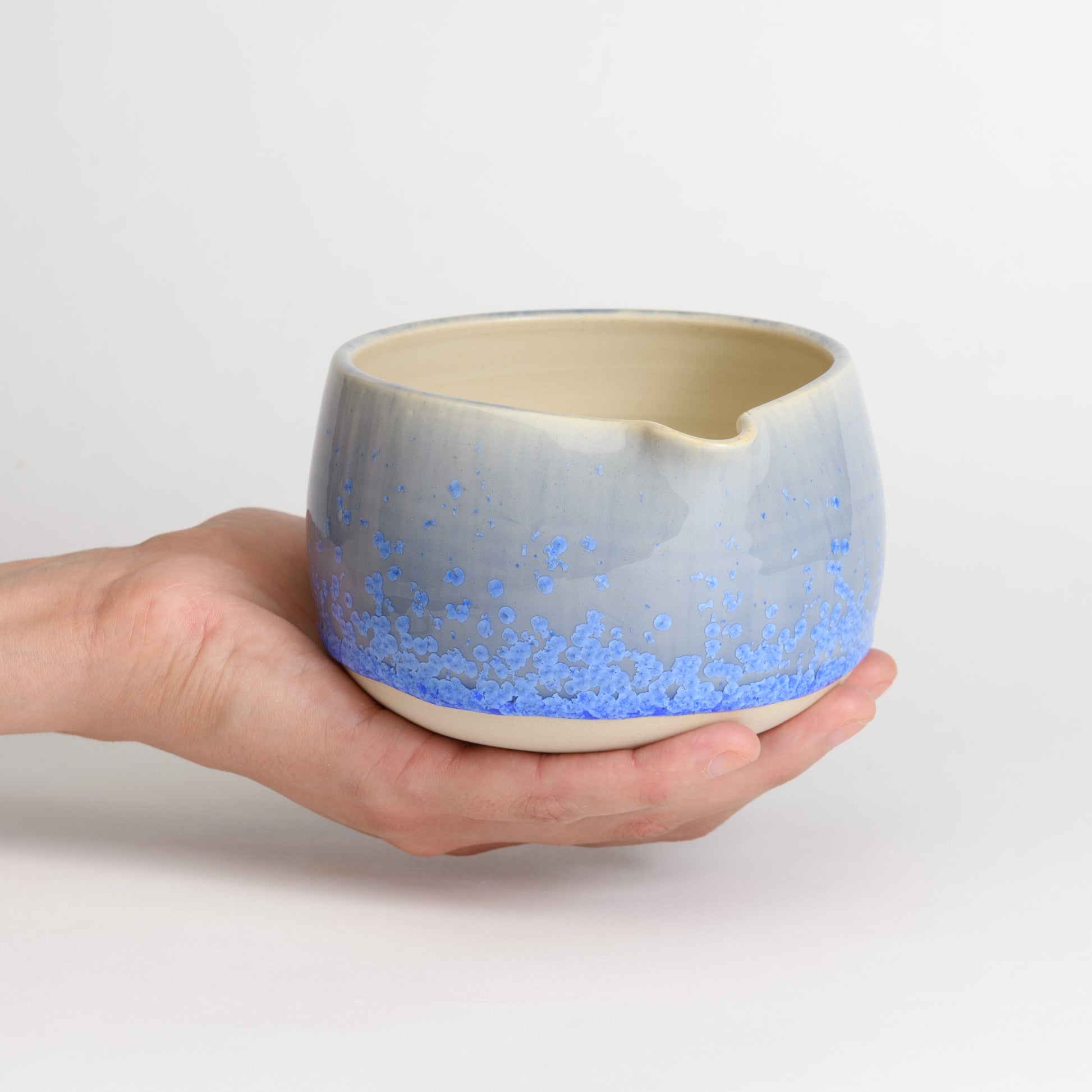 Glazed with a beautiful, crystalline glaze, each bowl features a unique pattern of crystals set against a blue background. No two are ever the same!
