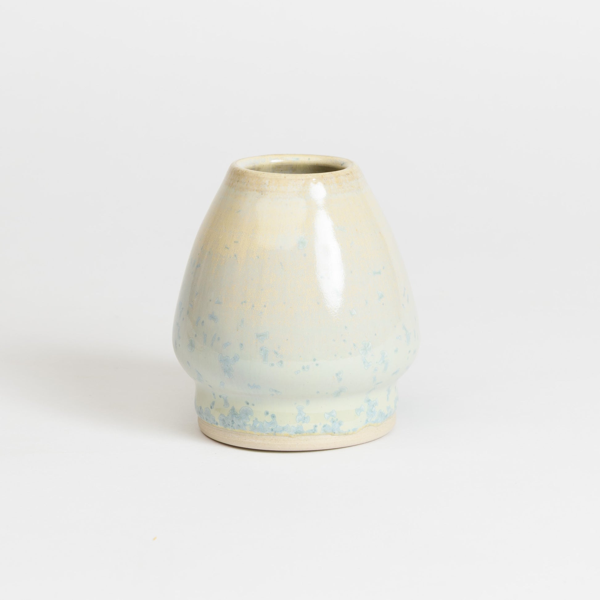 Glazed with a beautiful crystalline glaze, each whisk holder features a unique pattern of baby blue crystals set against a multi-tonal green, blue, and cream background. No two are ever the same!