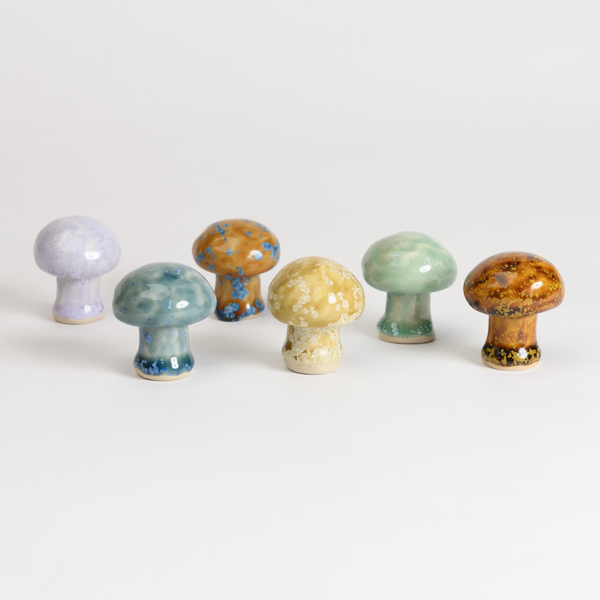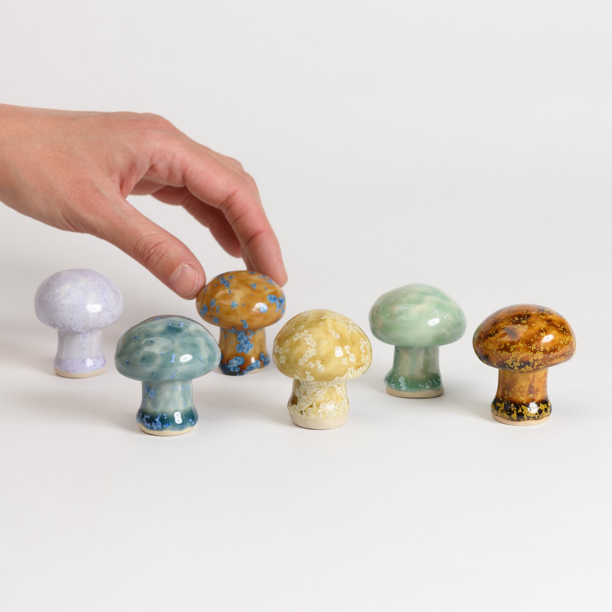 Whimsical button mushrooms in a selection of beautiful crystalline glazes.