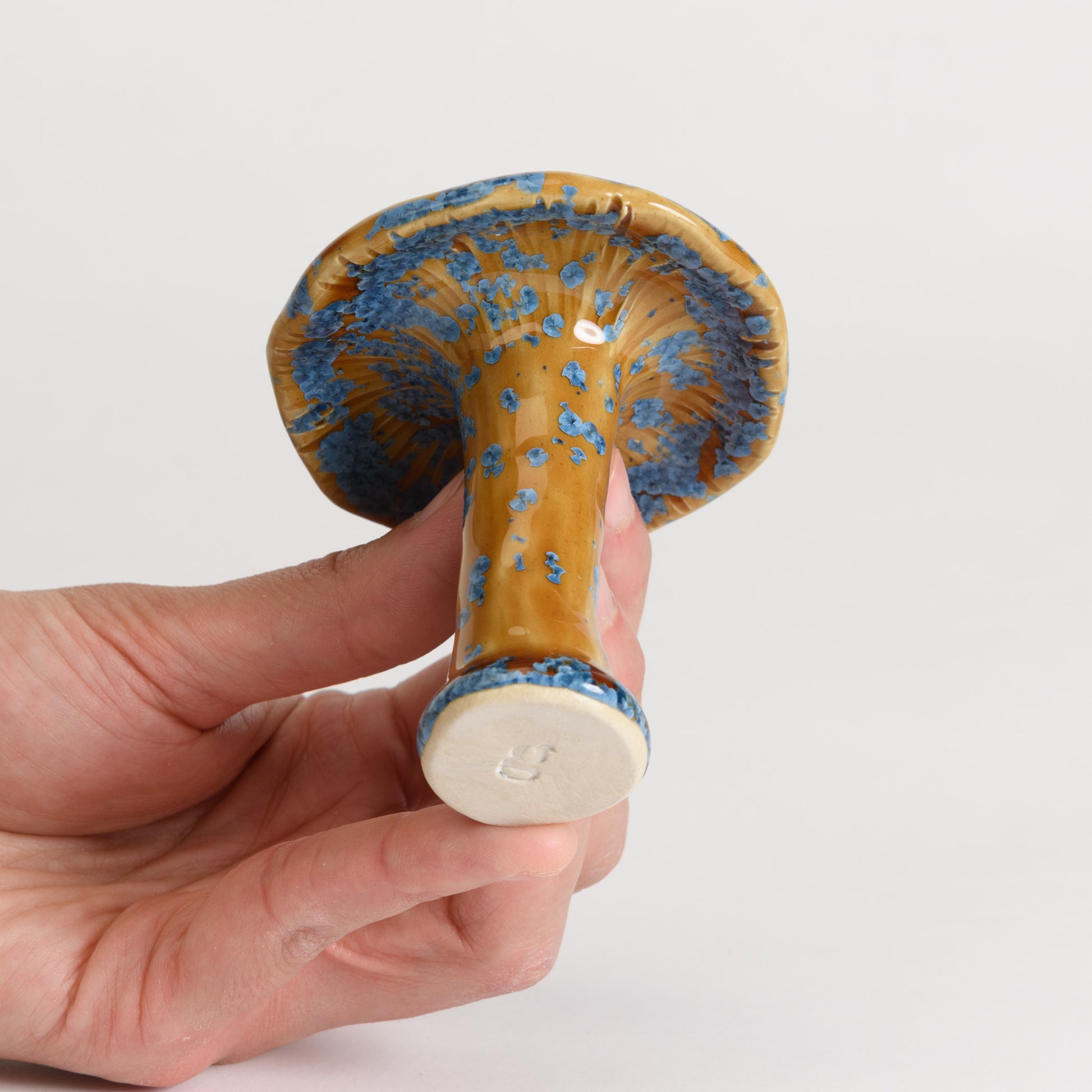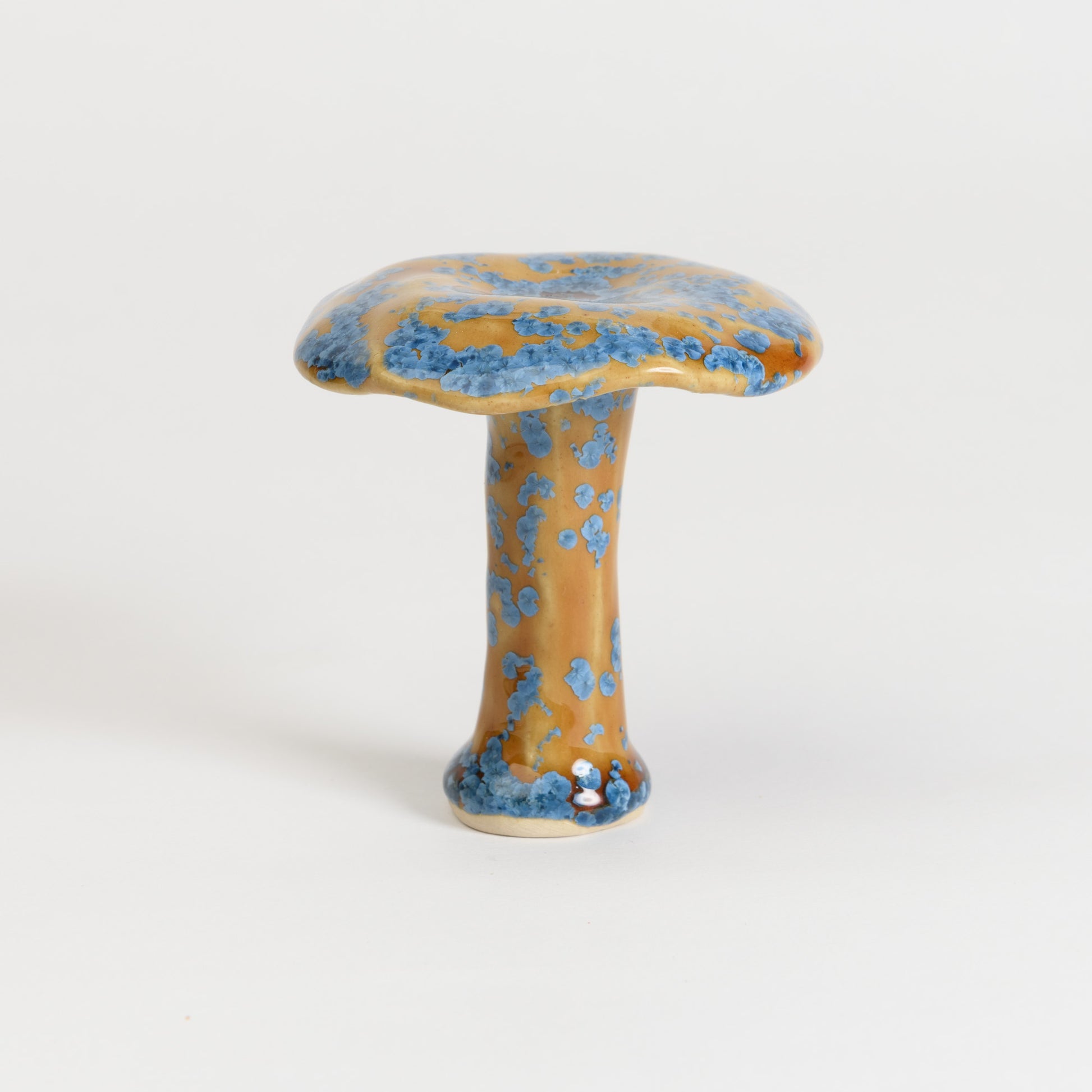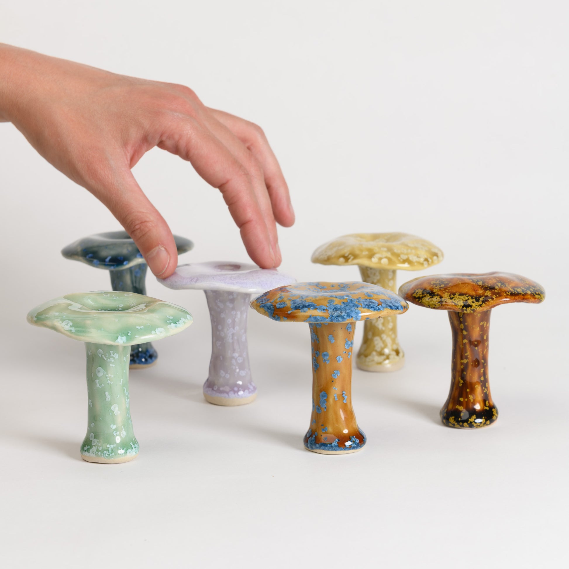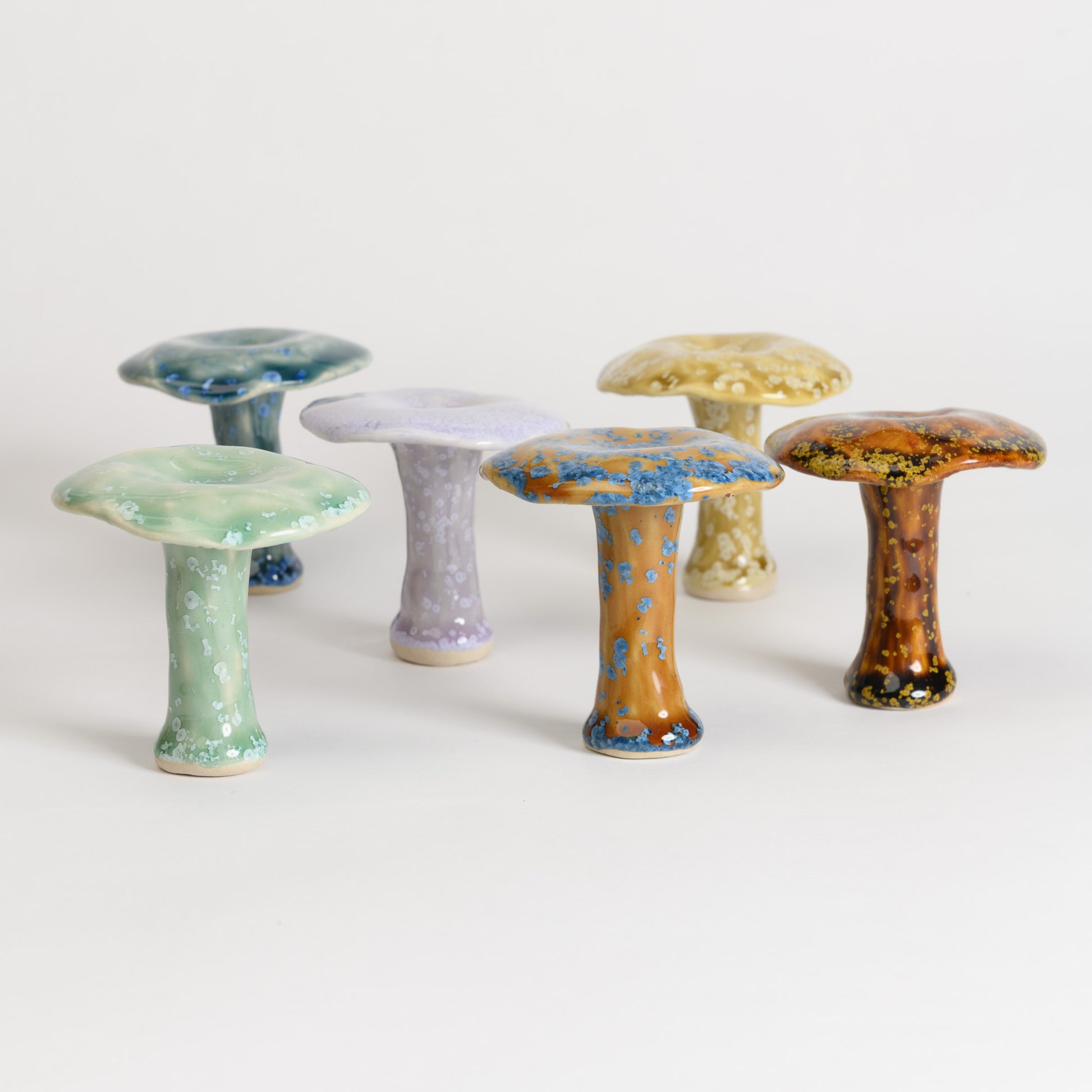 Whimsical milkcap mushrooms in a selection of beautiful crystalline glazes.