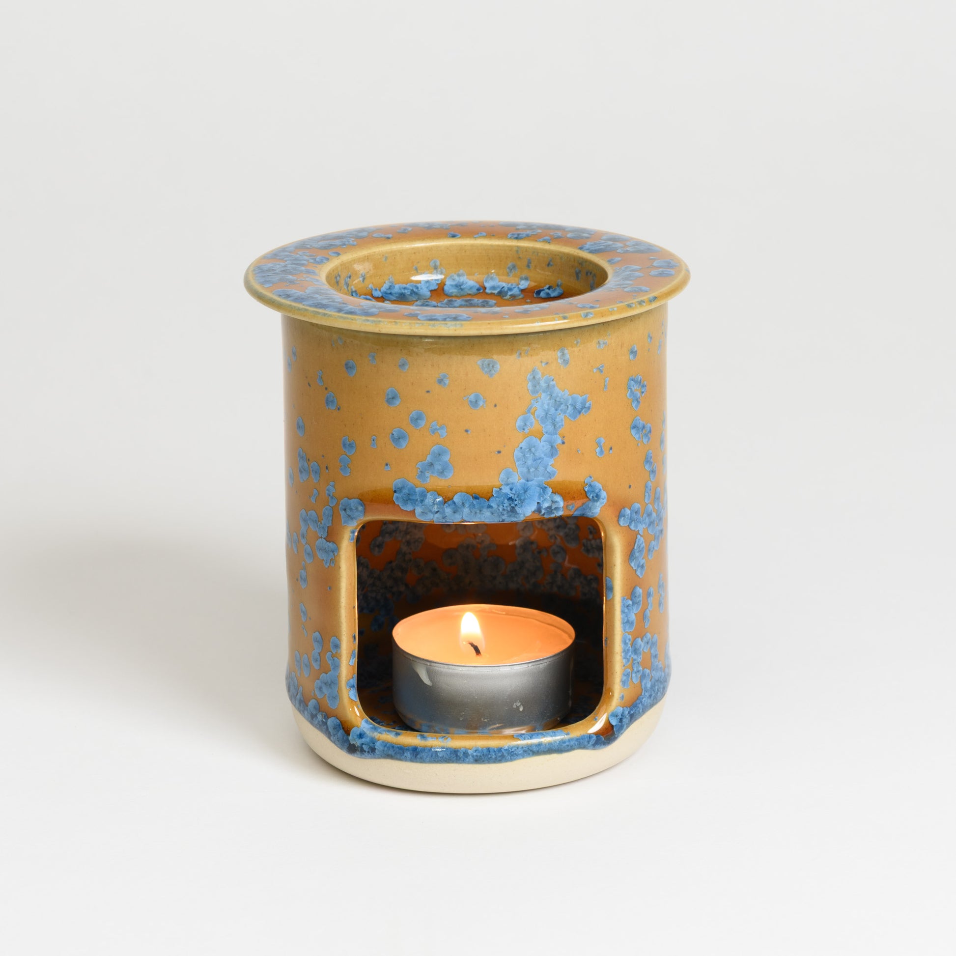 Glazed with a beautiful crystalline glaze, each burner has a unique pattern of blue crystals over an amber background. No two are ever the same!