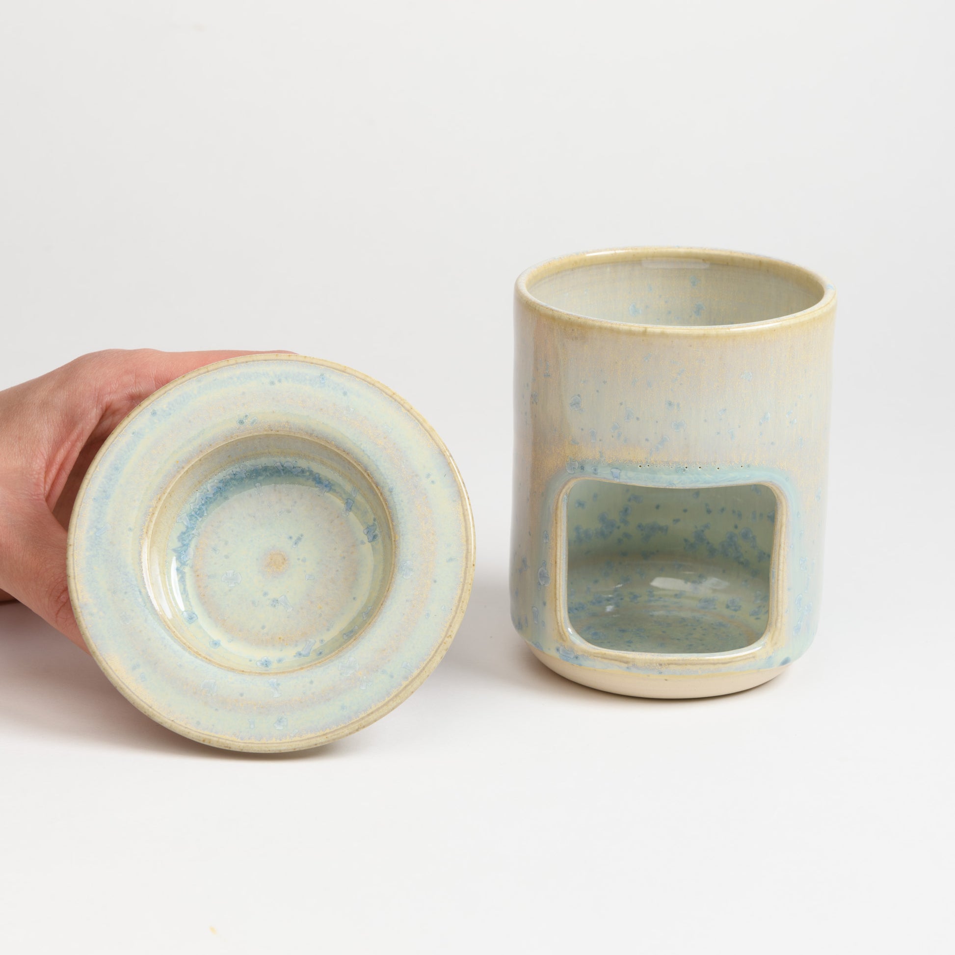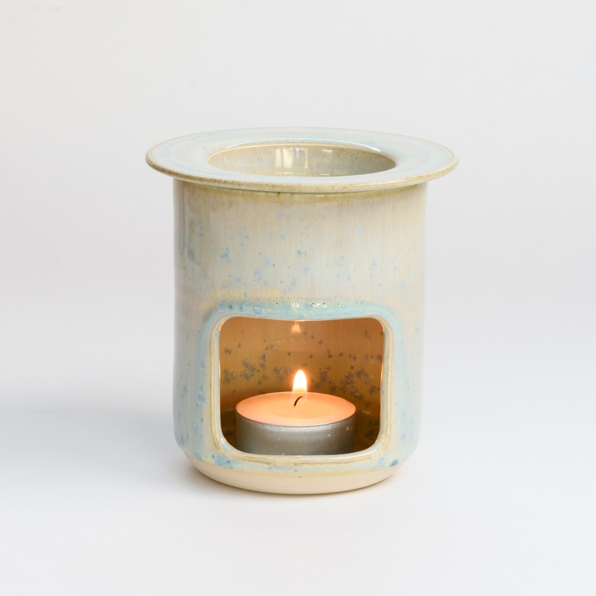 Glazed with a beautiful crystalline glaze, each burner has a unique pattern of baby blue crystals over a multi-tonal green, blue and cream background. No two are ever the same!