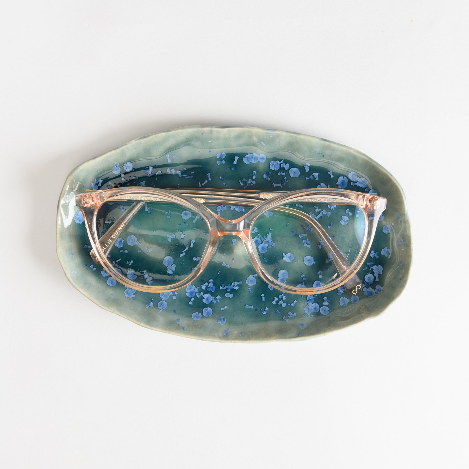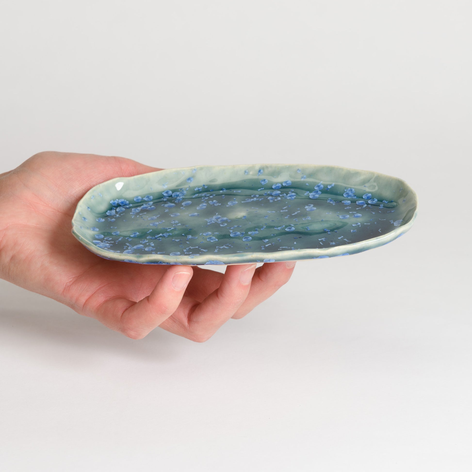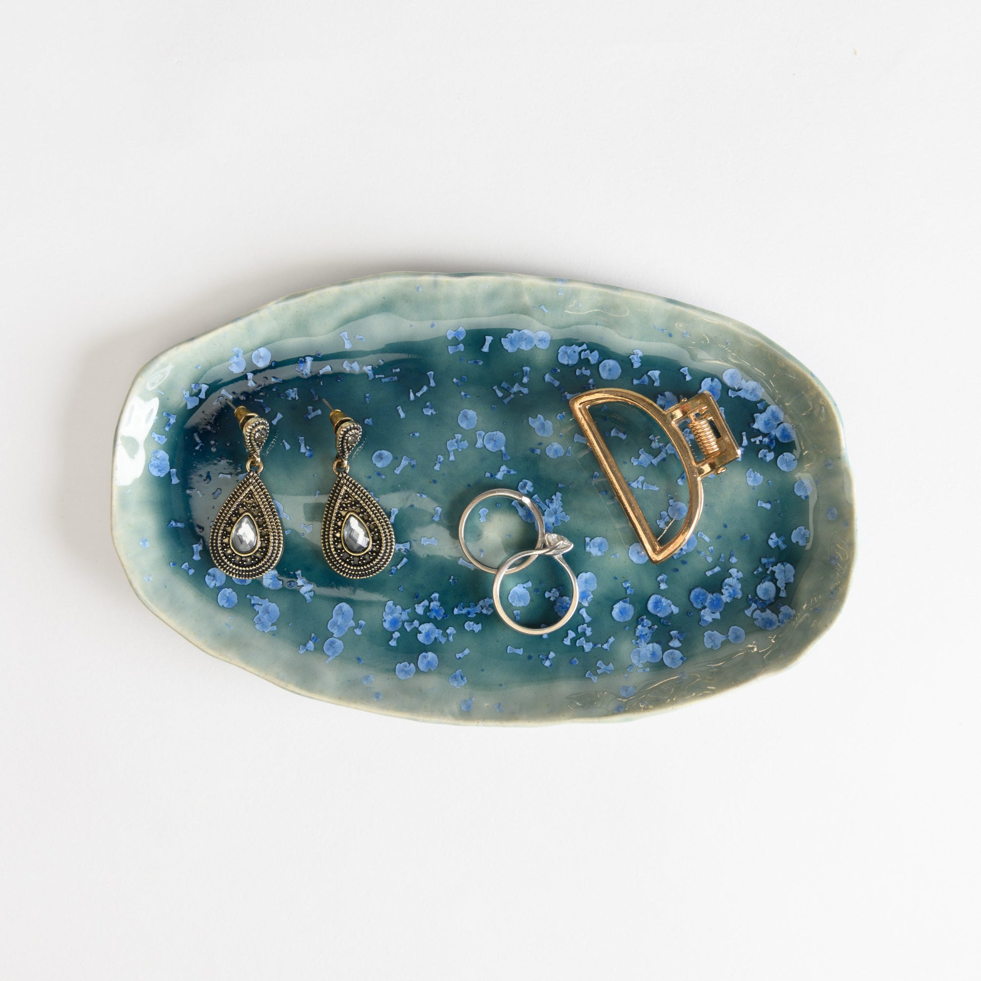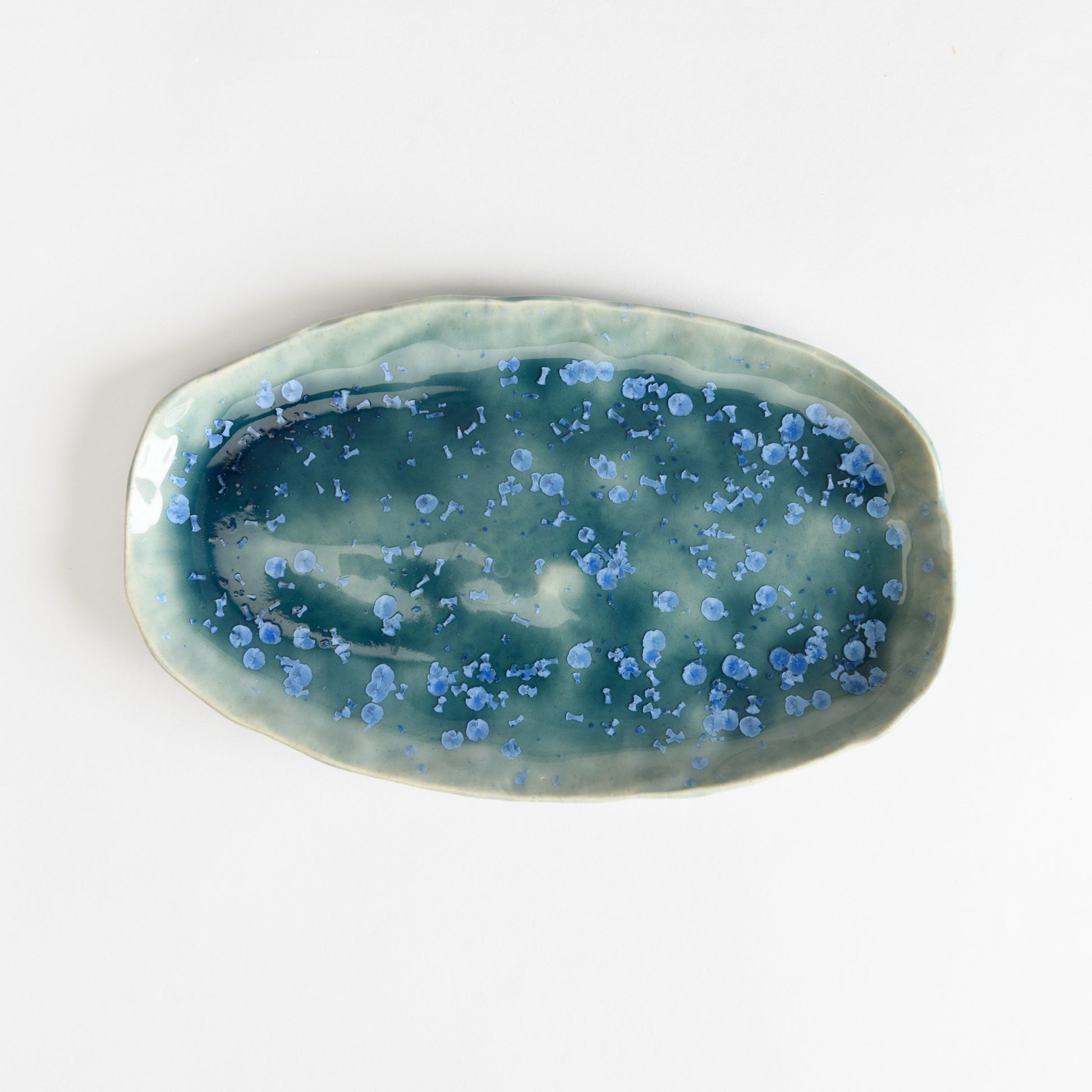 Glazed with a beautiful crystalline glaze, each tray has a unique pattern of blue crystals over a teal background. No two are ever the same!