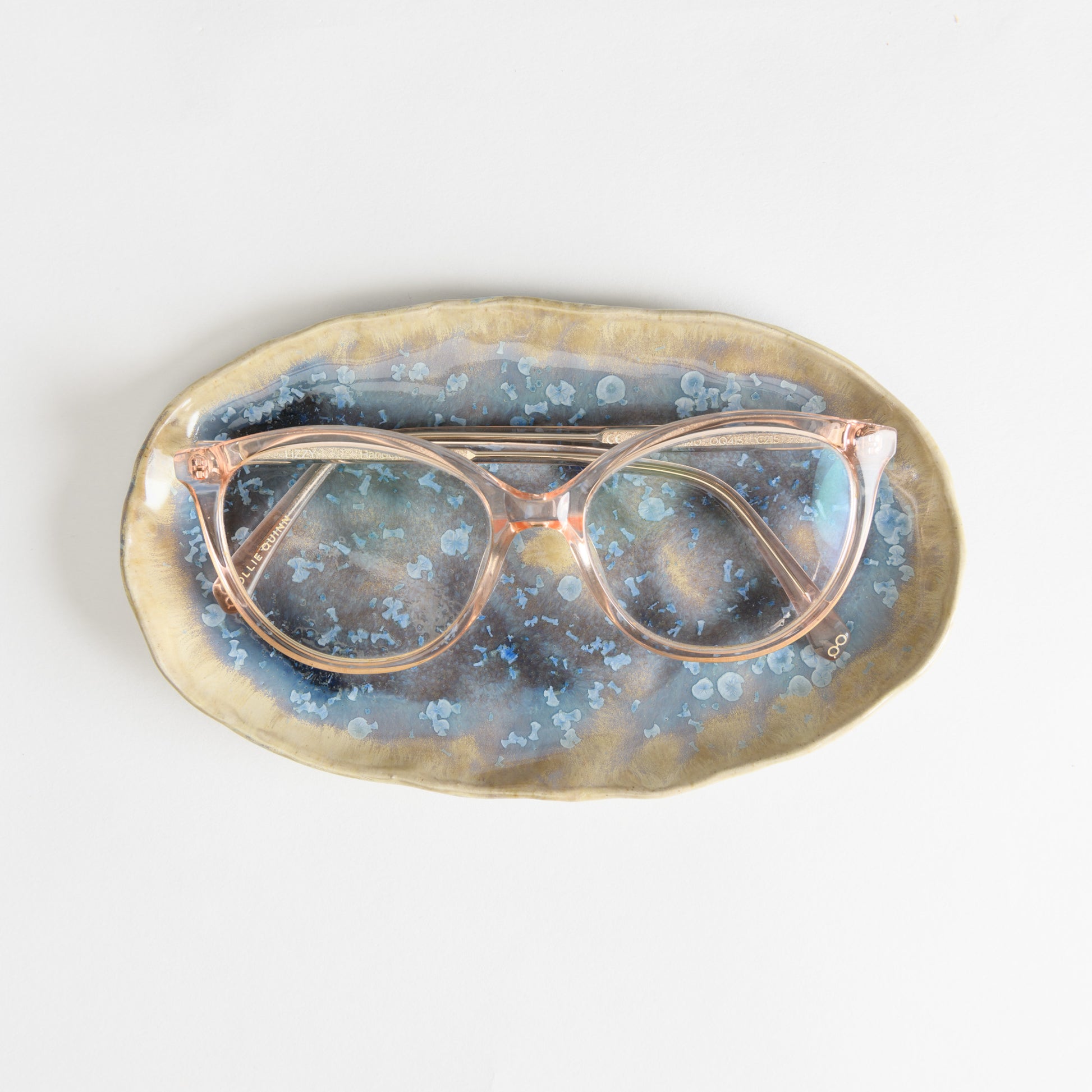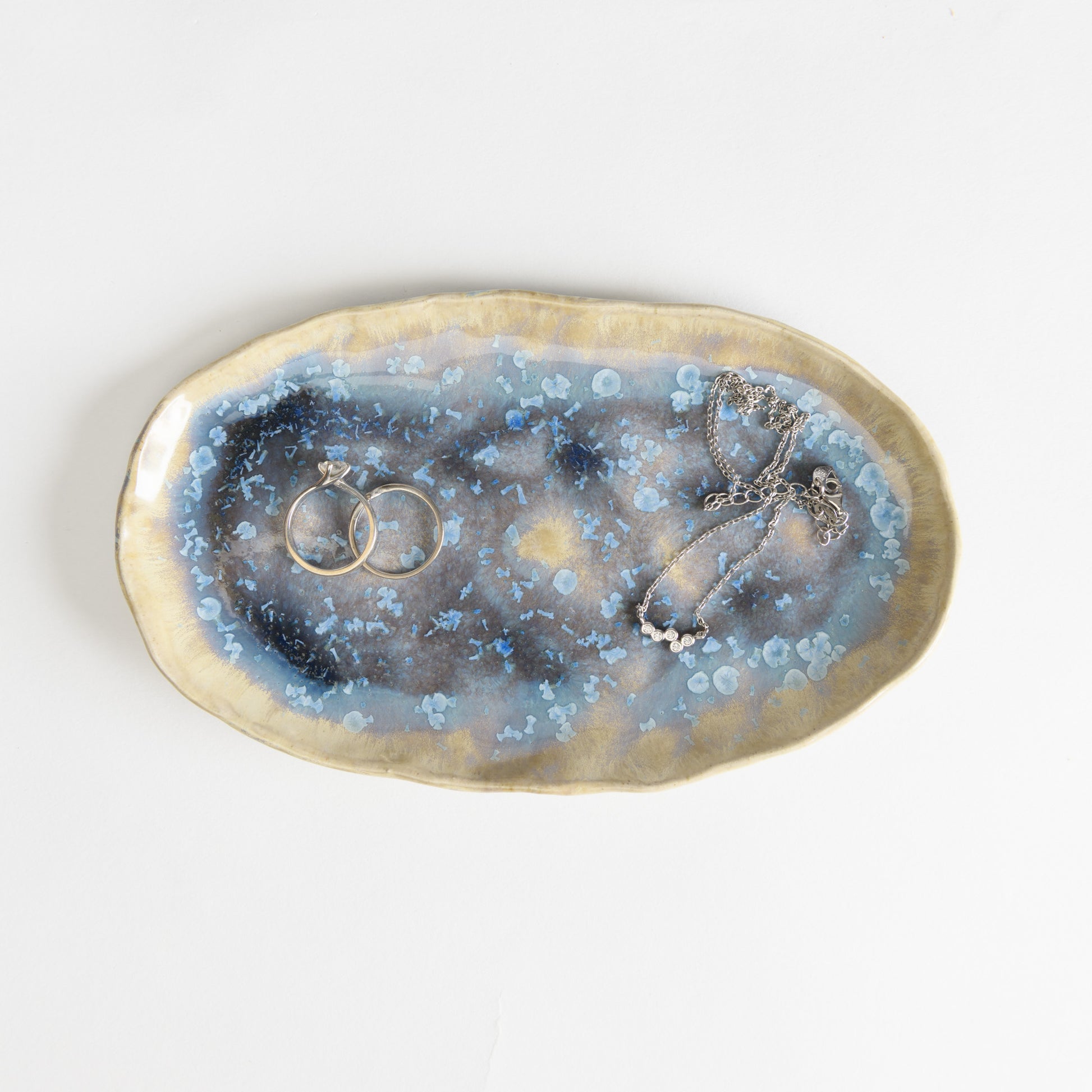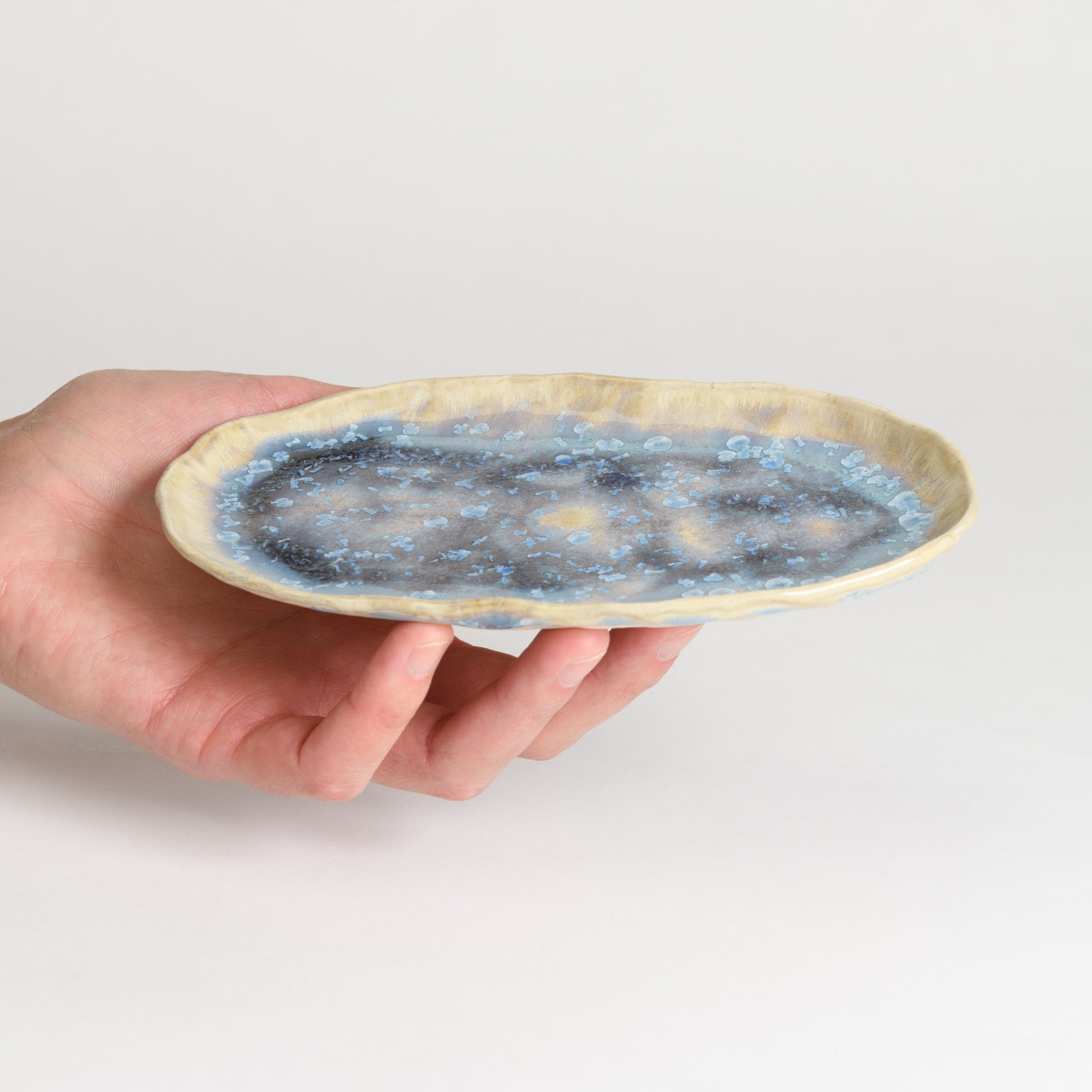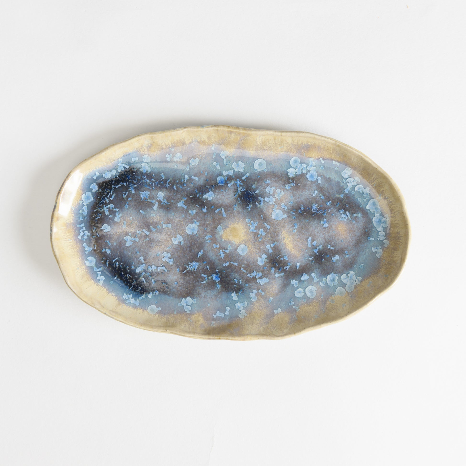 Glazed with a beautiful crystalline glaze, each tray has a unique pattern of baby blue crystals over a multi-tonal purple, blue and cream background. No two are ever the same!