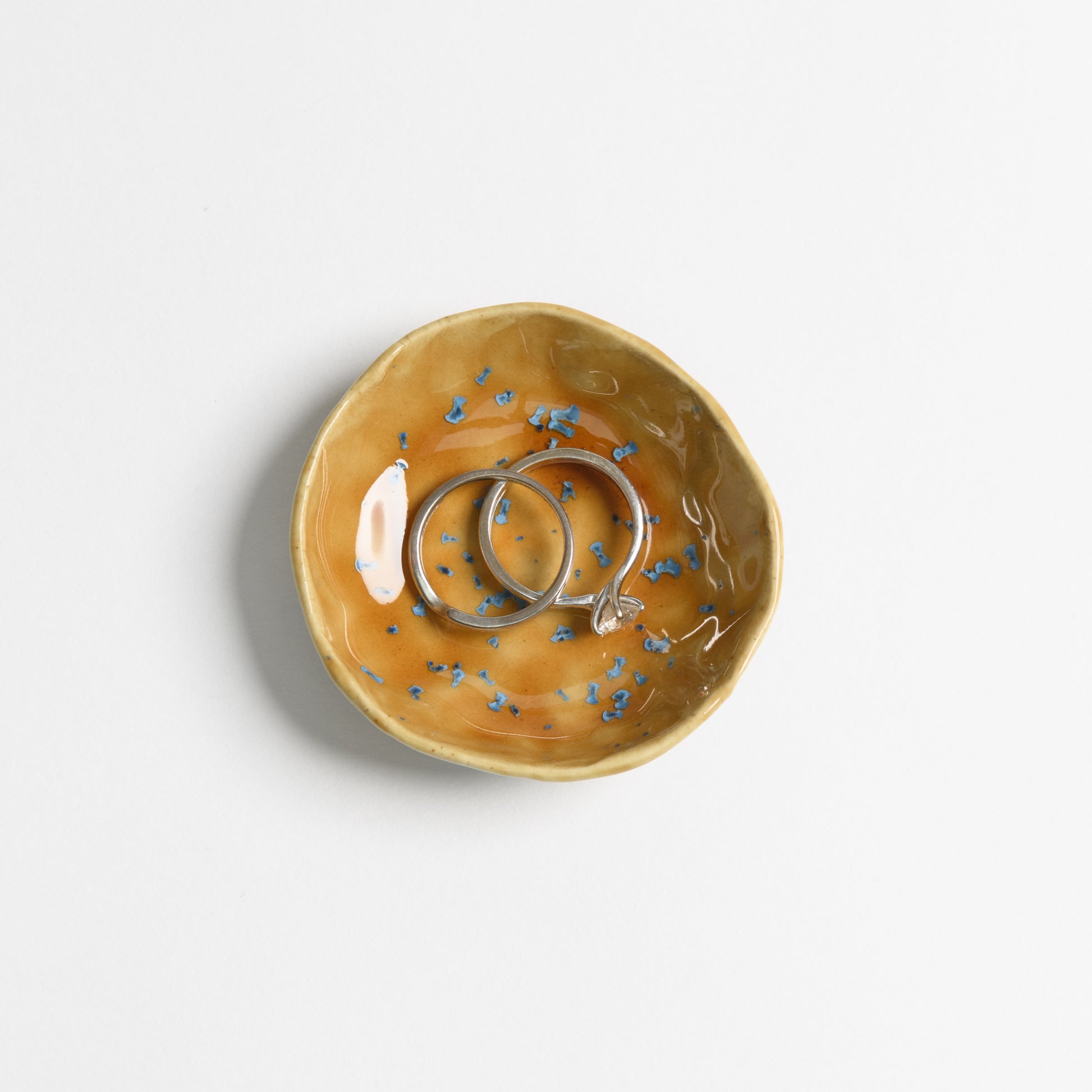 Glazed with a beautiful crystalline glaze, each ring dish has a unique pattern of blue crystals over an amber background. No two are ever the same!