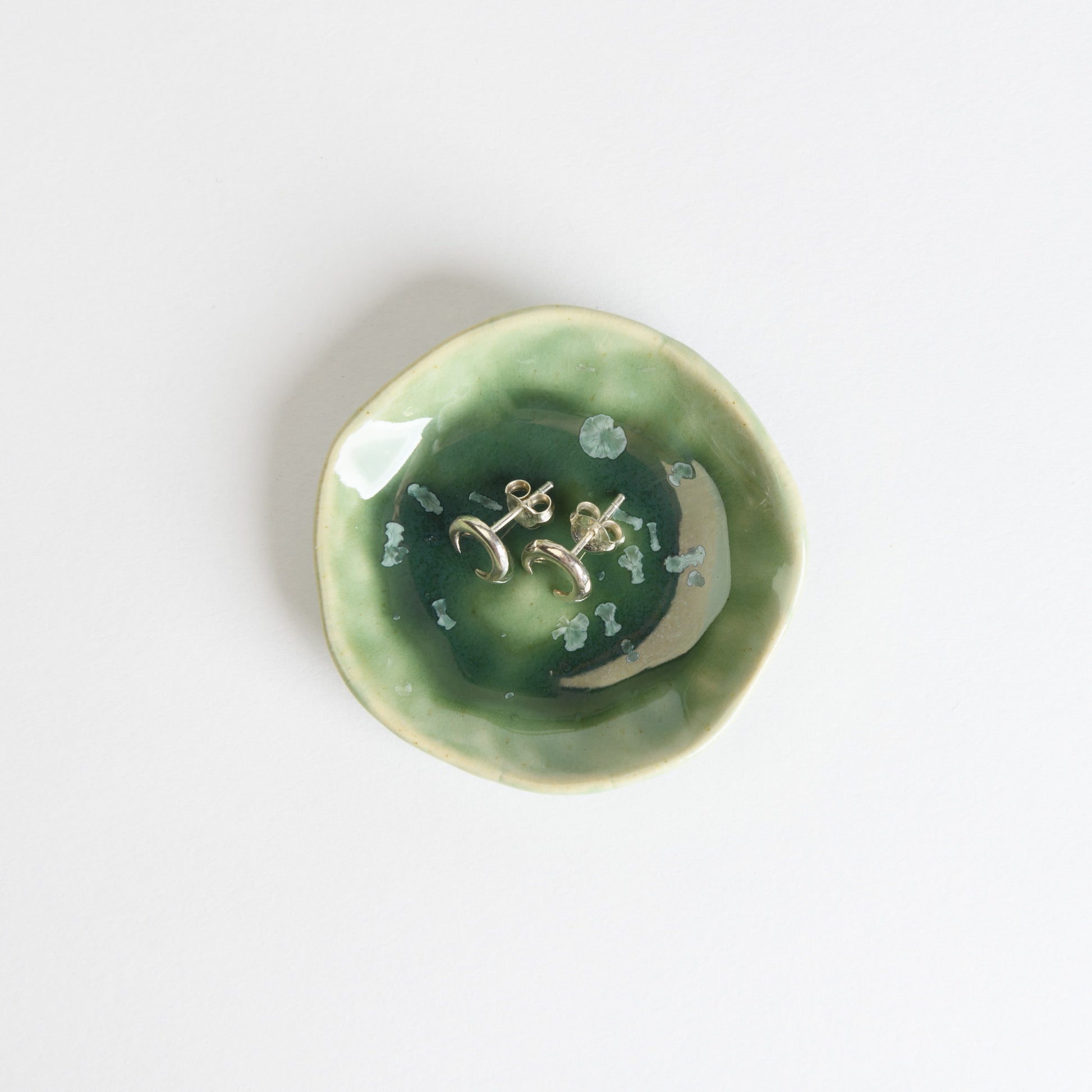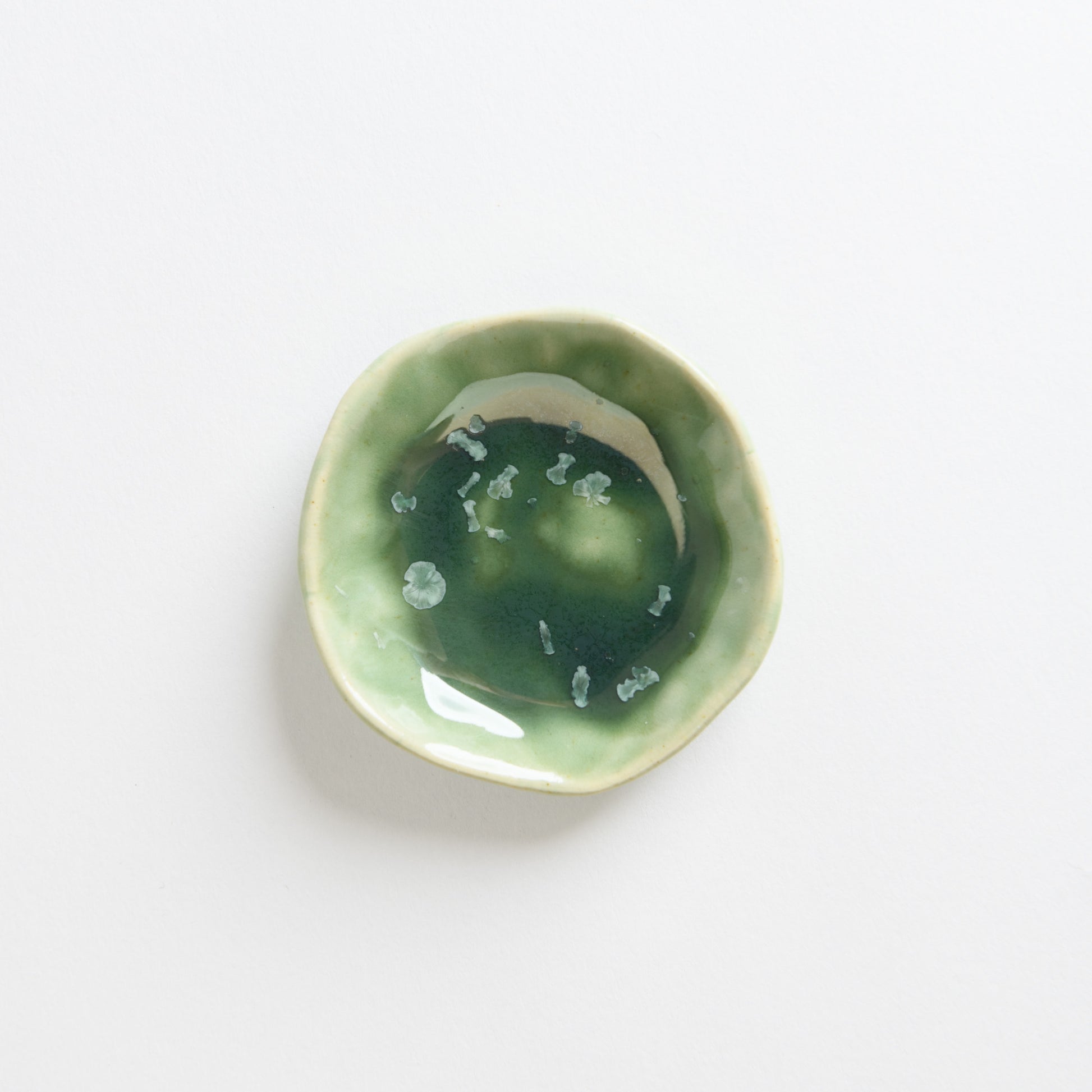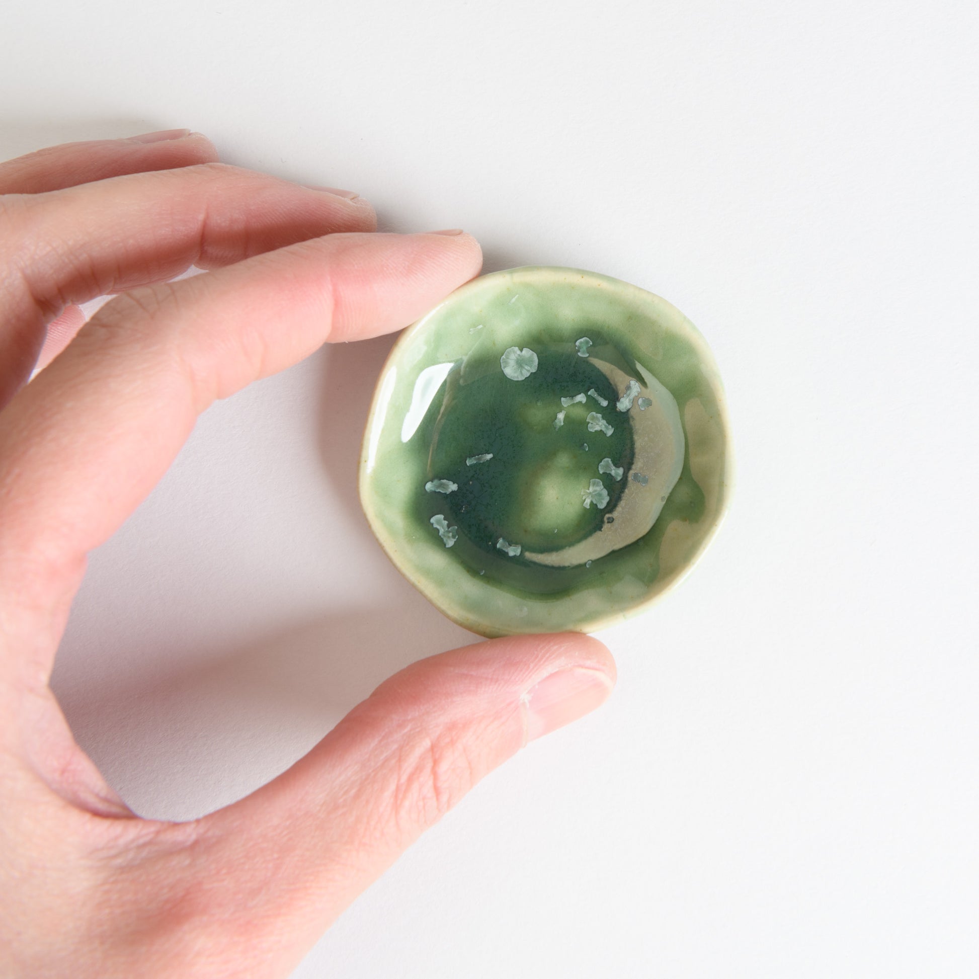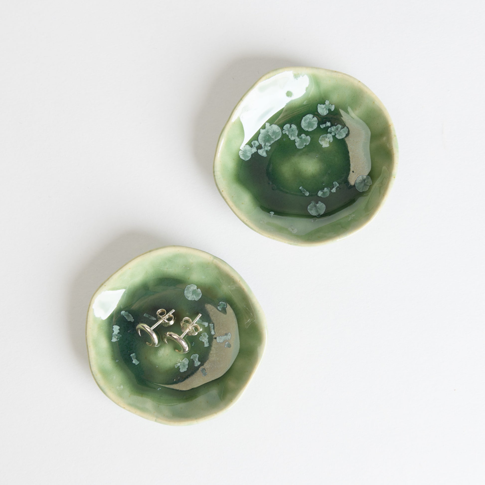Glazed with a beautiful crystalline glaze, each ring dish has a unique pattern of crystals over a dark green background. No two are ever the same!