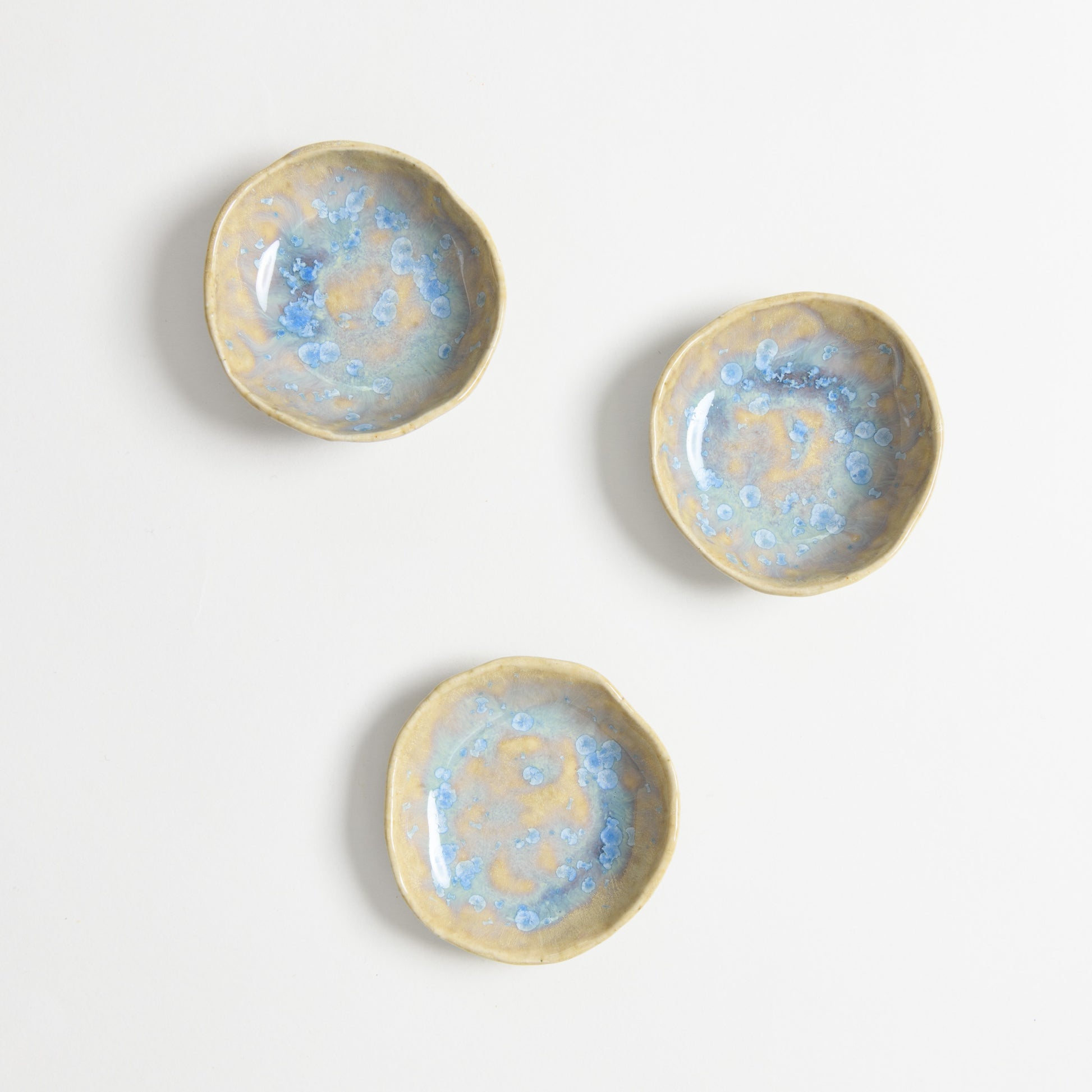 Glazed with a beautiful crystalline glaze, each ring dish has a unique pattern of baby blue crystals over a multi-tonal purple, blue and cream background. No two are ever the same!