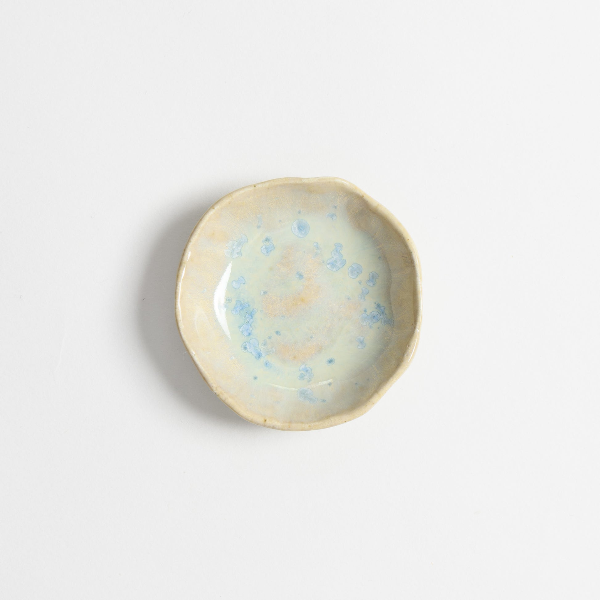 Glazed with a beautiful crystalline glaze, each ring dish has a unique pattern of baby blue crystals over a multi-tonal green, blue and cream background. No two are ever the same!