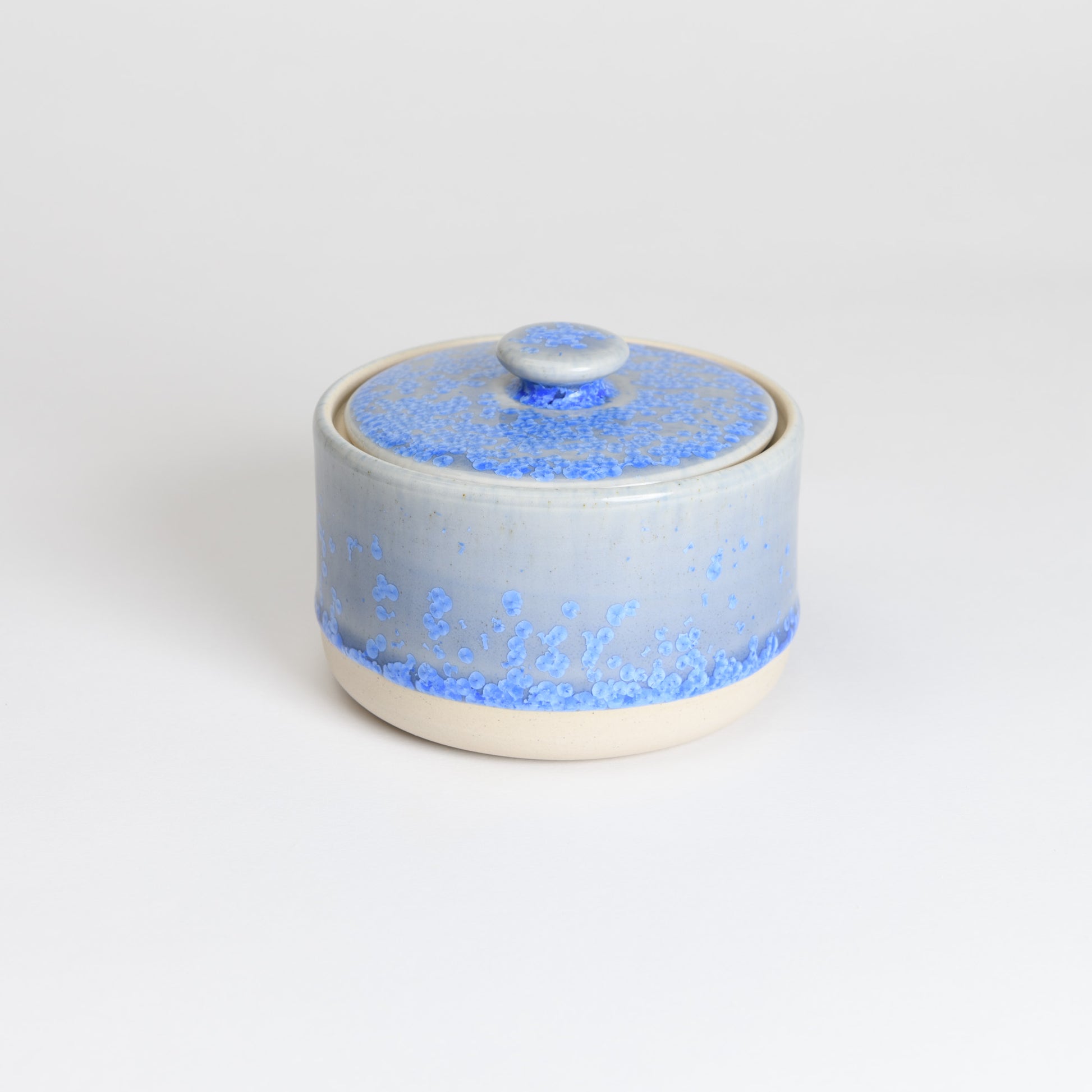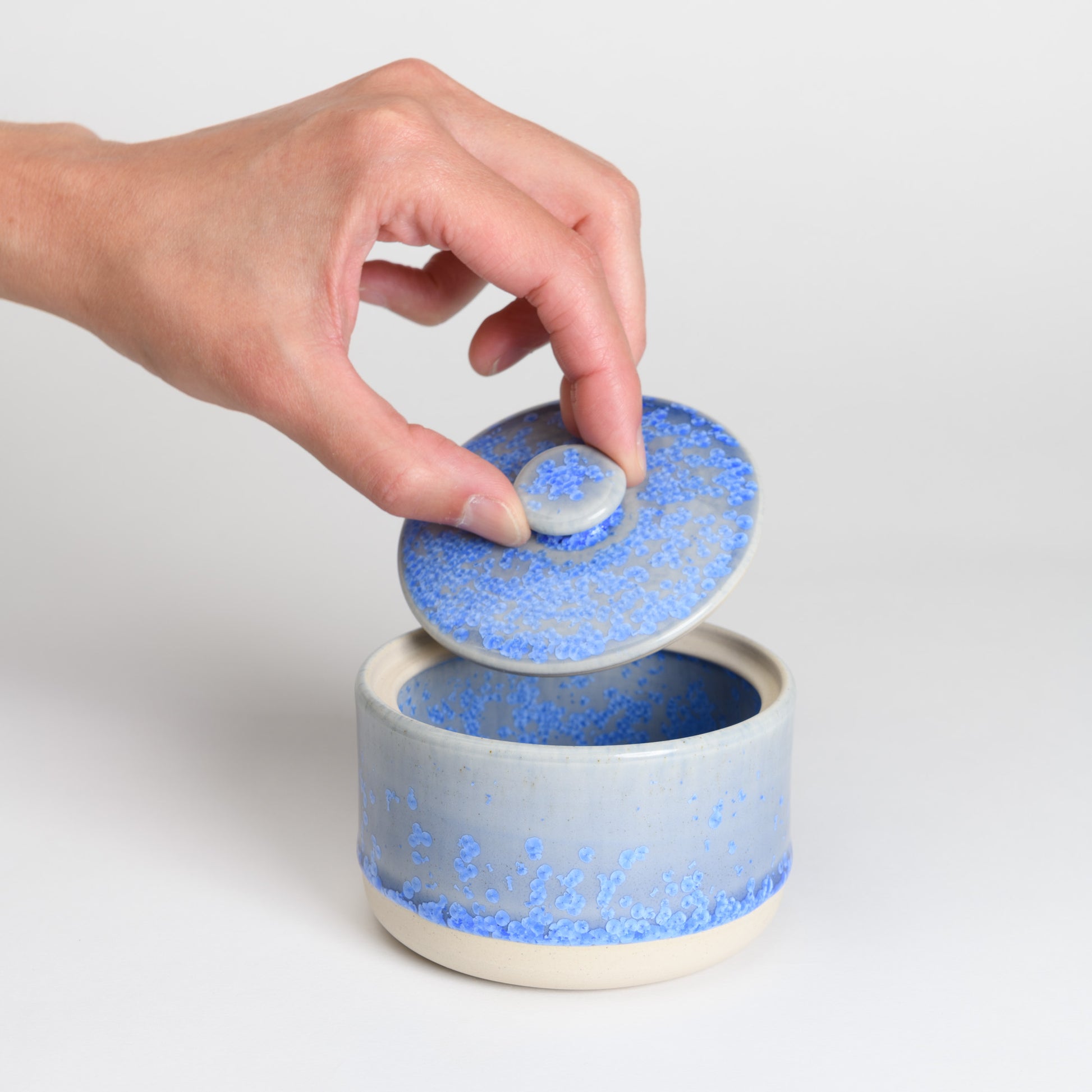 Glazed with a beautiful crystalline glaze, each lidded container has a unique pattern of crystals over a blue background. No two are ever the same!