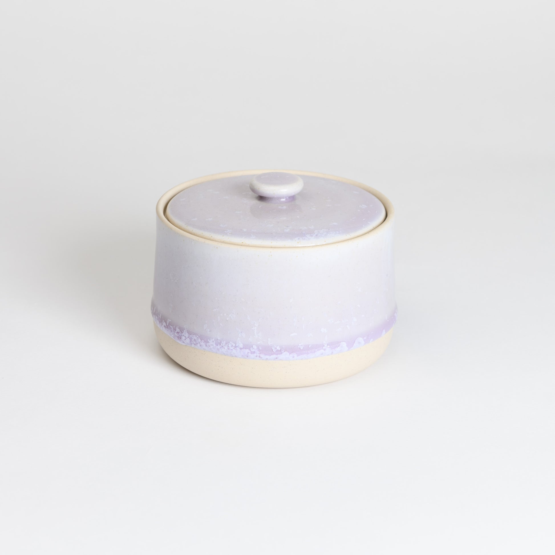 Glazed with a beautiful crystalline glaze, each lidded container has a unique pattern of crystals over a lilac background. No two are ever the same!