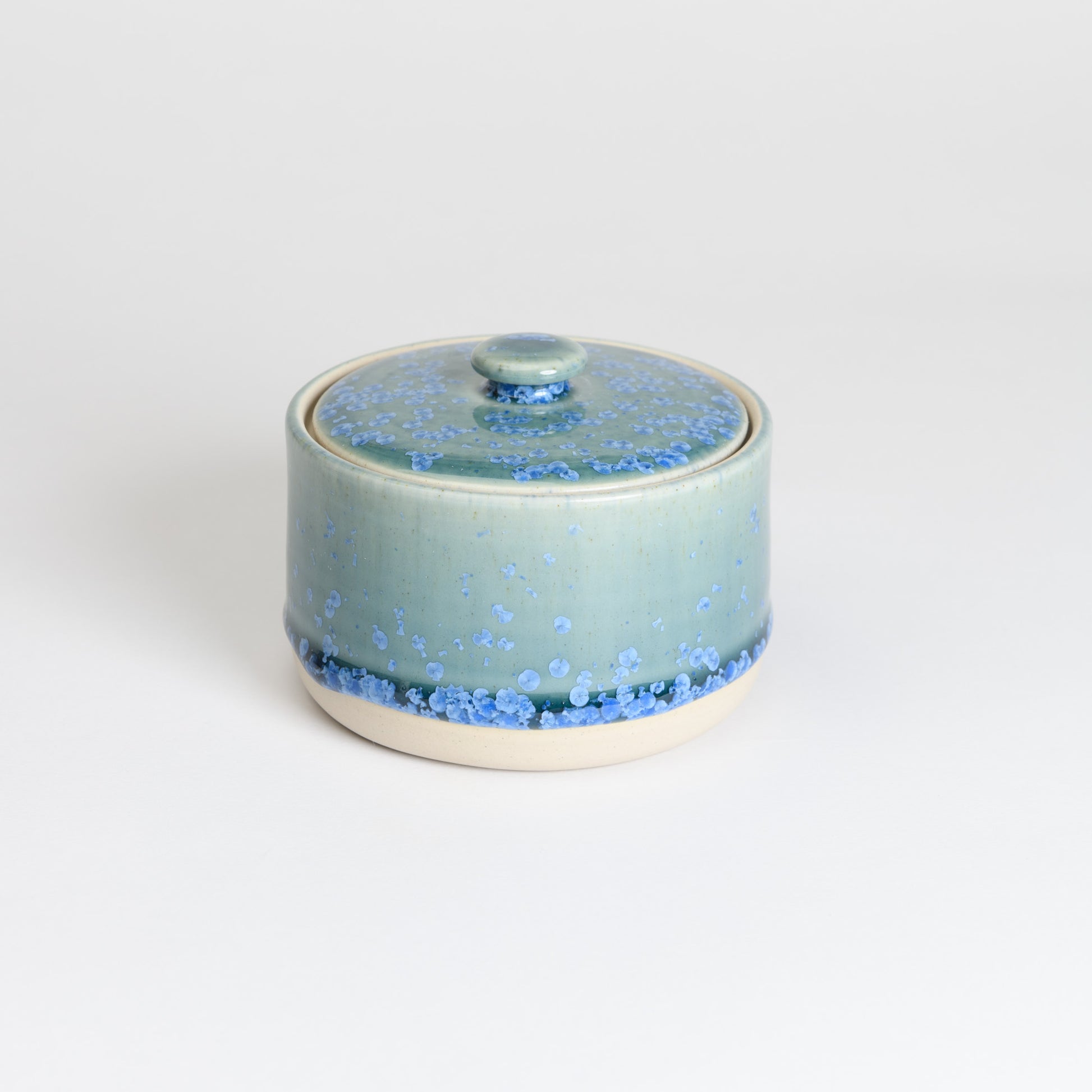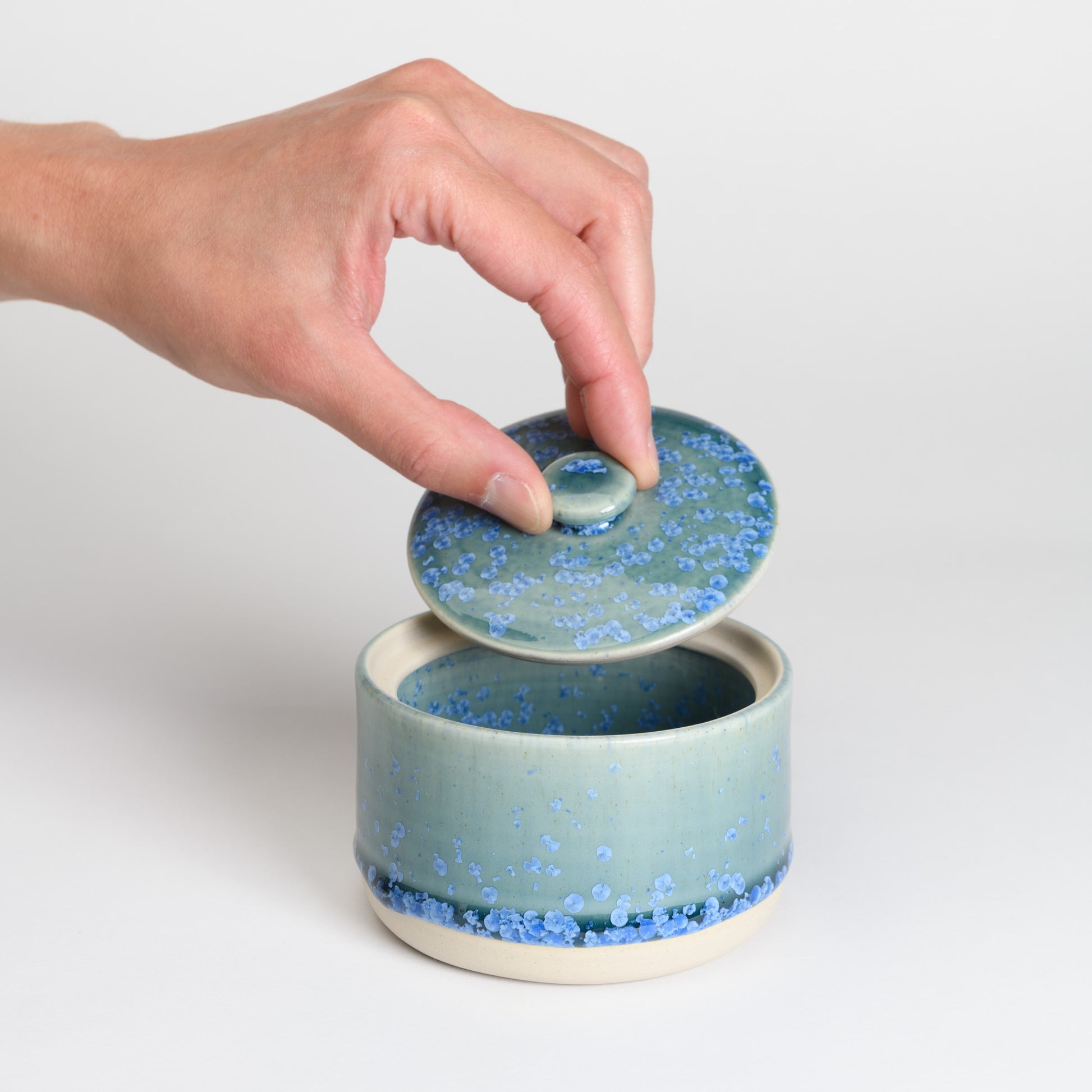 Glazed with a beautiful crystalline glaze, each lidded container has a unique pattern of blue crystals over an teal background. No two are ever the same!