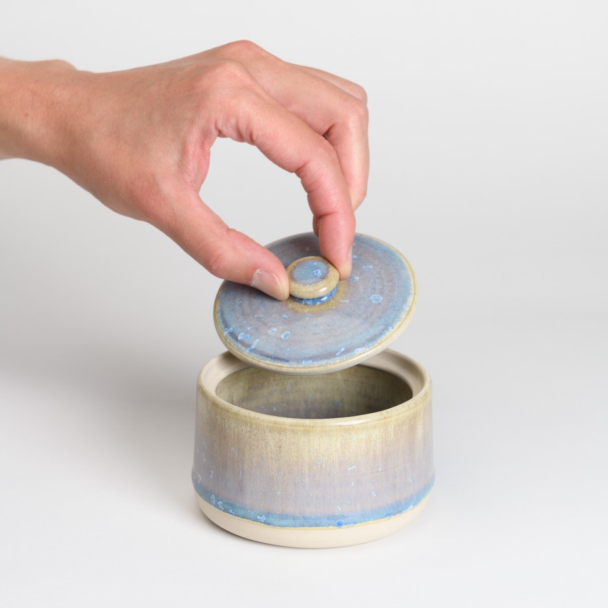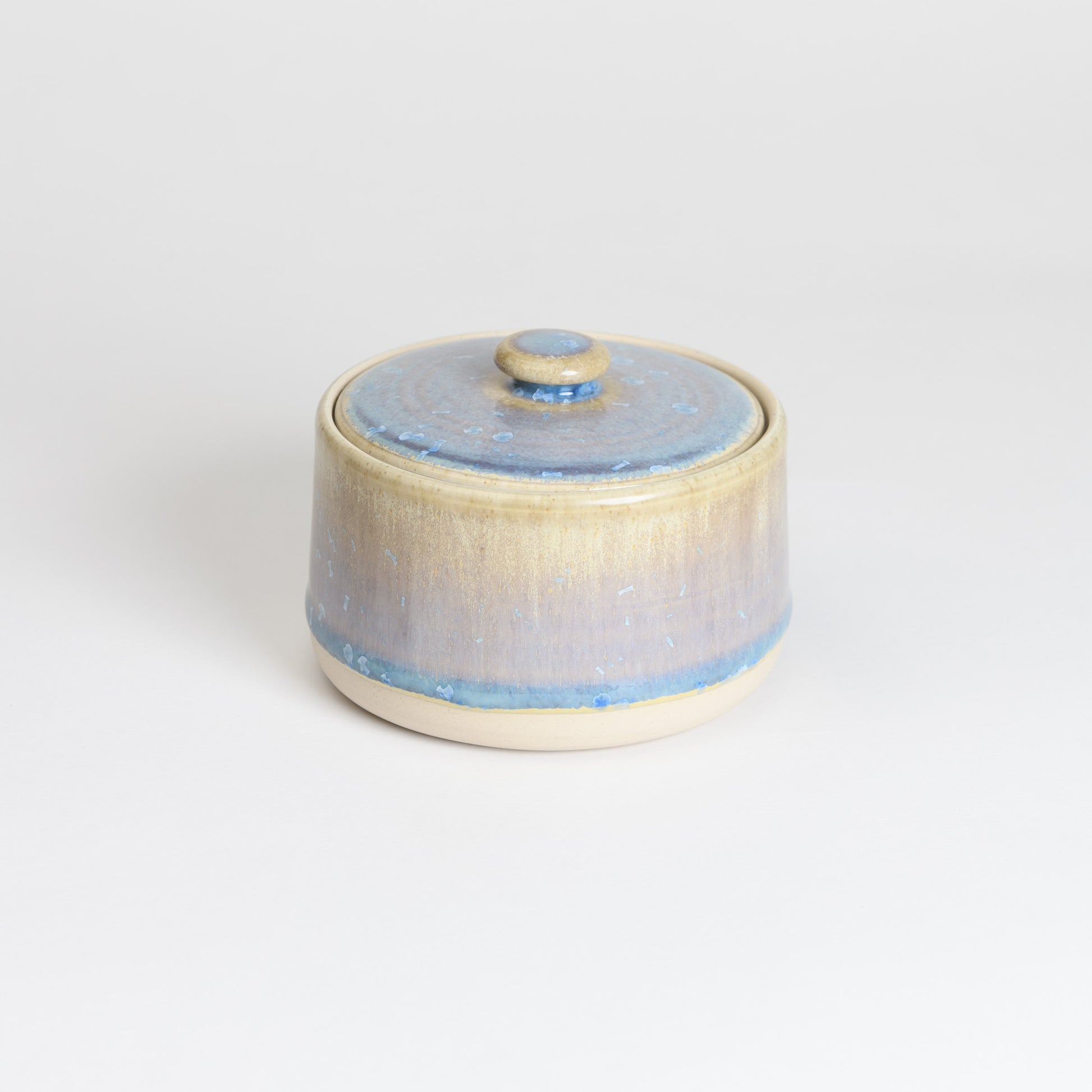 Glazed with a beautiful crystalline glaze, each lidded container has a unique pattern of baby blue crystals over a multi-colour background. No two are ever the same!