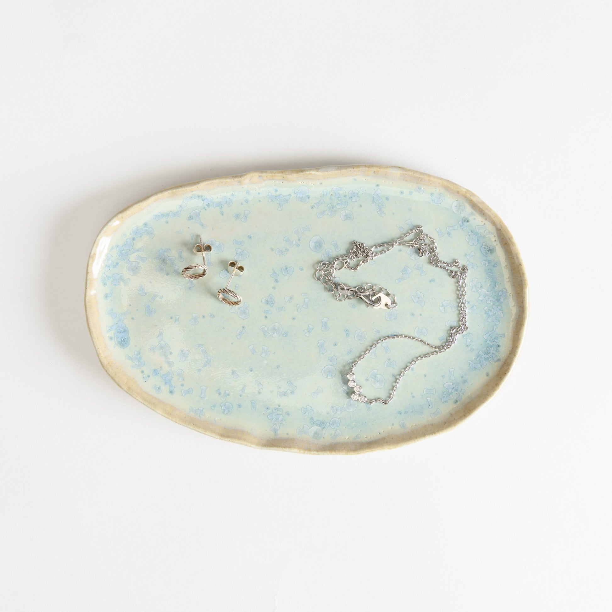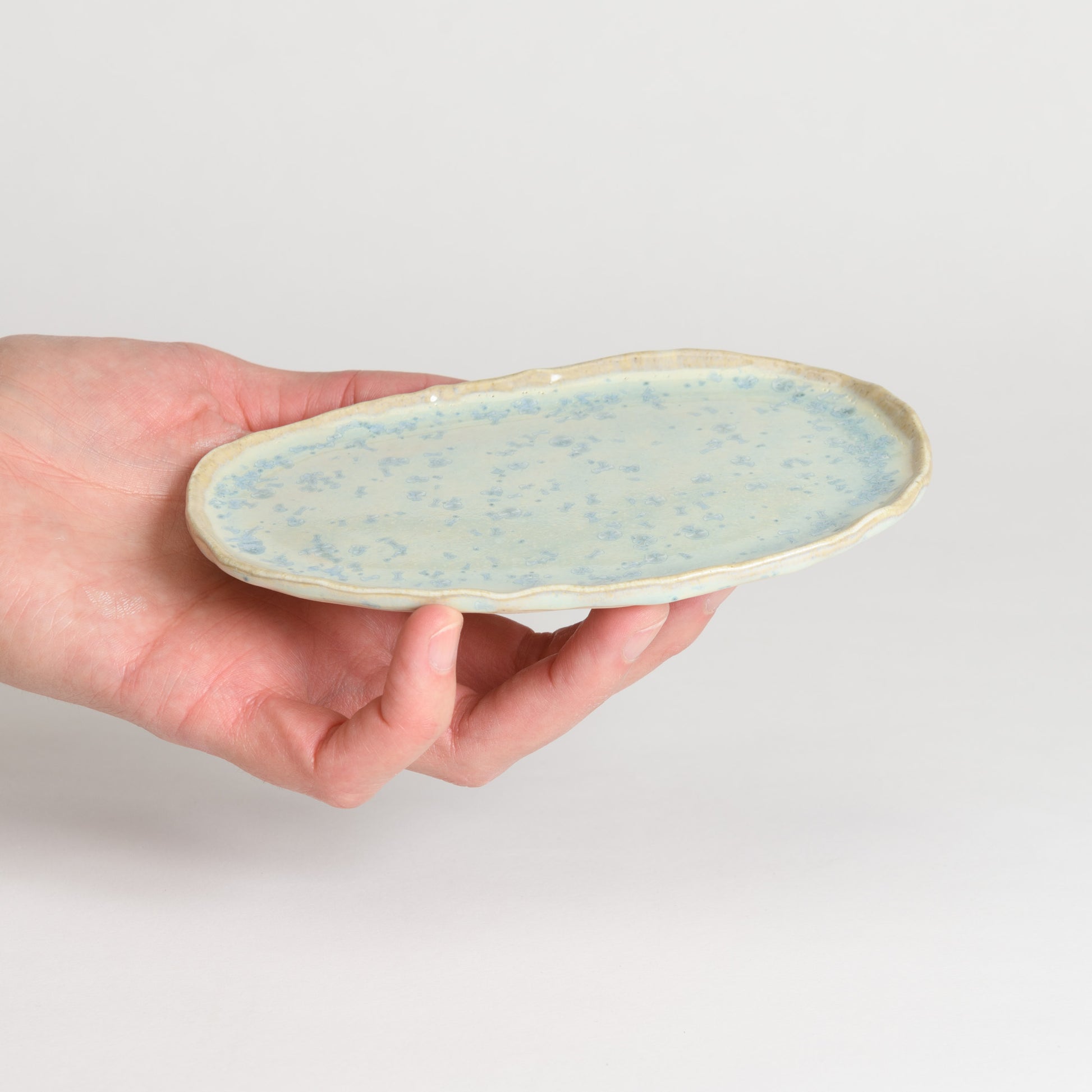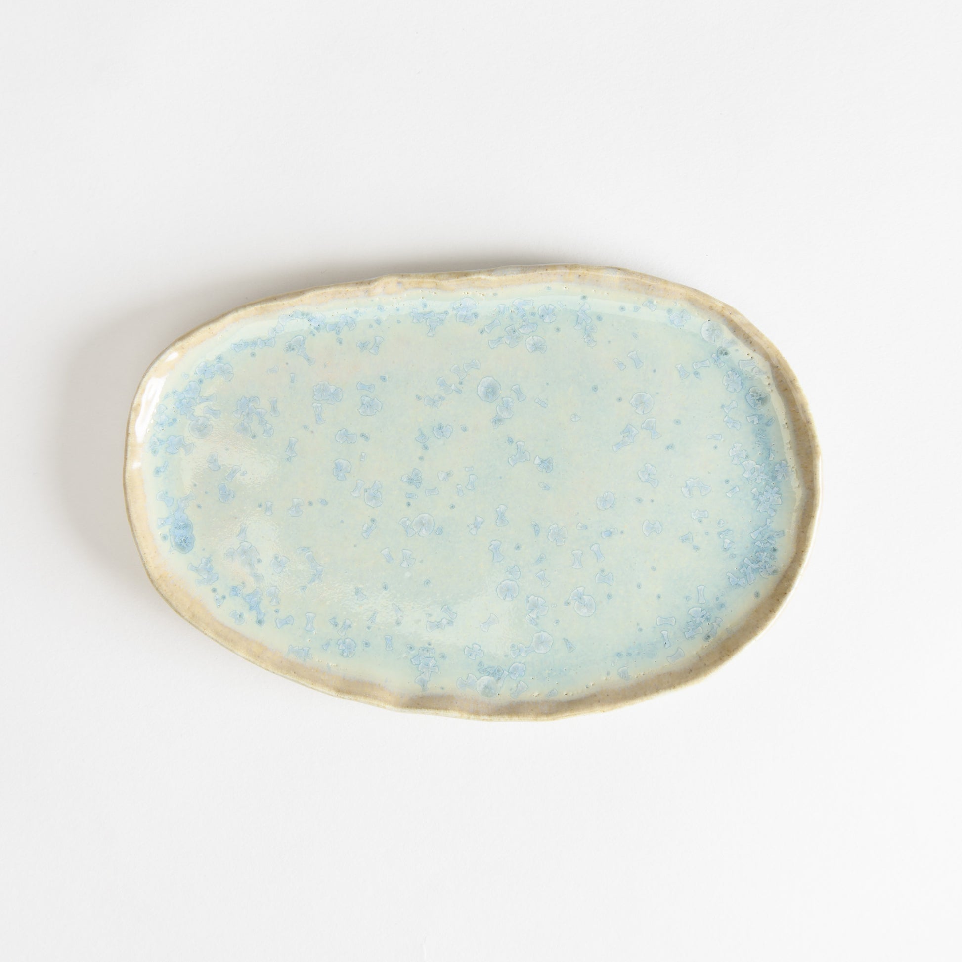 Glazed with a beautiful crystalline glaze, each tray has a unique pattern of baby blue crystals over a multi-tonal green, blue and cream background. No two are ever the same!