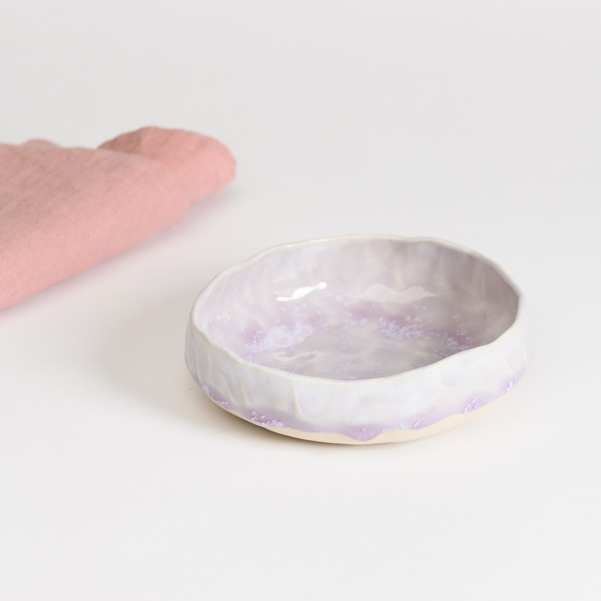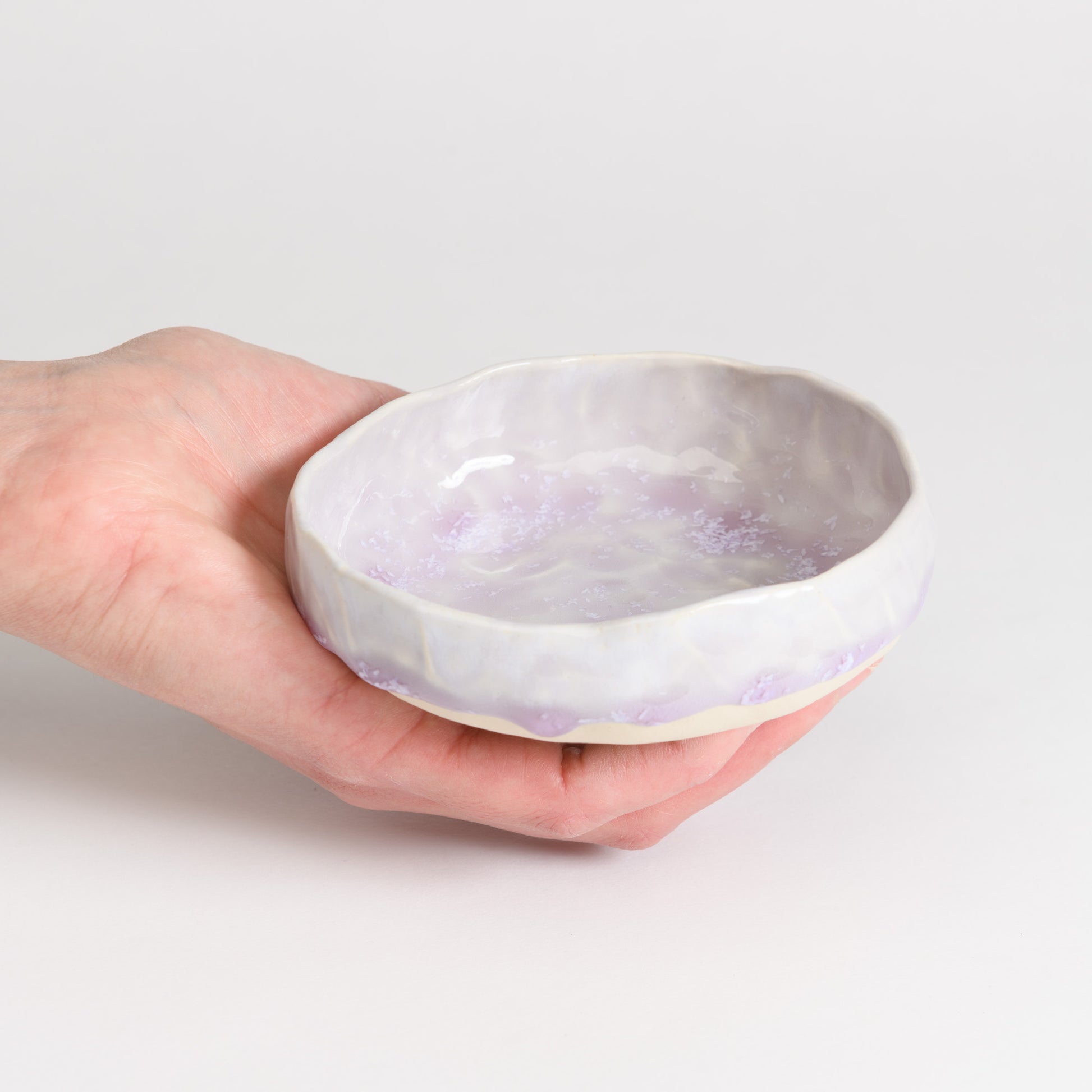 Each bowl is glazed with a beautiful crystalline finish, creating a unique pattern of crystals over a lilac background - no two are ever the same!