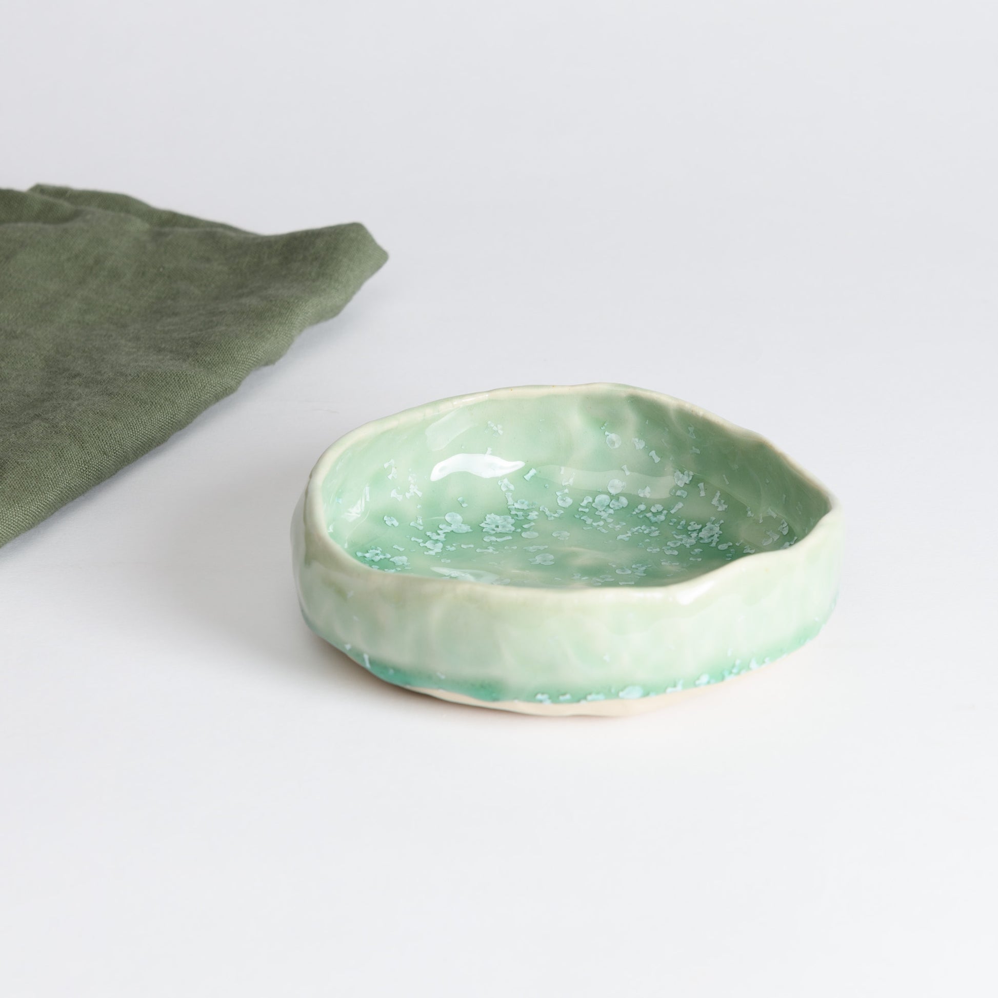 Each bowl is glazed with a beautiful crystalline finish, creating a unique pattern of crystals over a mintgreen background - no two are ever the same!