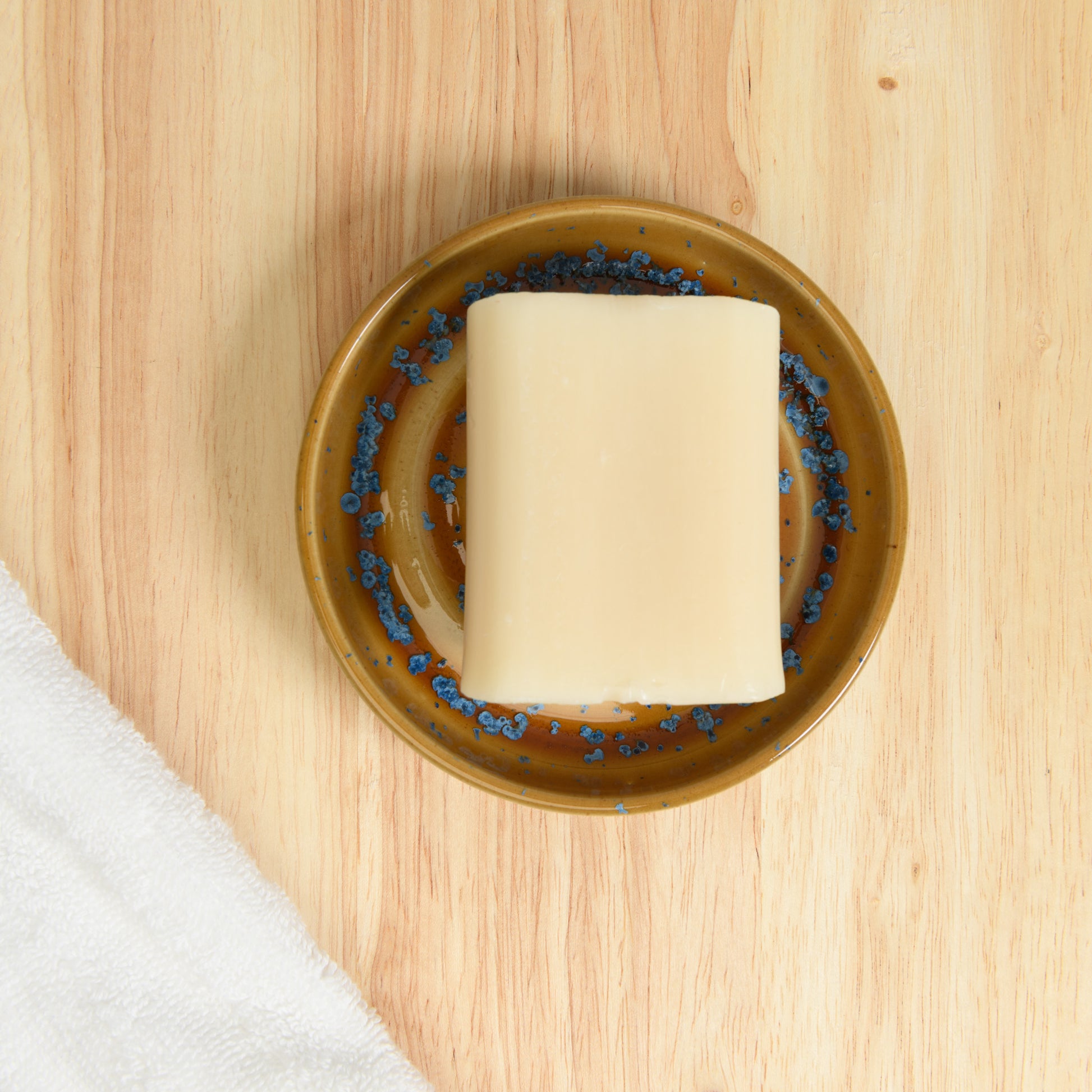 Handmade ceramic soap dish glazed with an amber glaze with beautiful blue crystals. The bottom is sanded to a silky smooth finish.