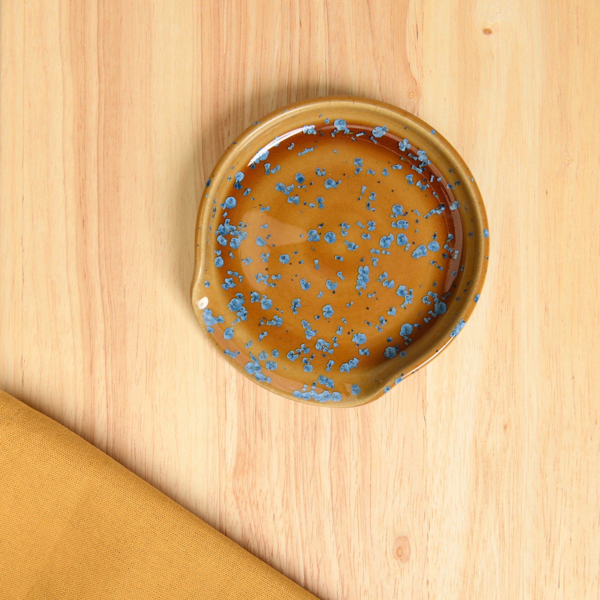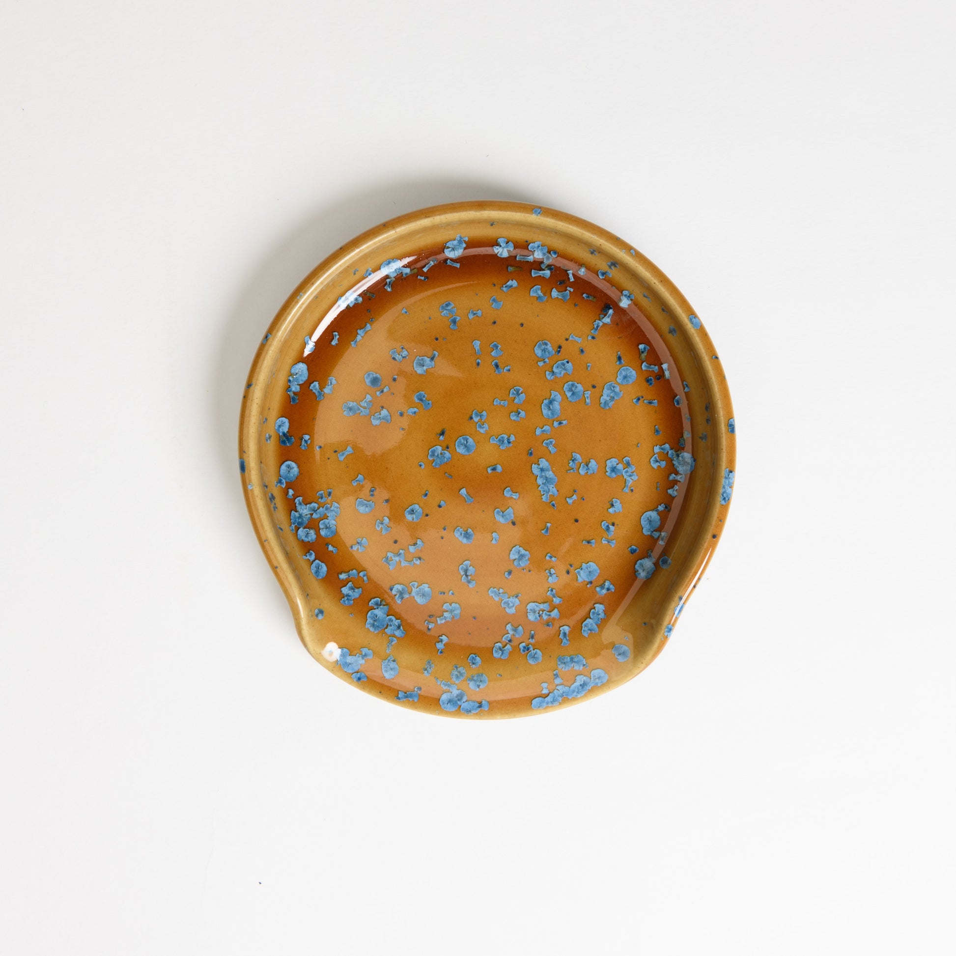Glazed with a beautiful crystalline glaze, each spoon rest has a unique pattern of blue crystals over an amber background. No two are ever the same!