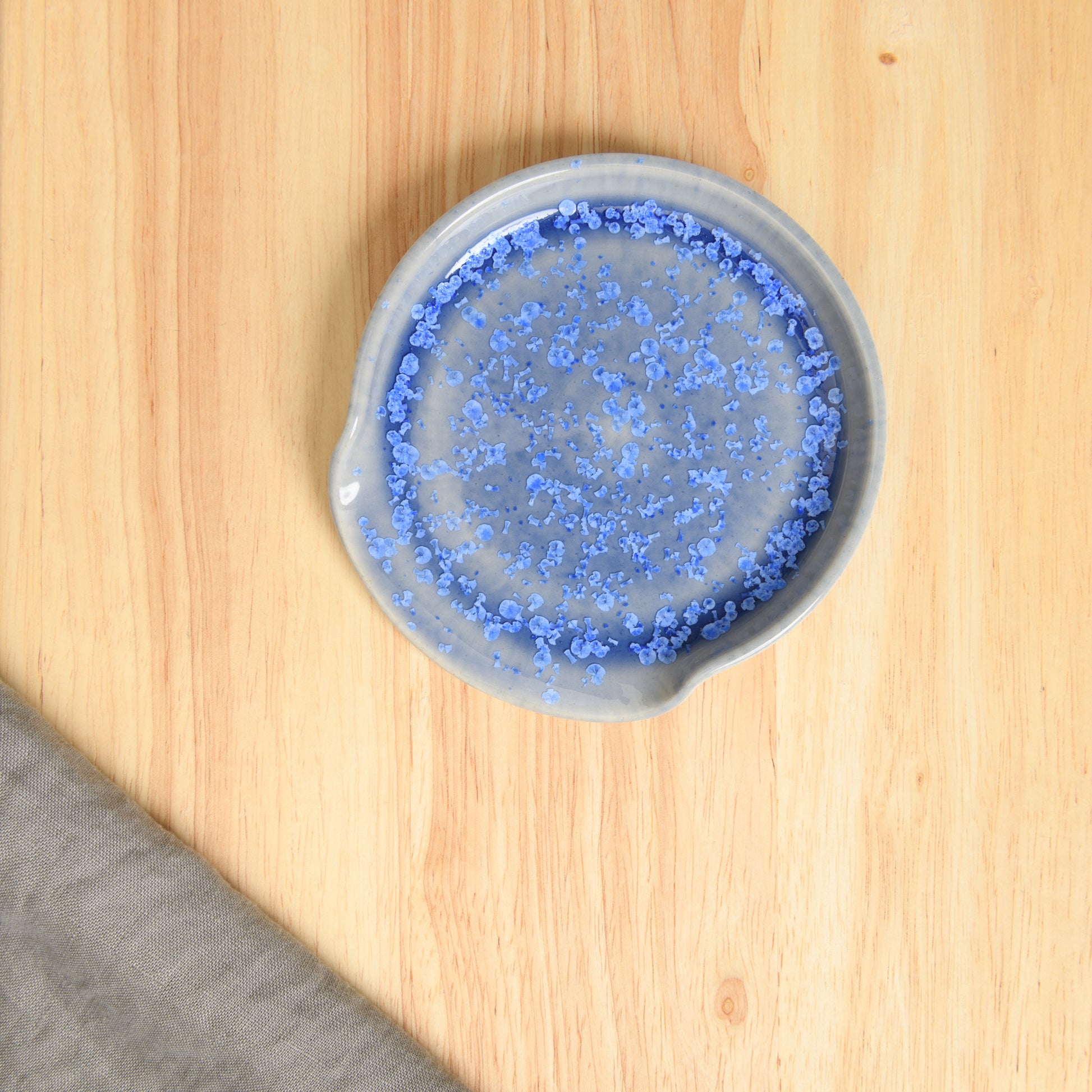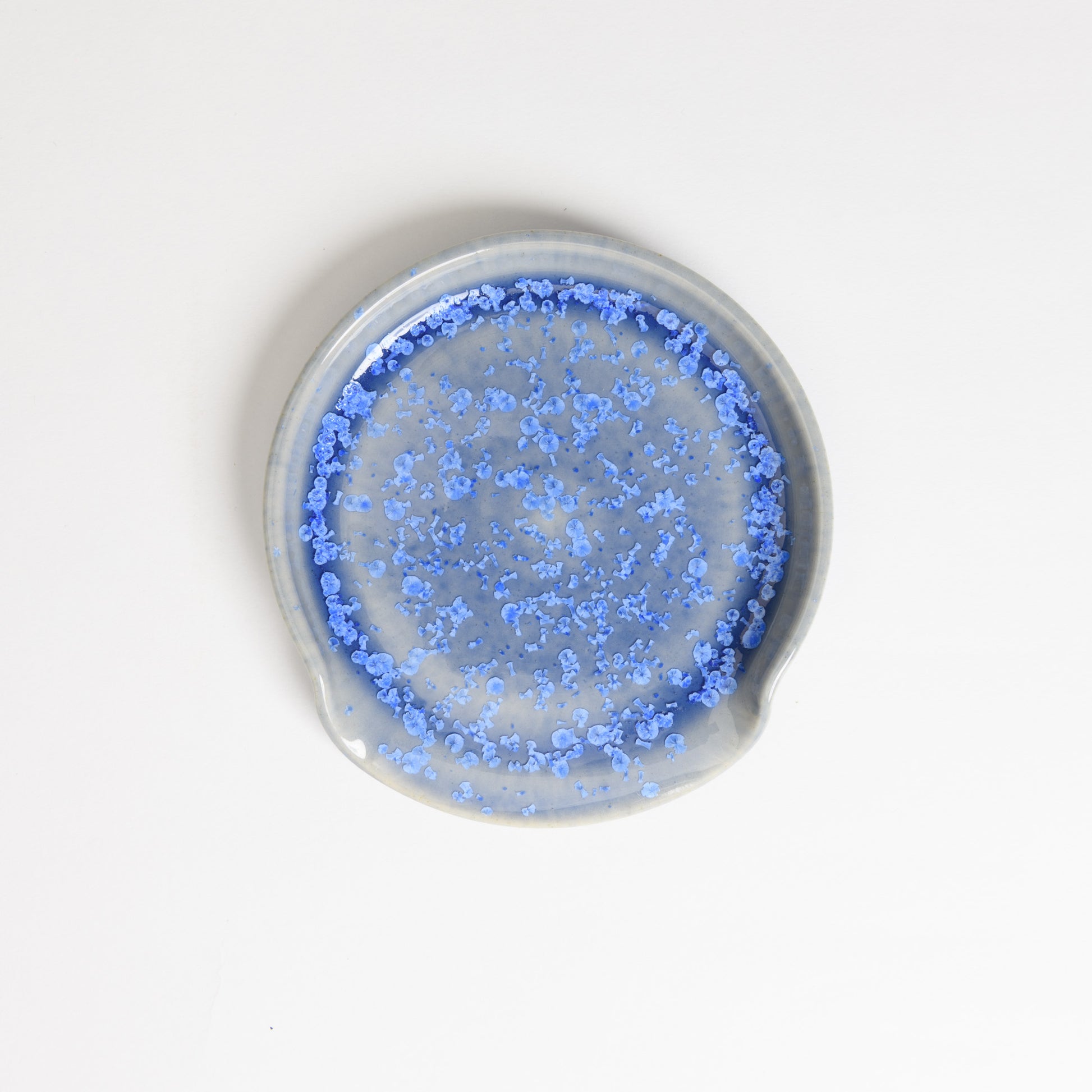 Glazed with a beautiful crystalline glaze, each spoon rest has a unique pattern of crystals over a blue background. No two are ever the same!
