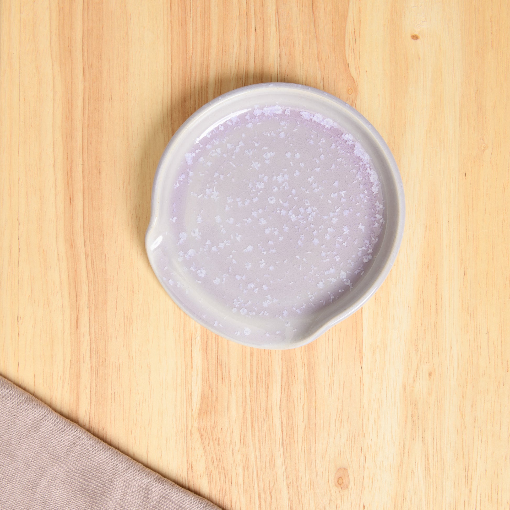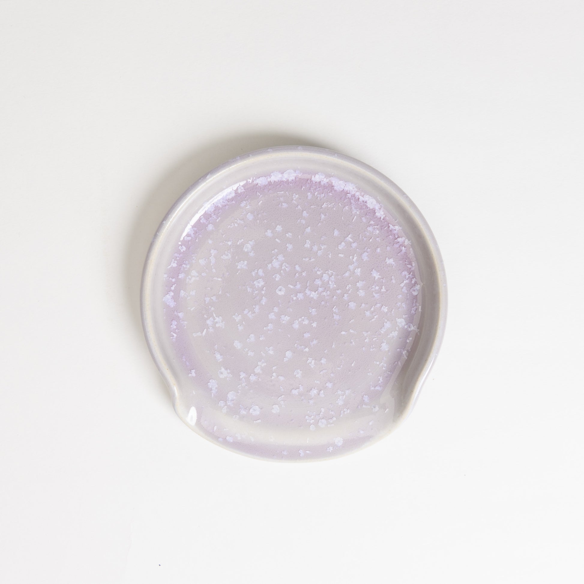 Glazed with a beautiful crystalline glaze, each spoon rest has a unique pattern of crystals over a lilac background. No two are ever the same!