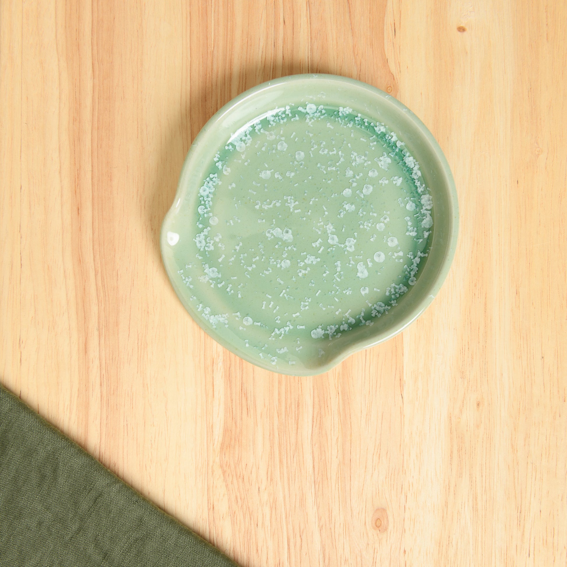 Glazed with a beautiful crystalline glaze, each spoon rest has a unique pattern of crystals over a mint green background. No two are ever the same!