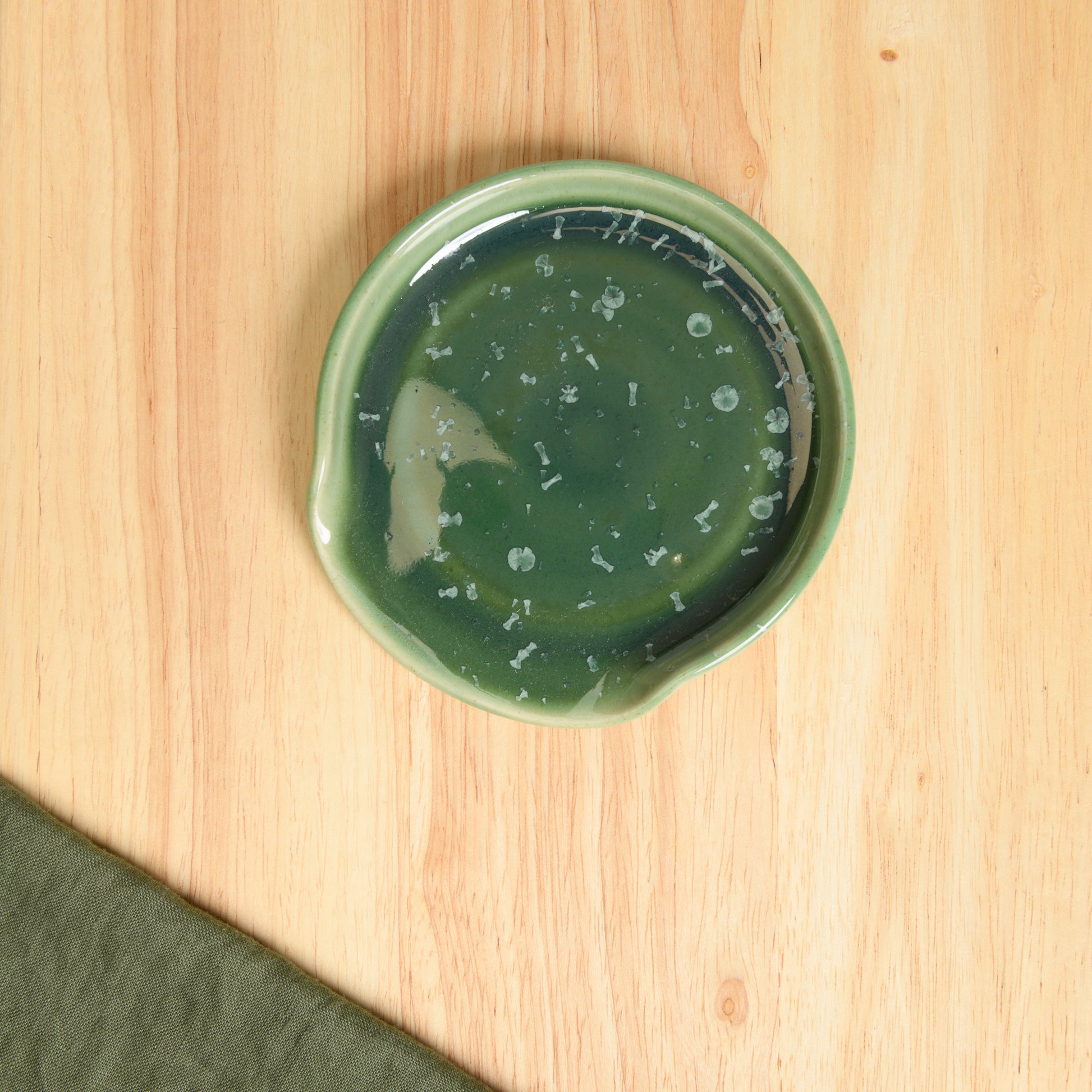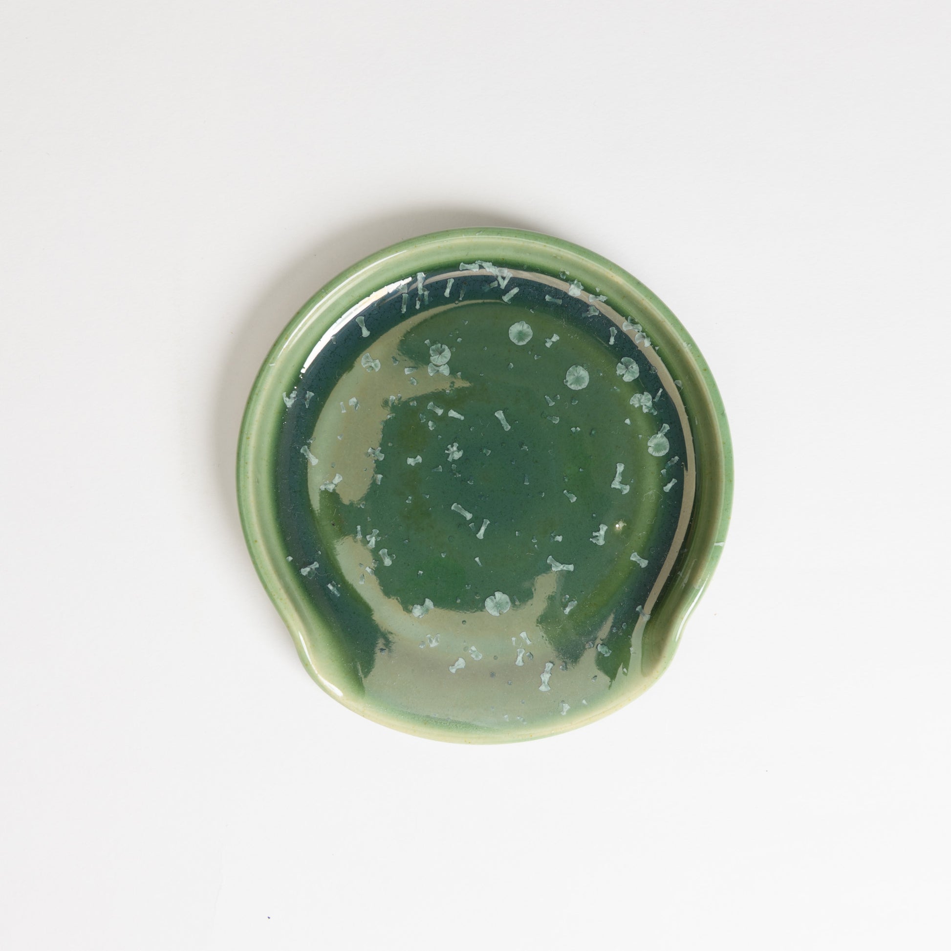 Glazed with a beautiful crystalline glaze, each spoon rest has a unique pattern of crystals over a dark green background. No two are ever the same!