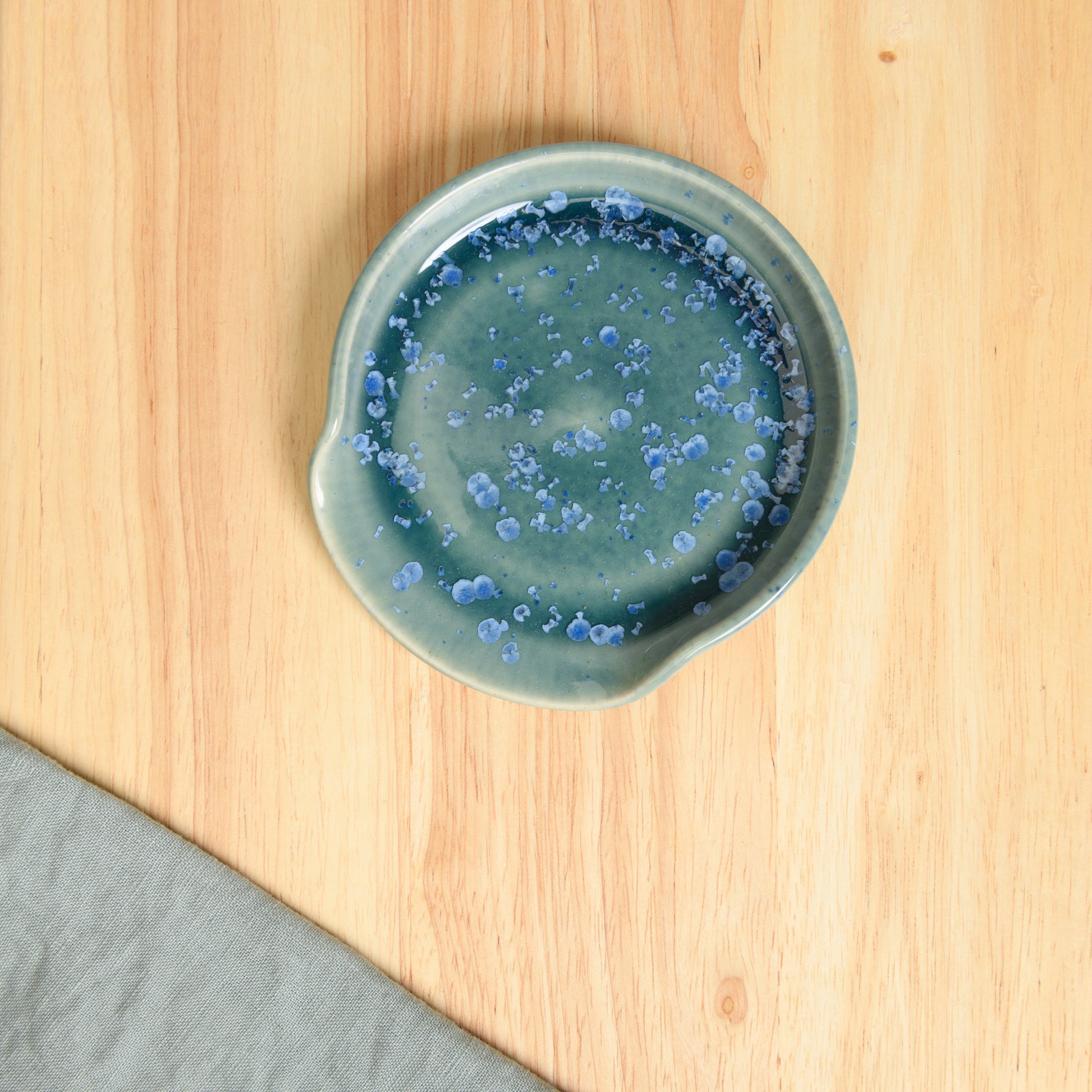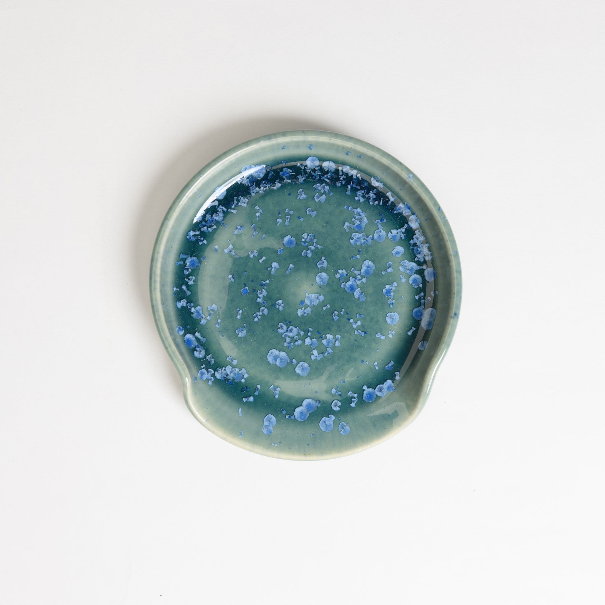 Glazed with a beautiful crystalline glaze, each spoon rest has a unique pattern of blue crystals over a teal background. No two are ever the same!