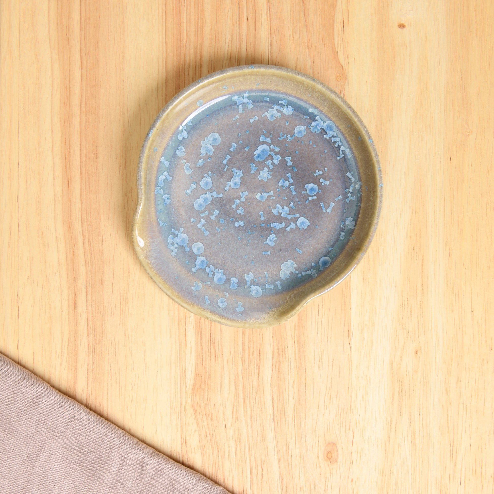 Glazed with a beautiful crystalline glaze, each spoon rest has a unique pattern of baby blue crystals over a multi-tonal purple, blue and cream background. No two are ever the same!