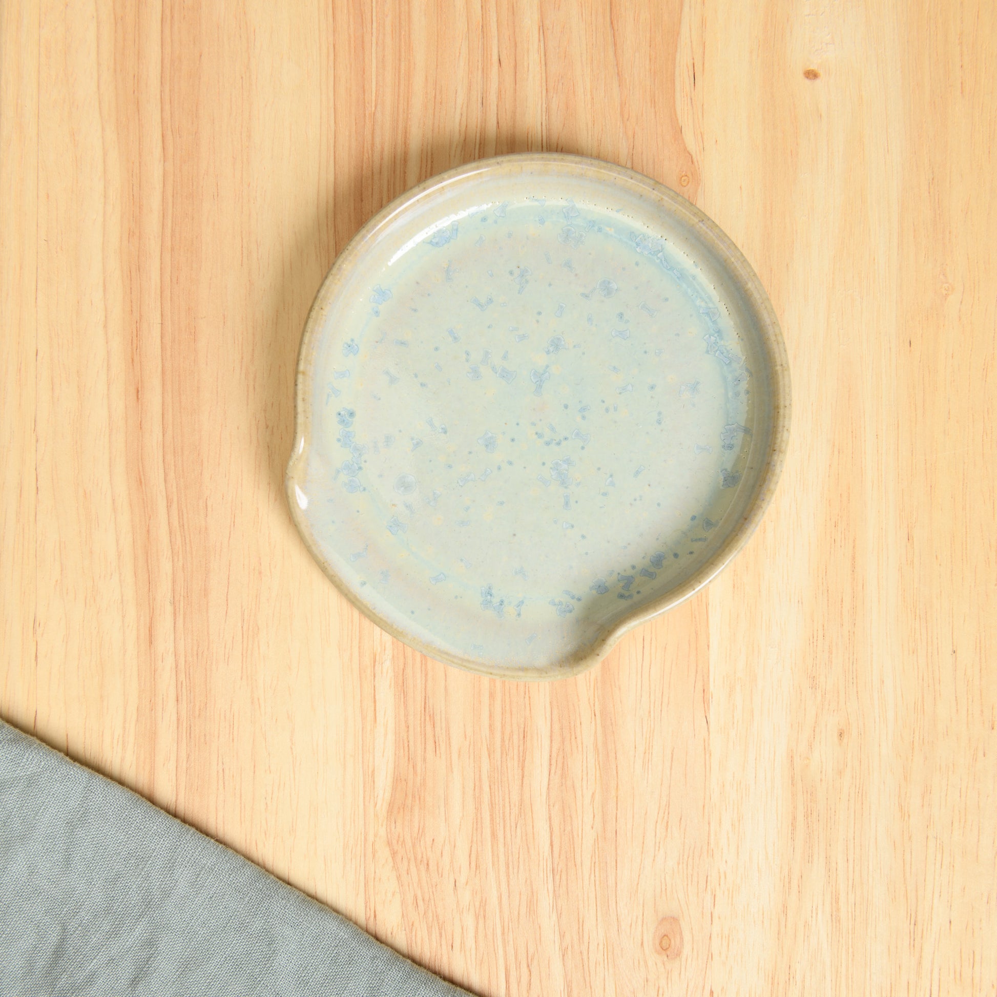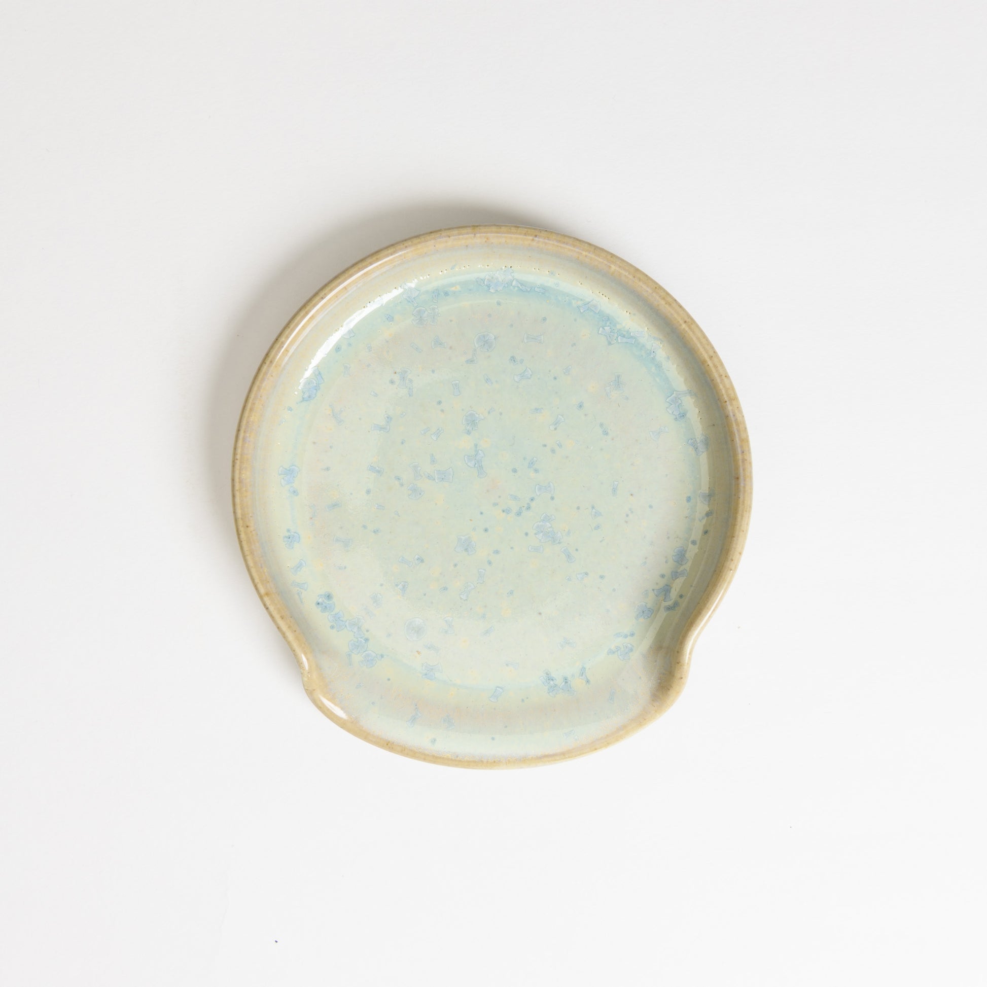Glazed with a beautiful crystalline glaze, each spoon rest has a unique pattern of baby blue crystals over a multi-tonal green, blue and cream background. No two are ever the same!