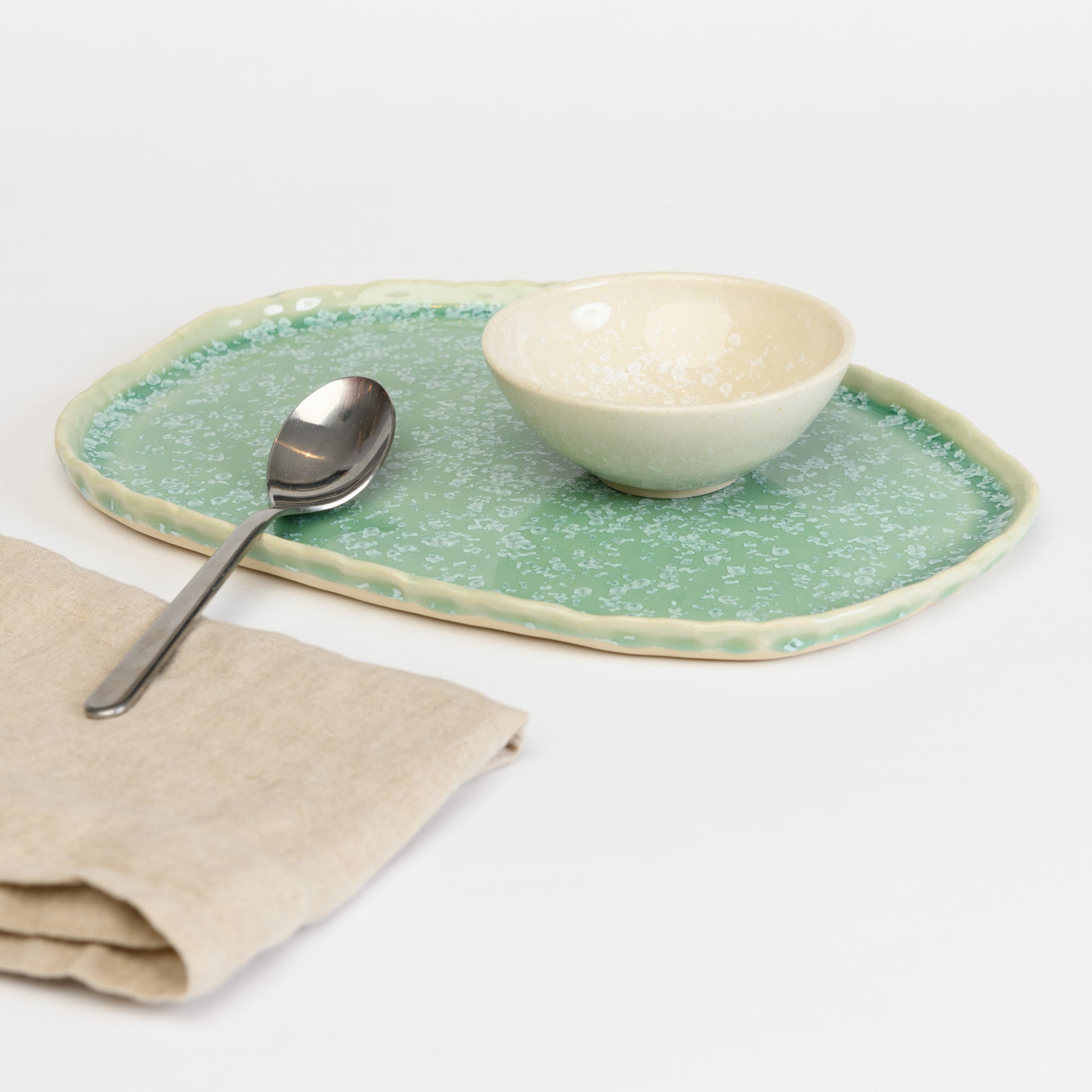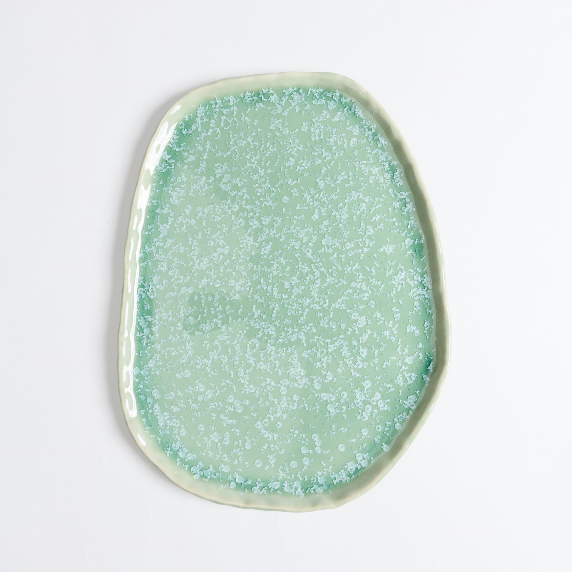 Each tray is glazed with a beautiful crystalline finish, creating a unique pattern of crystals over a mint green background - no two are ever the same!
