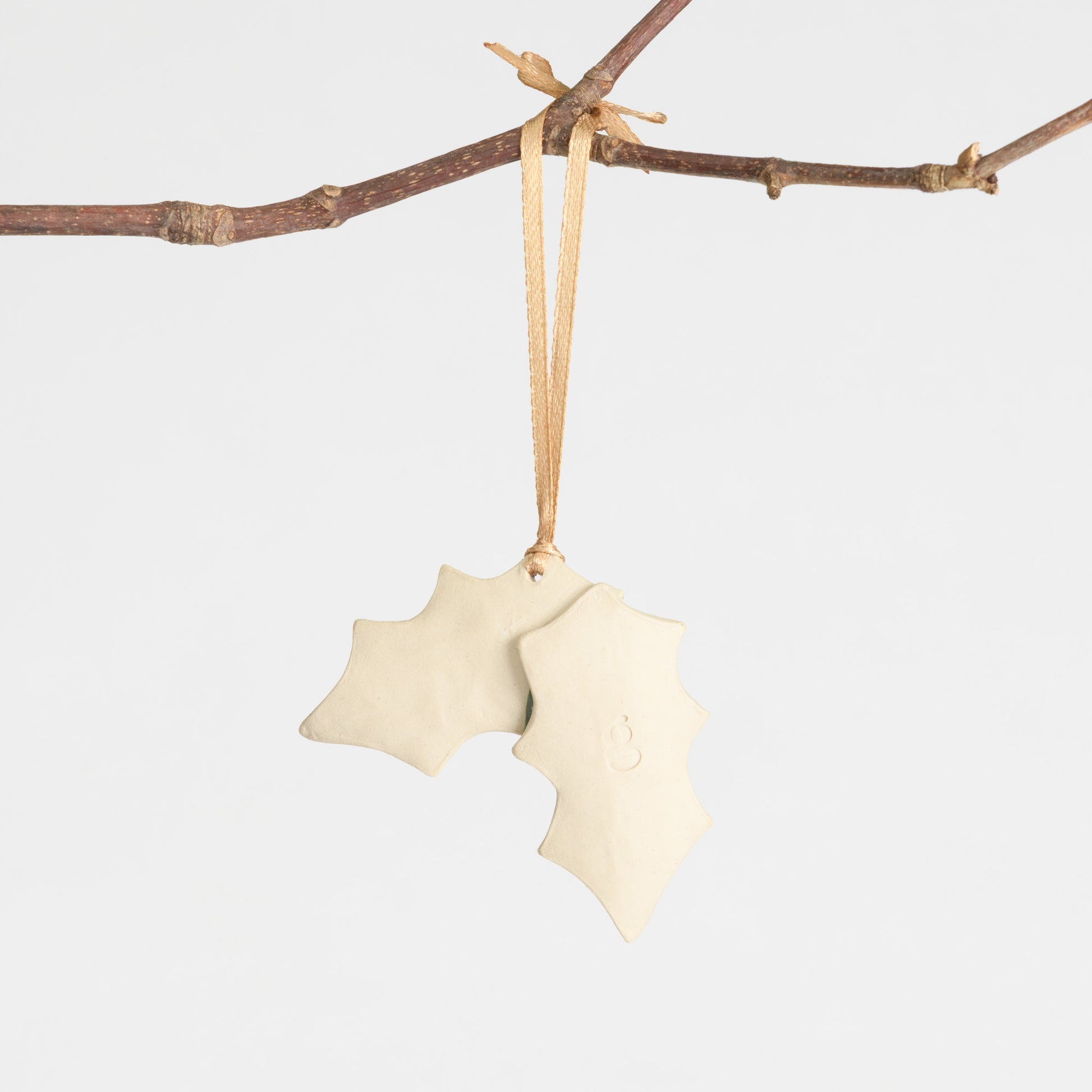 Handmade ornament with two holly leaves, three berries and a satin ribbon.