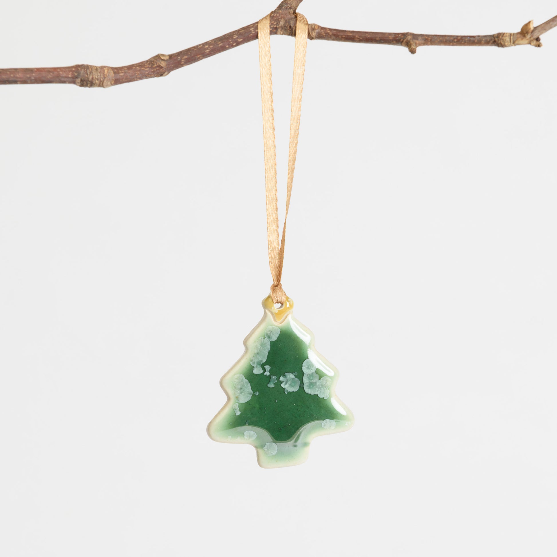 Glazed with a beautiful crystalline glaze, each ornament has a unique pattern of crystals over a green background. No two are ever the same!