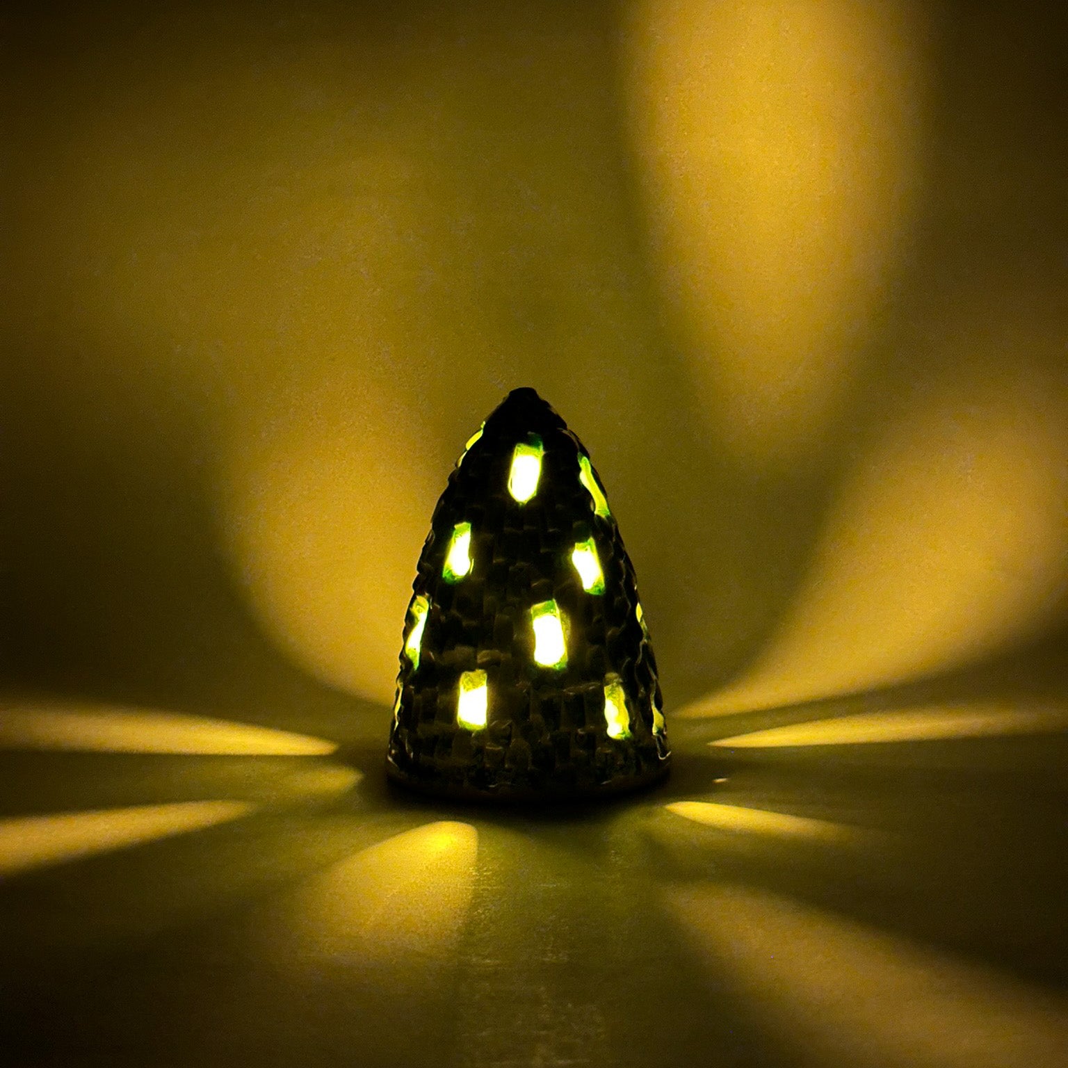 This Christmas tree is thrown on the wheel and carved by hand. With holes to let light through.