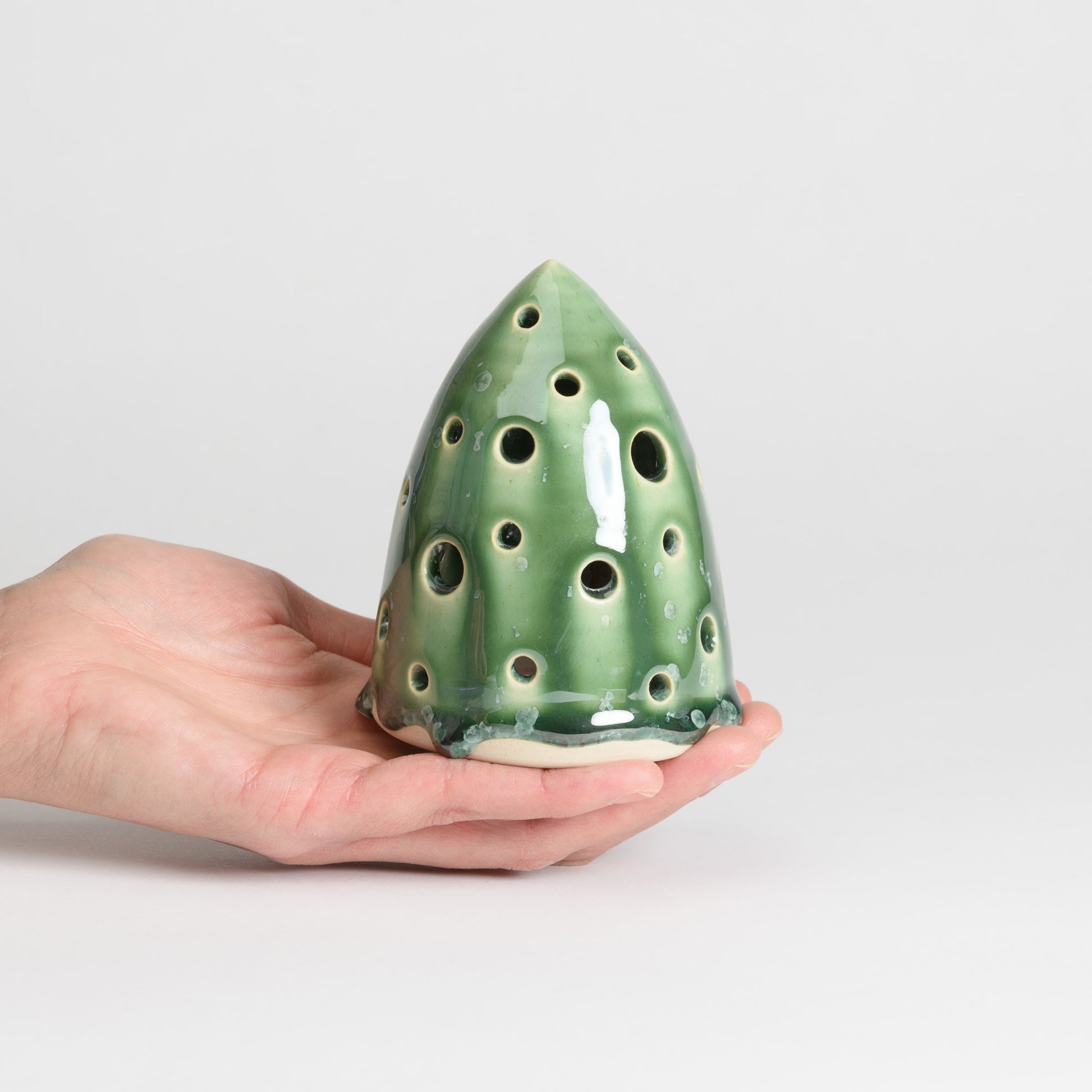 This Christmas tree is thrown on the wheel and carved by hand. With holes to let light through.